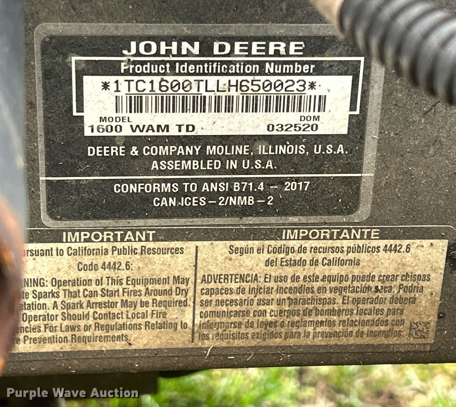 John Deere 1600 Turbo Series III lawn mower. Hours: 1,387 on meter, Cutting width: 120", Serial: 1TC1600TLLH650023. Engine Yanmar, Cylinders: 4, Fuel type: Diesel. Transmission Hydrostatic. Chassis Four wheel drive. Features Hydraulic fold decks, Hydraulic front deck lift. Tires Front: 26x12.00B12, Rear: 18x9.50-8. Scott County Conservation. 19251 290th Street. Long Grove, IA 52756