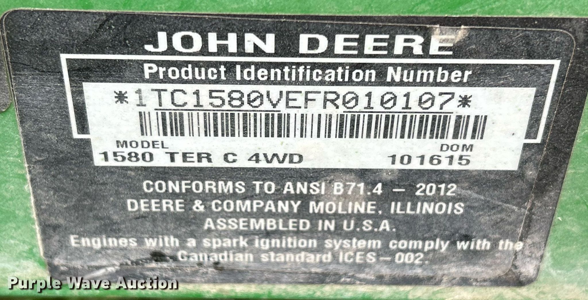 John Deere 1580 lawn mower. Hours: 2,693 on meter, Cutting width: 72", Serial: 1TC1580VEFR010107. Engine Yanmar, Displacement: 1.642L, Cylinders: 3, Fuel type: Diesel. Transmission Hydrostatic. Chassis Four wheel drive. Features Mower deck Width: 72", John Deere, Hydraulic front deck lift, Flip up front deck. Tires Front: 26x12.00B12, Rear: 20x10.00-10. Notes Right rear tire sidewall tear. Scott County Conservation. 19251 290th Street. Long Grove, IA 52756