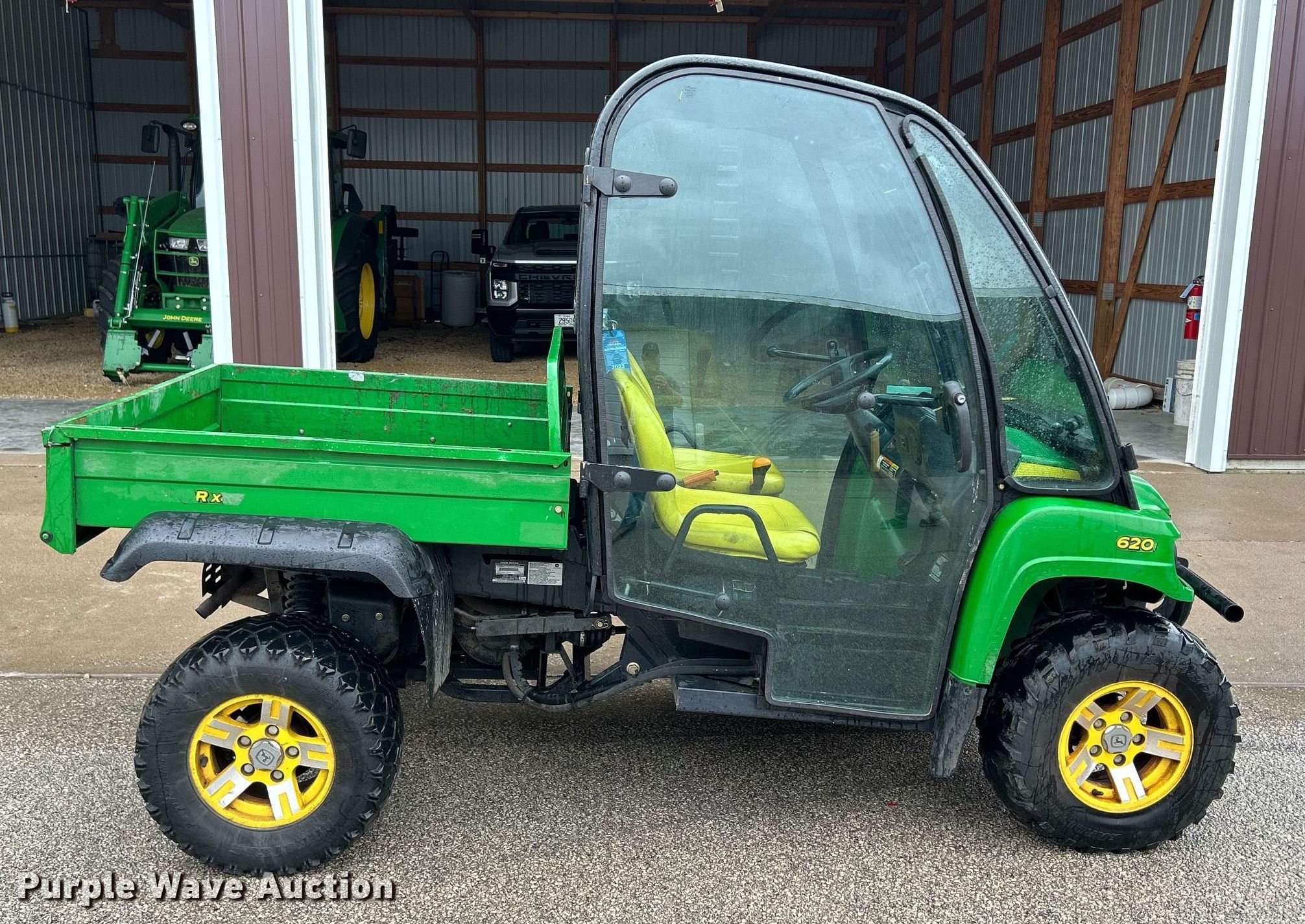 2009 John Deere Gator XUV 620i utility vehicle. Hours: 1,718 on meter, Hours: Unknown, Serial: M0XUVGX032698. Engine John Deere, Displacement: 617cc, Cylinders: 2, Fuel type: Gas, Electric start. Transmission CVT. Chassis Four wheel drive. Operators station Enclosed cab. Features Receiver hitch, Dump bed 42" L x 49" W, Dump bed type: Electric/ Hydraulic. Tires Front: 25x10-12, Rear: 25x10.50-12. Notes Hour meter has been replaced. Scott County Conservation. 19251 290th Street. Long Grove, IA 52756