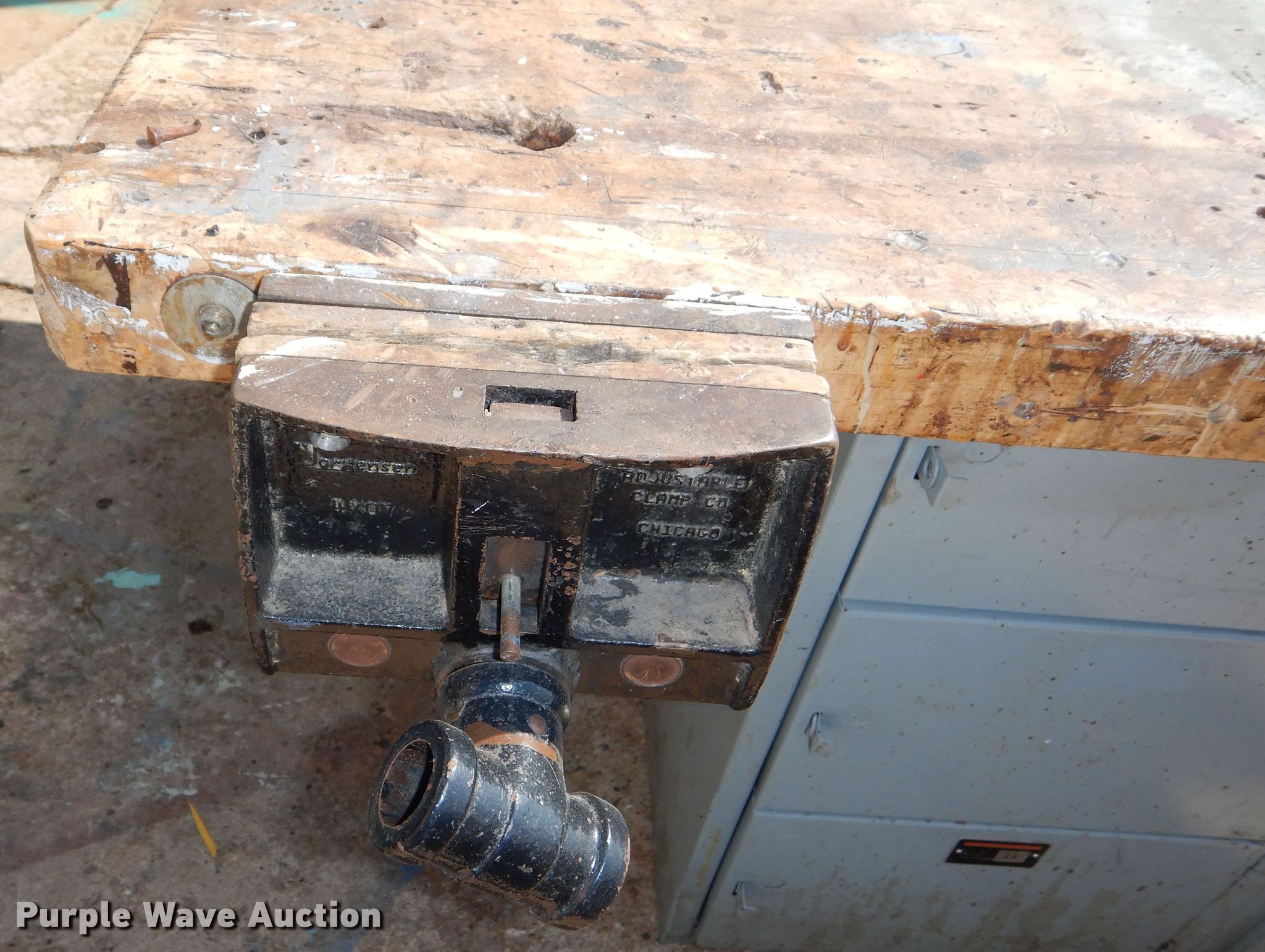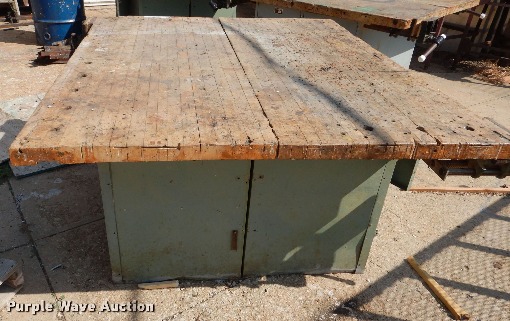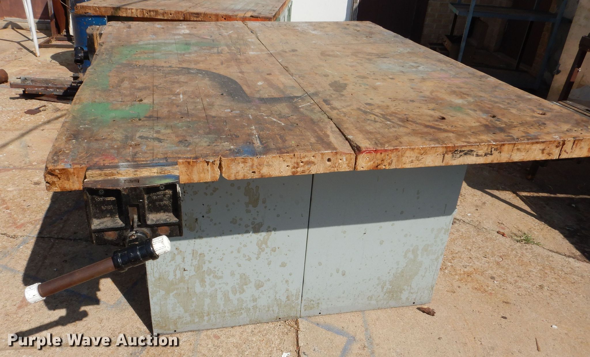 Purple Wave is selling a used Tools in Kansas. This item is a (3) shop tables with the following: 64" x 55" x 32", Vises