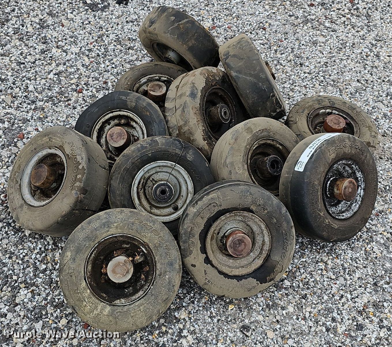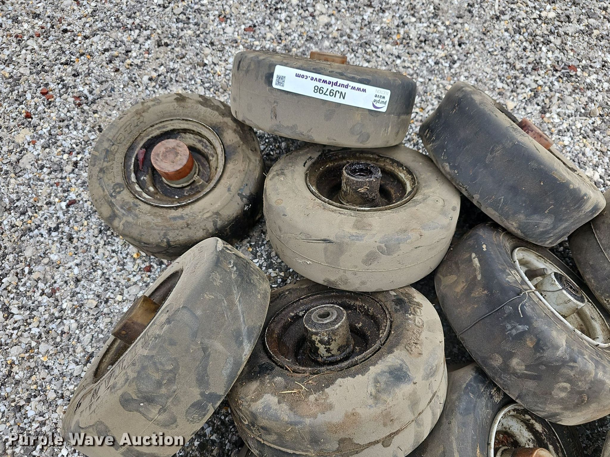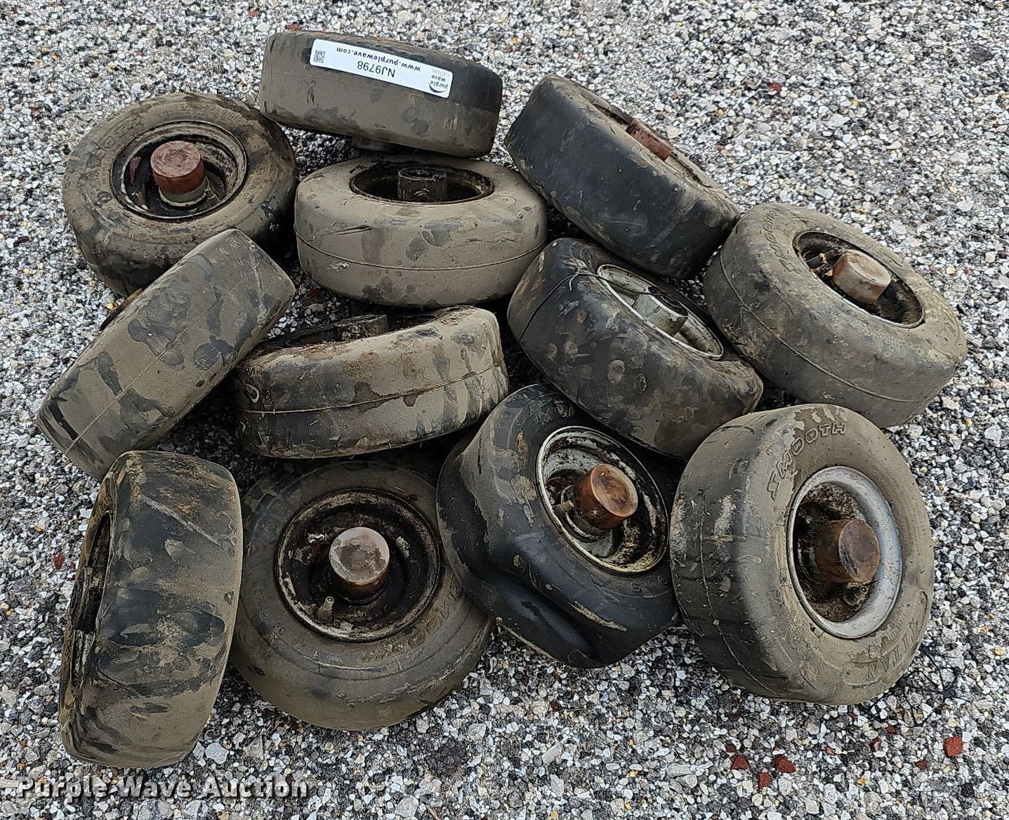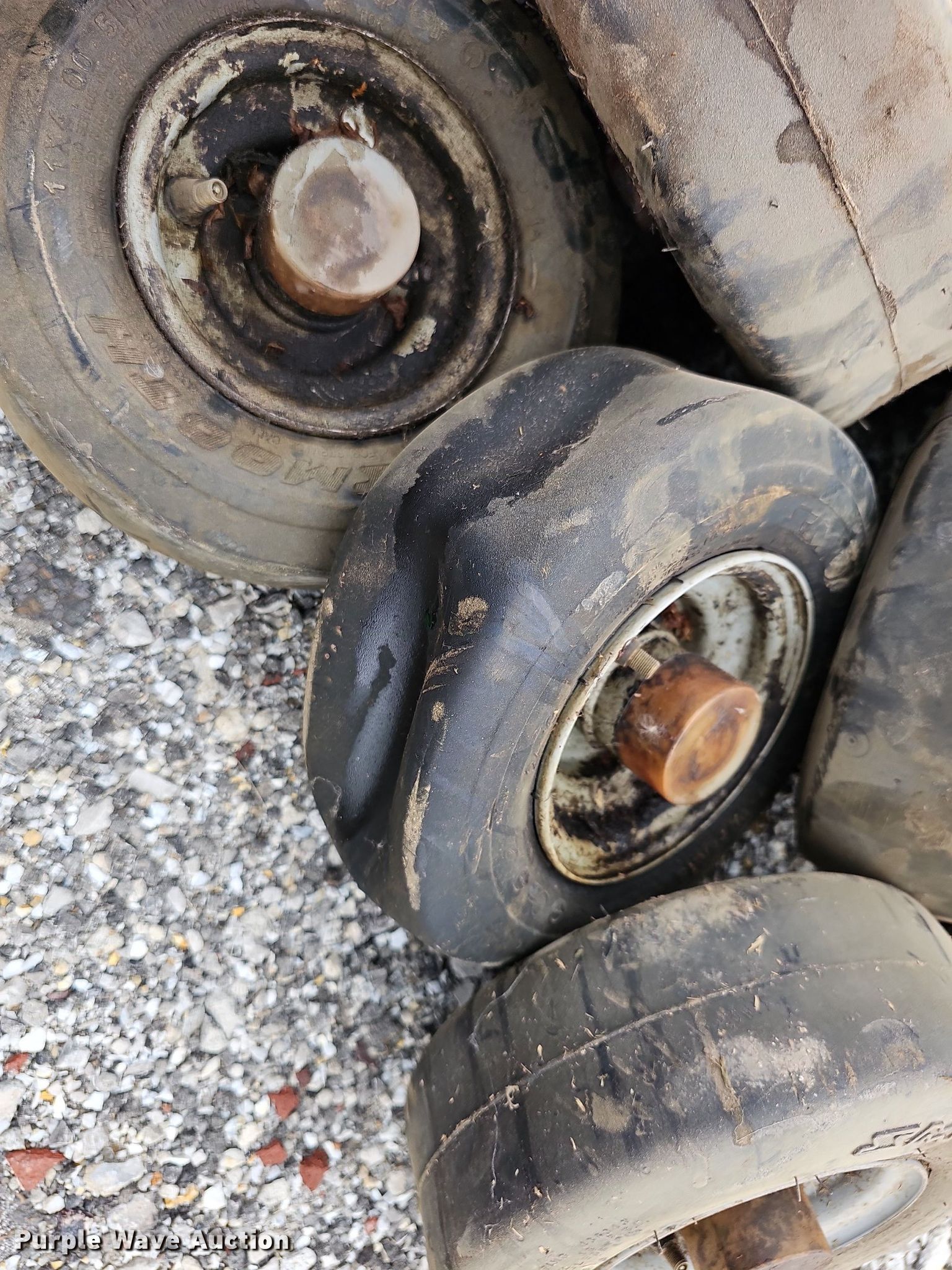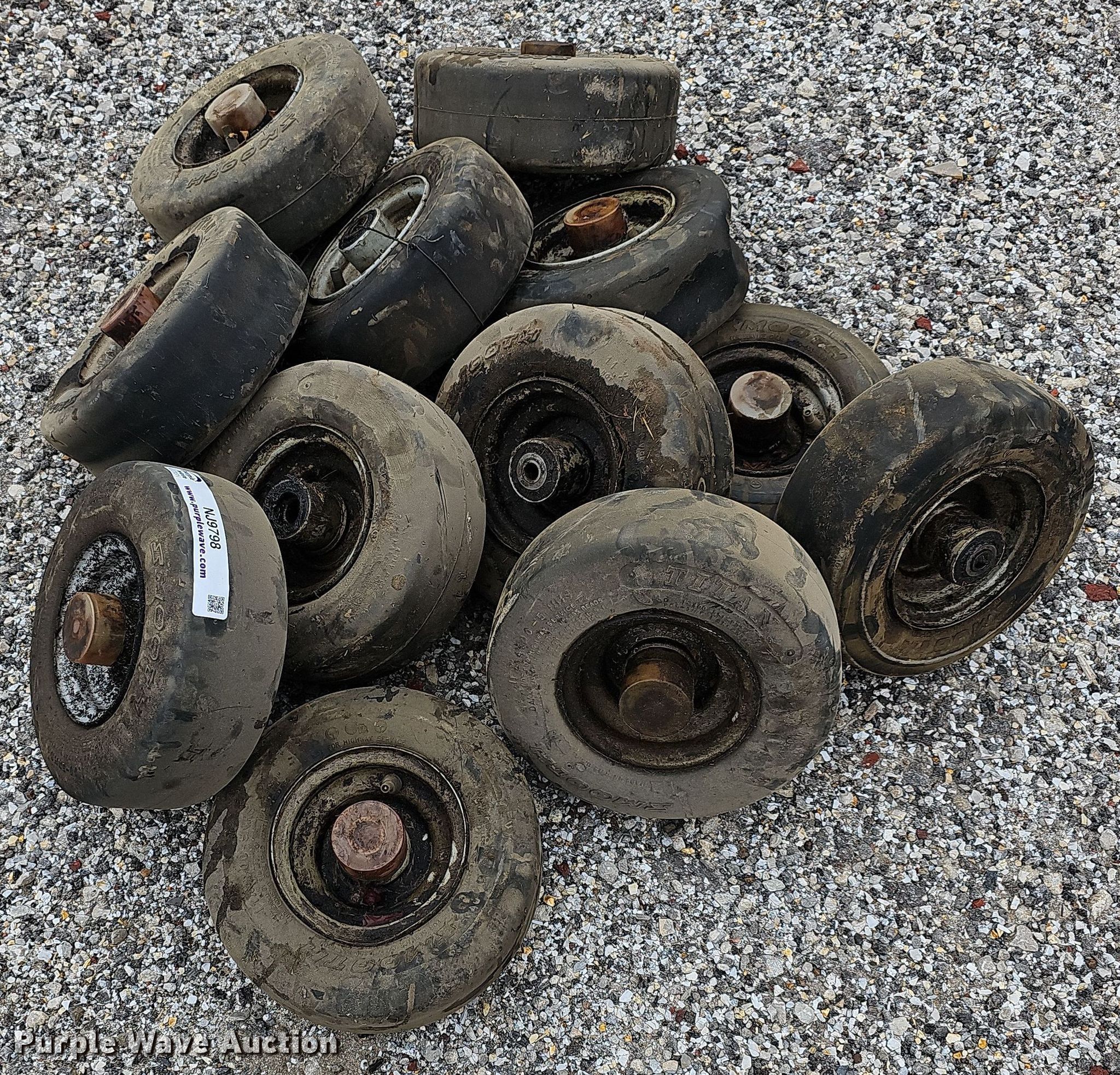 Purple Wave is selling a used Industrial Tires or Tracks in Kansas. This item is a (13) Titan 11x4.00-5 tires and wheels with the following: Removed from Jacobsen HR800 mower deck