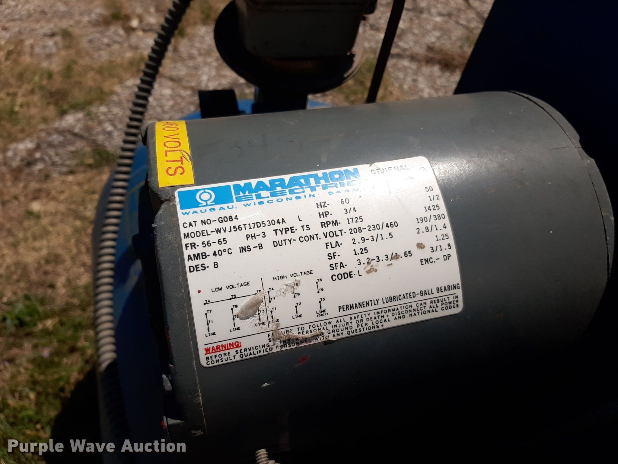 Emglo F34S-30S air compressor. Serial: A043091340. Electric Motor Marathon, HP: 0.75, Volts: 208-230/460, Phase: Three. Features Air compressor Tank capacity: 30 gallons. Notes Unknown operating condition. El Dorado Correctional Facility. 1737 US-54. El Dorado, KS 67042