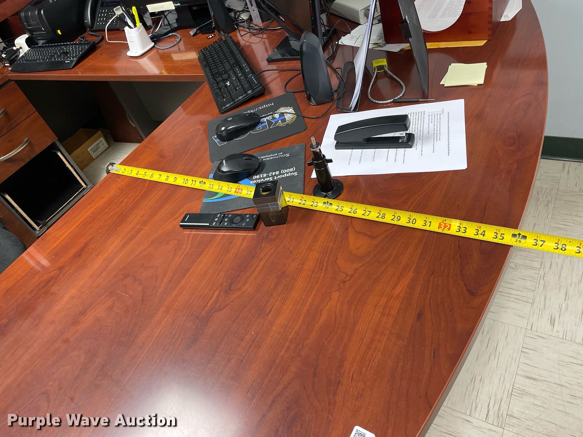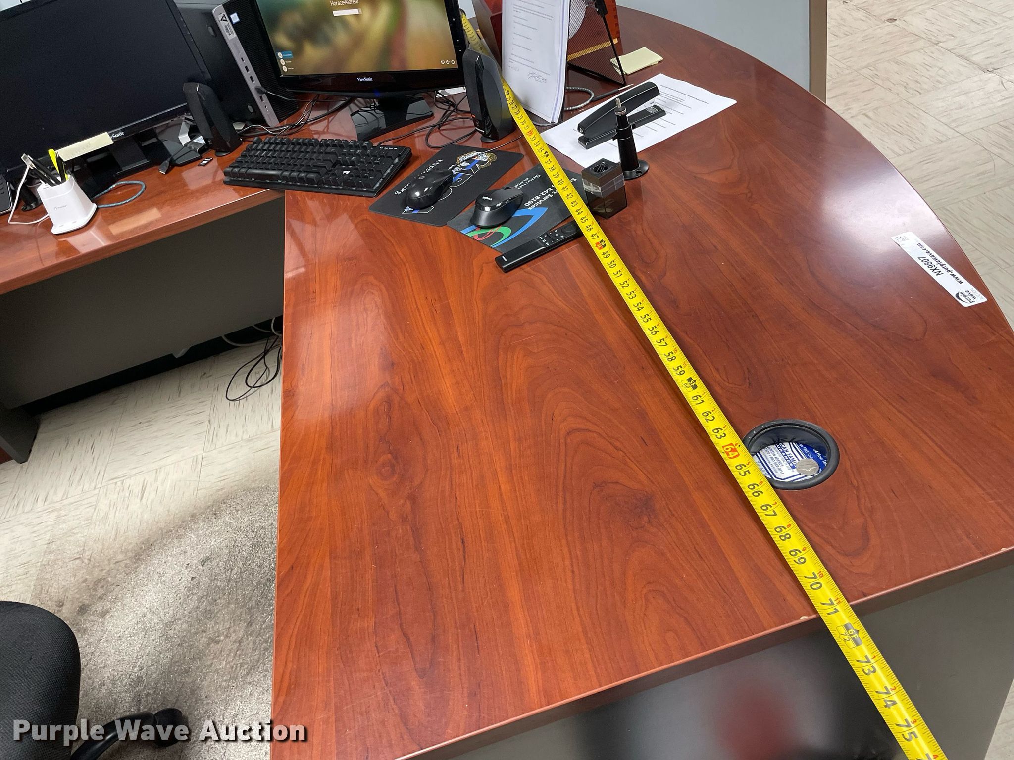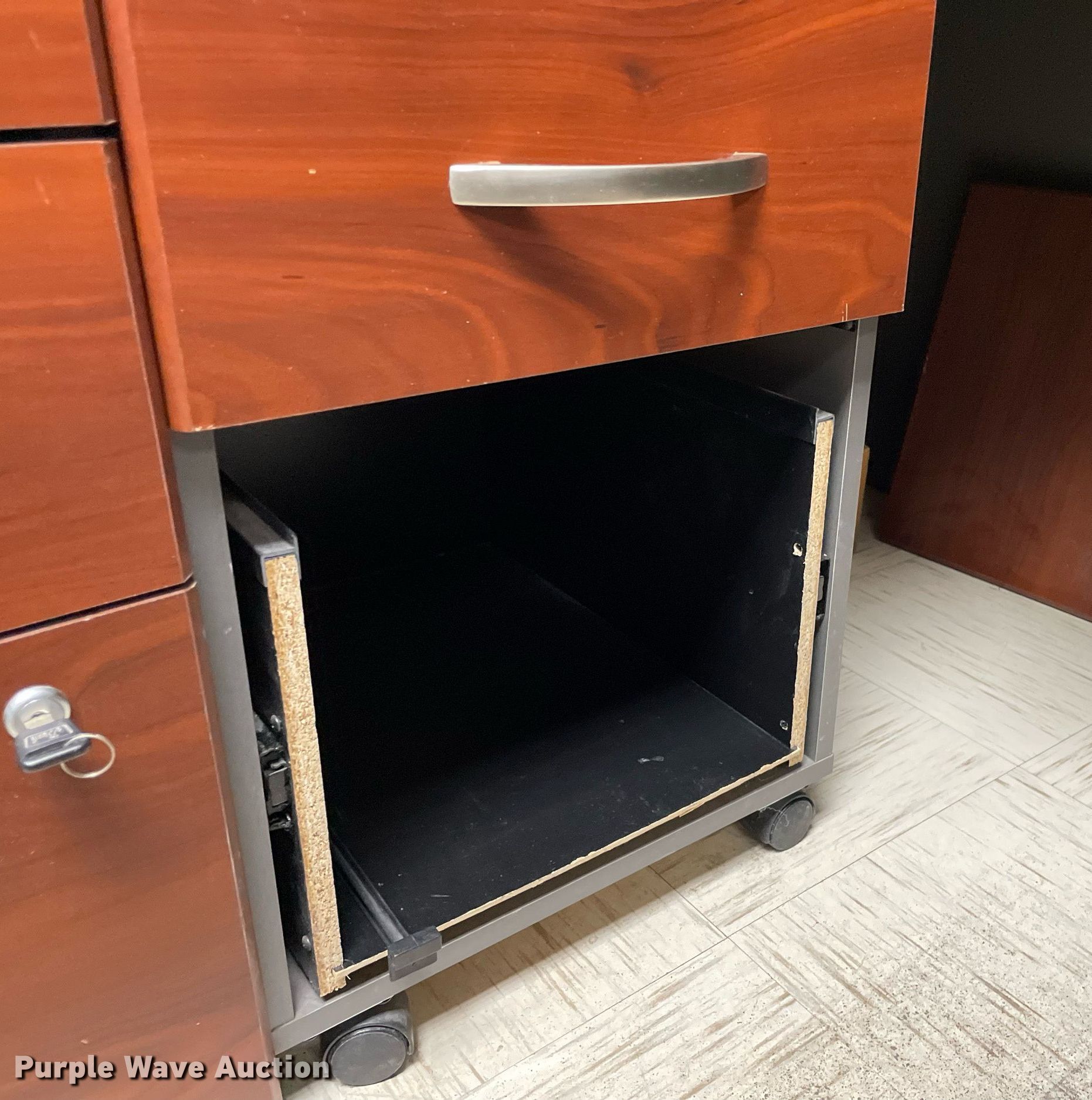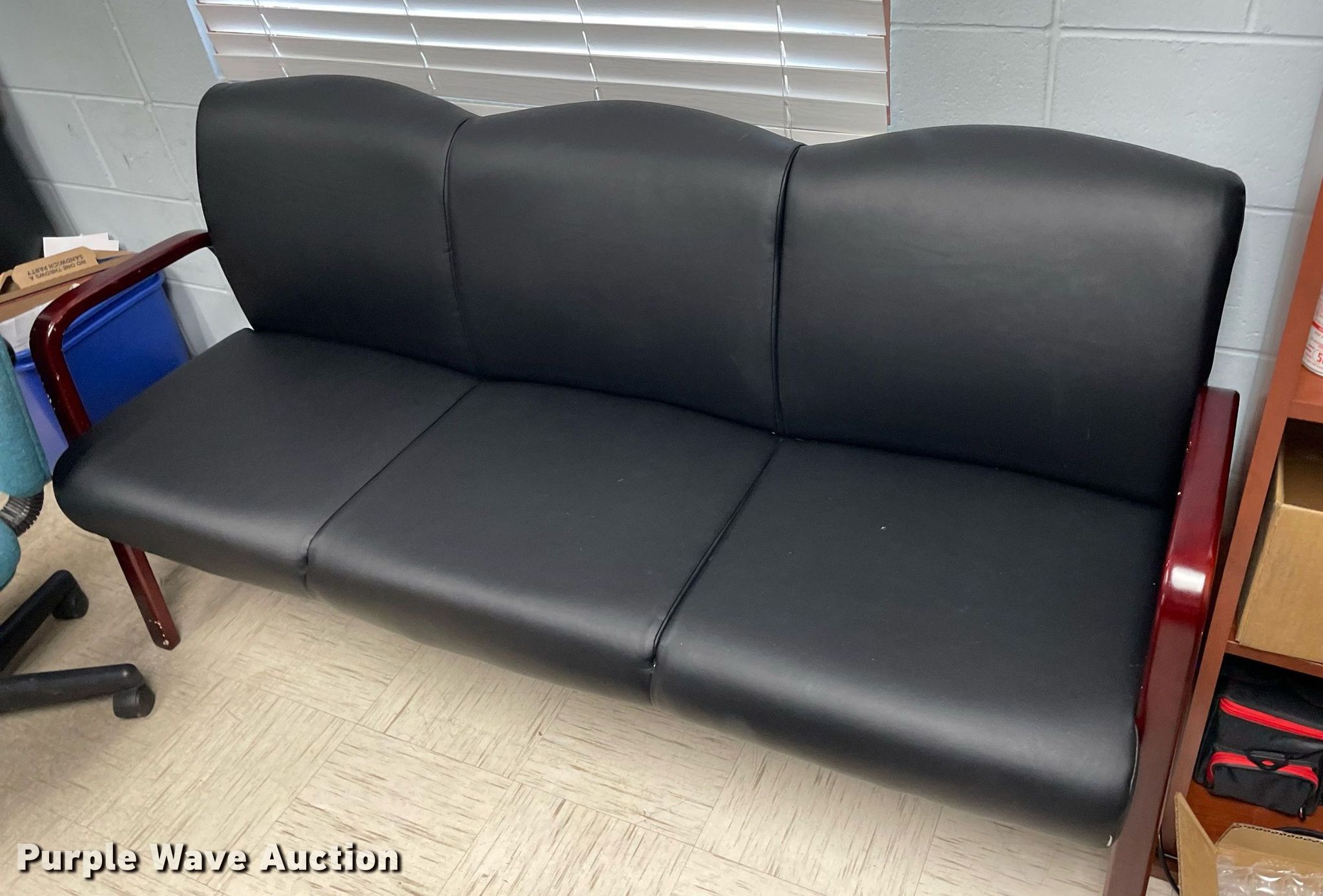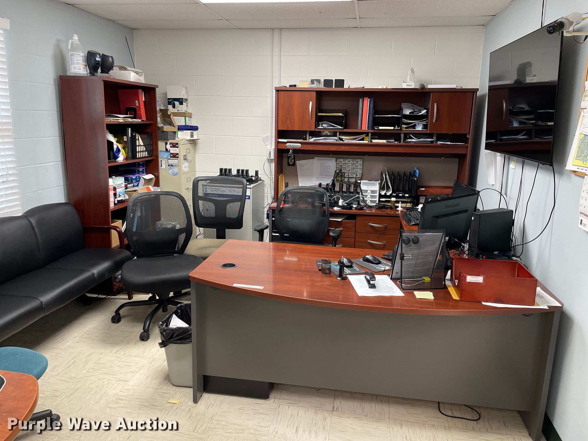 Purple Wave is selling a used Furniture in Kansas. This item is a Office furniture with the following: Complete desk set, Four drawer file cabinet, Wooden shelf, Couch, (4) office chairs, Paper shredder not included, TV not included, Contents not included