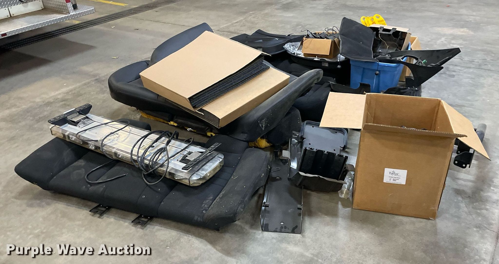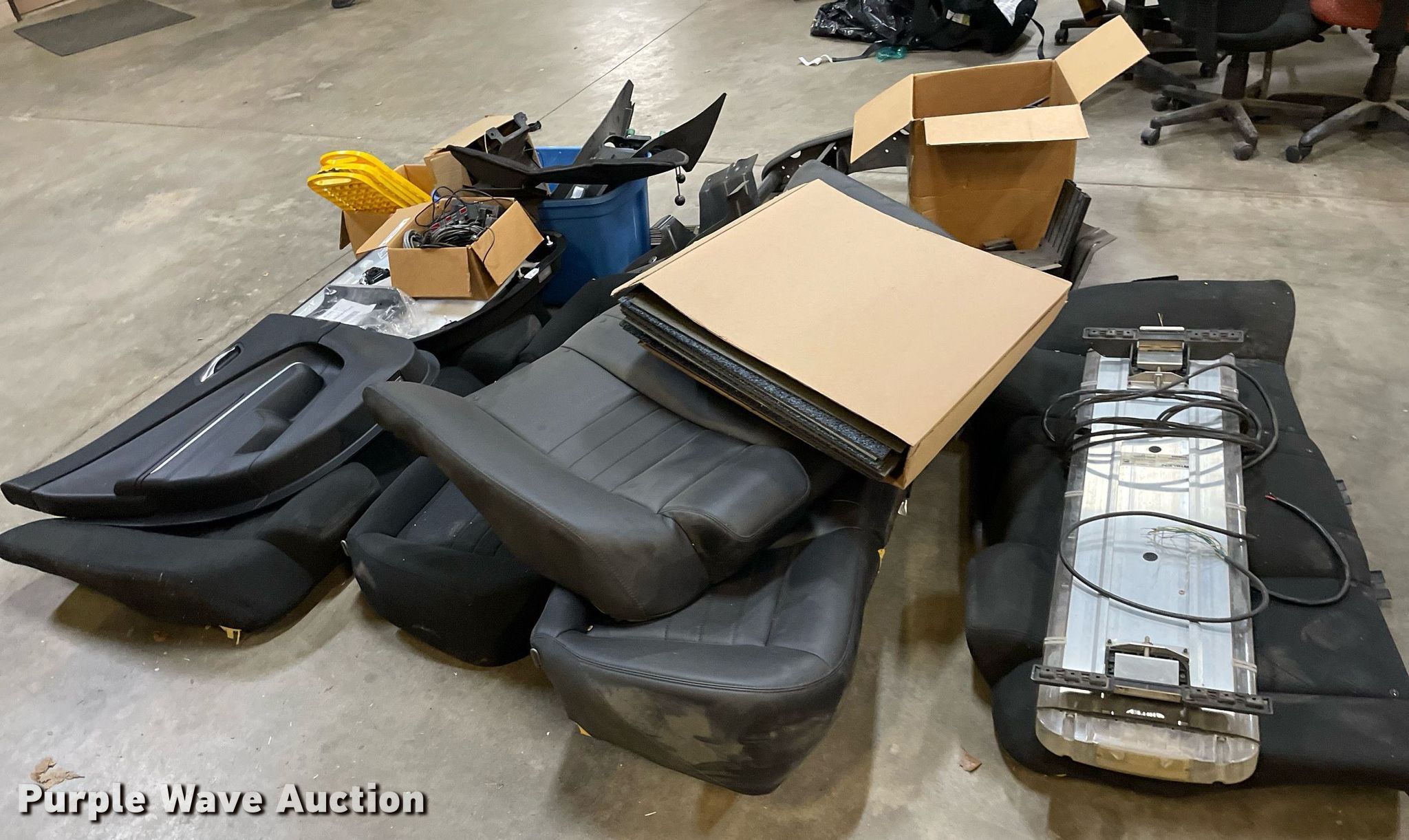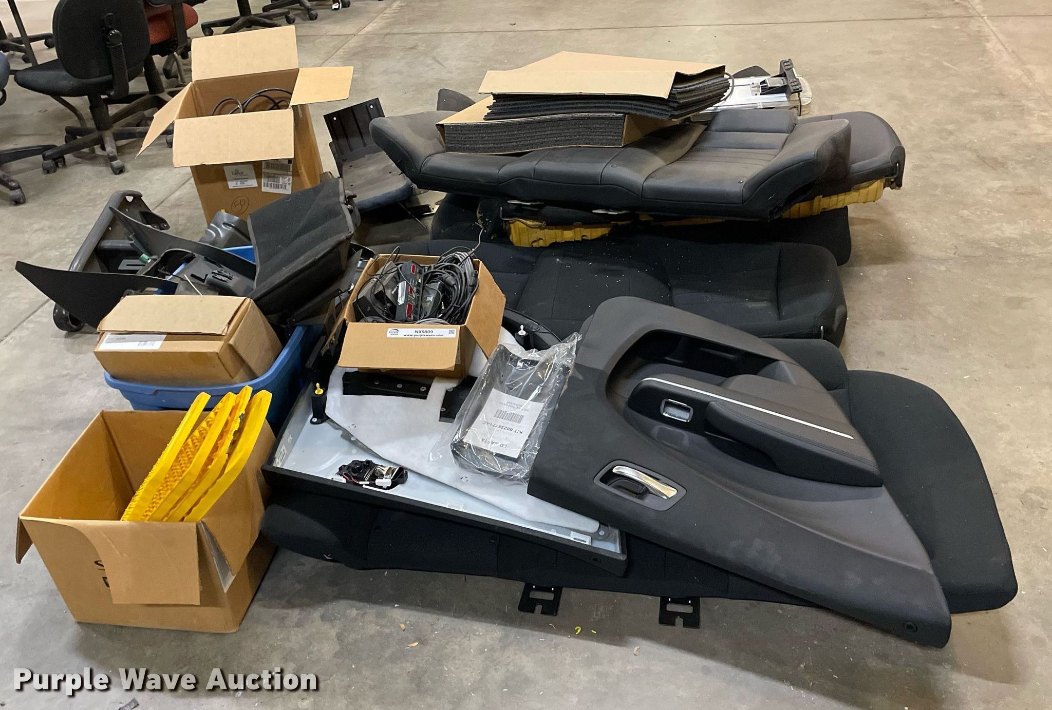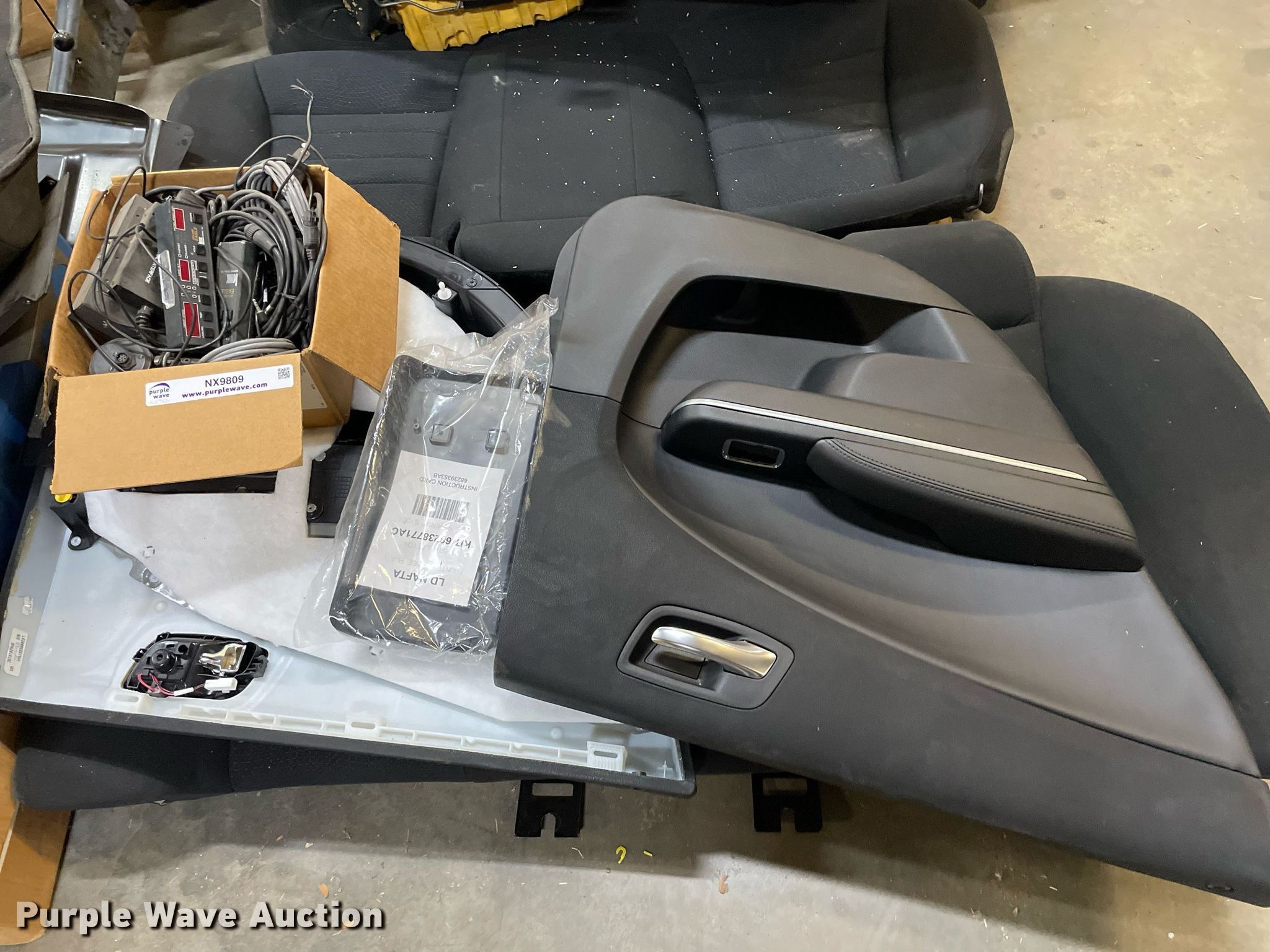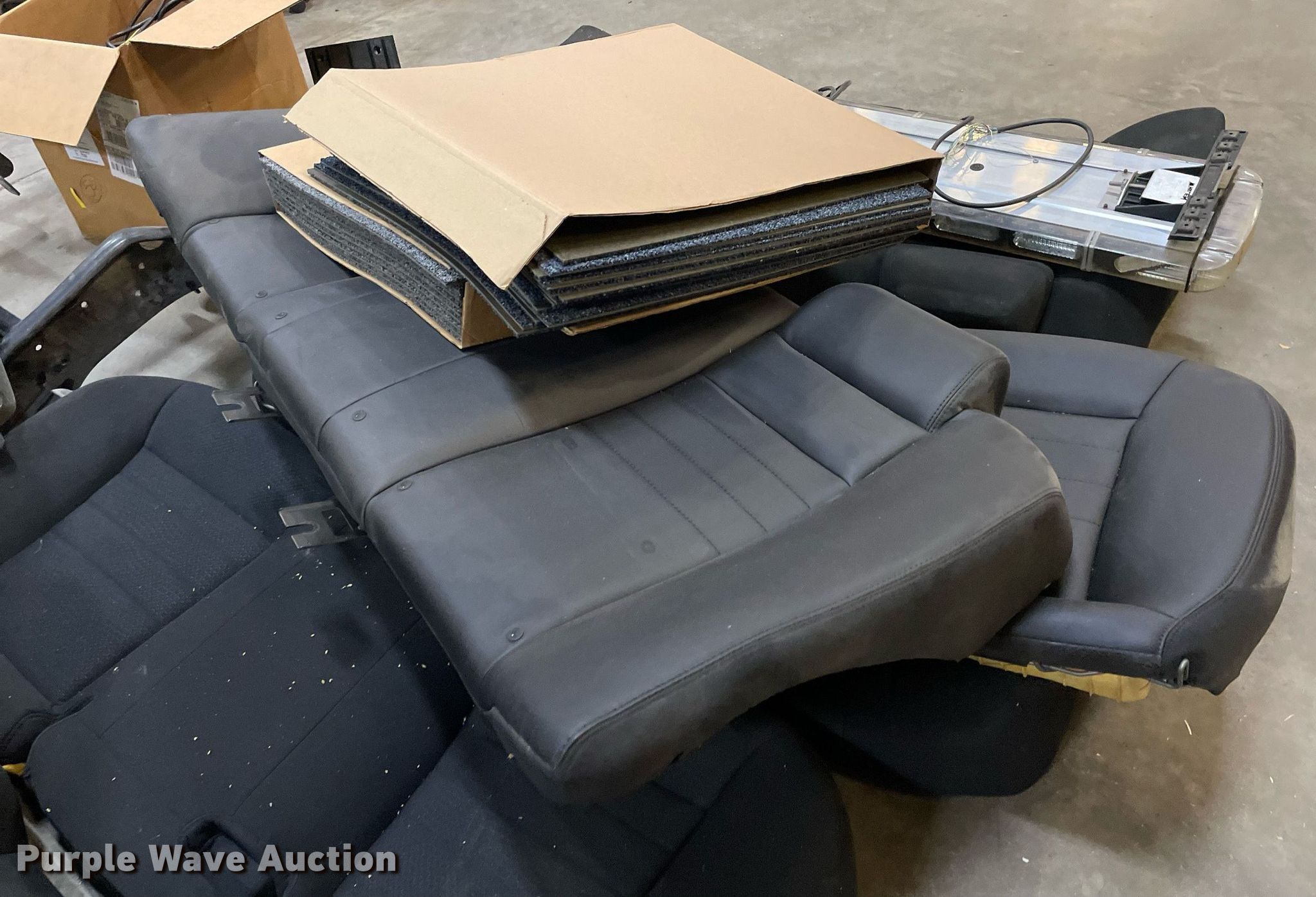 Purple Wave is selling a used Automotive Parts or Acces. in Kansas. This item is a Automotive parts with the following: (3) backseats, Removed from Dodge Charger, (2) Dodge Charger door panels, unused, Whelen light bar, Approximately 30 carpet squares, Custom signals radar, Center console components, Container of siren boxes and speakers, Container included, (2) M/A-Com radios, Push bumper and more