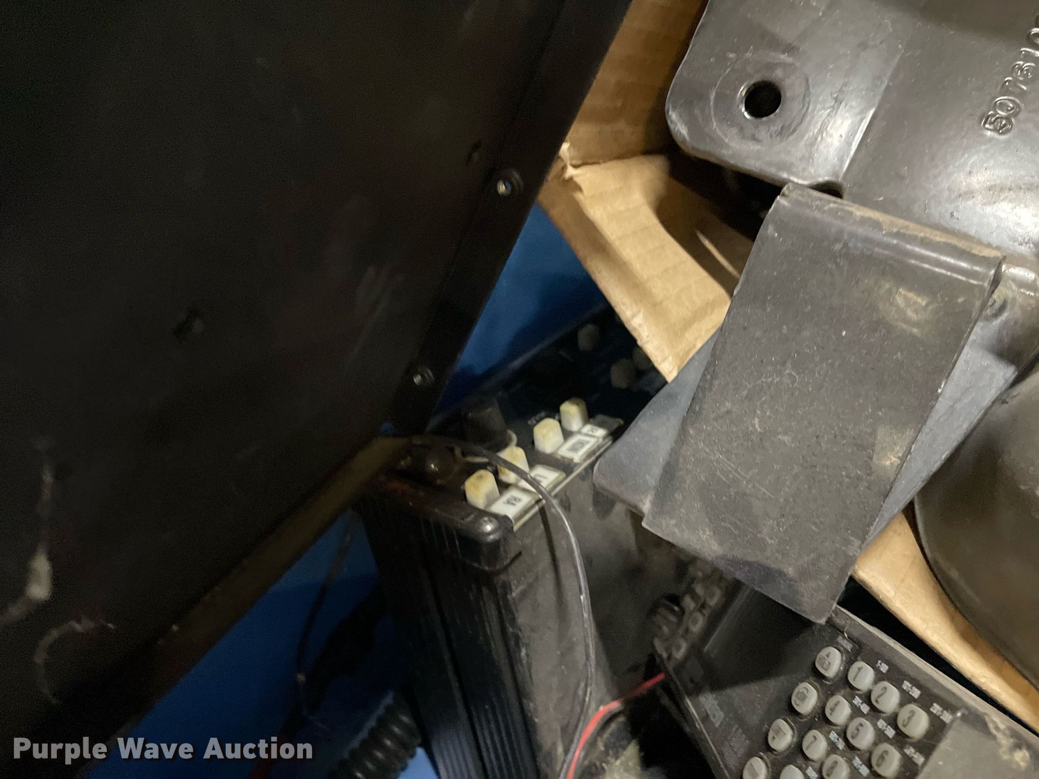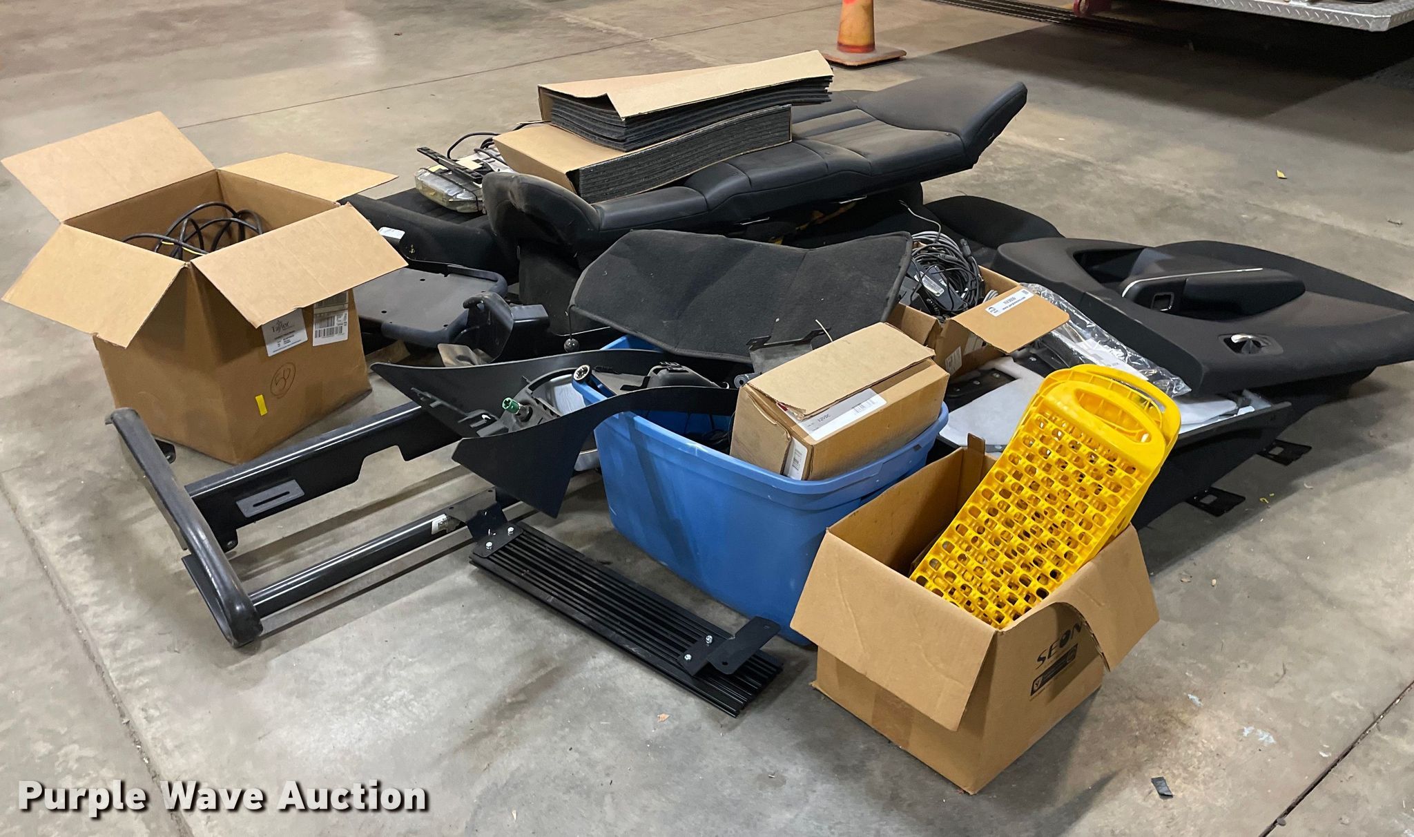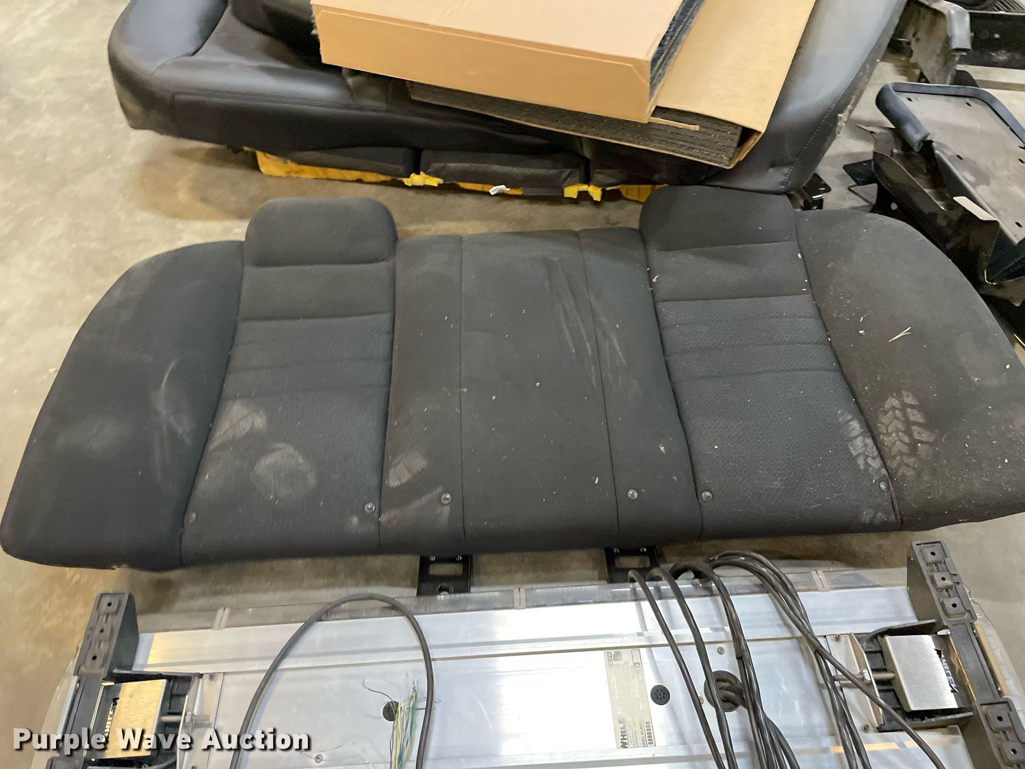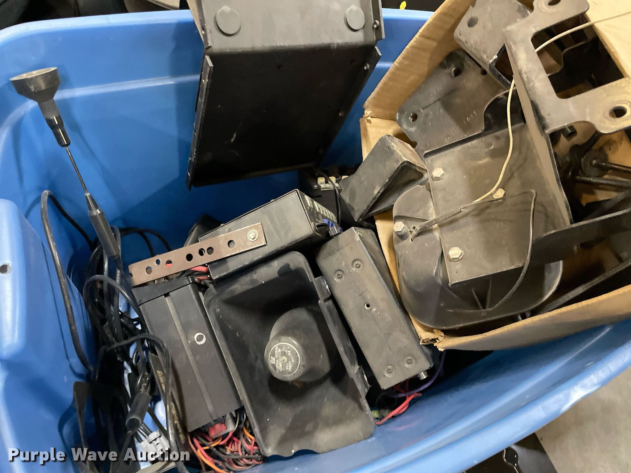 Purple Wave is selling a used Automotive Parts or Acces. in Kansas. This item is a Automotive parts with the following: (3) backseats, Removed from Dodge Charger, (2) Dodge Charger door panels, unused, Whelen light bar, Approximately 30 carpet squares, Custom signals radar, Center console components, Container of siren boxes and speakers, Container included, (2) M/A-Com radios, Push bumper and more