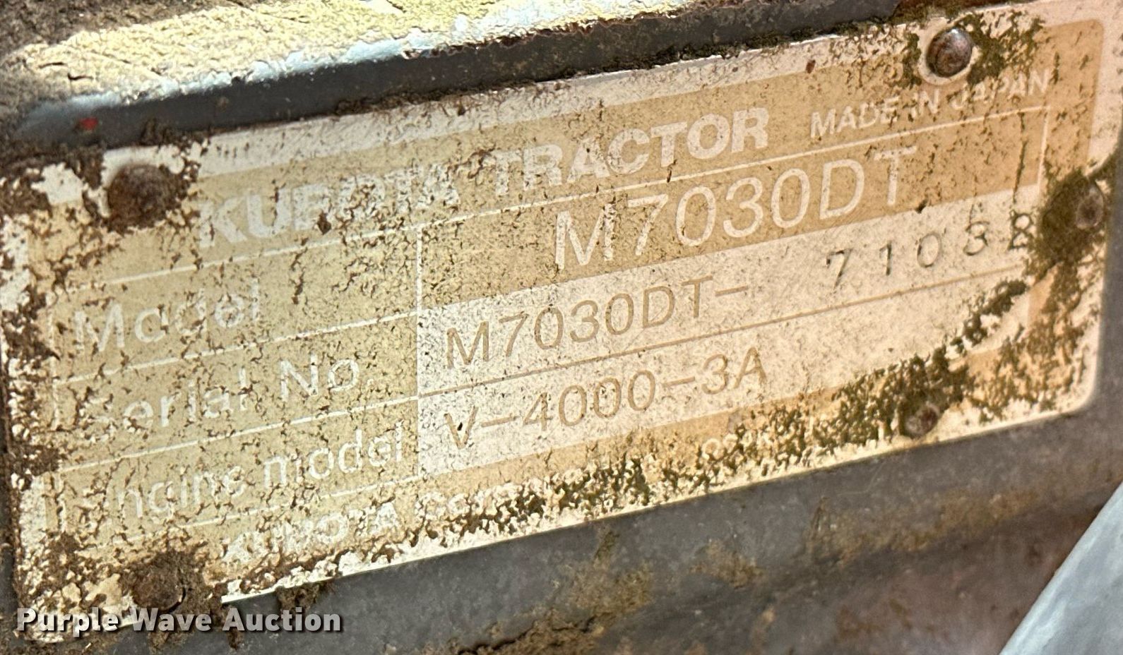Purple Wave is selling a used Tractor in Oklahoma. This item is a 1985 Kubota M7030SU tractor with the following: Hours: 3,468 on meter, Serial: M7030DT