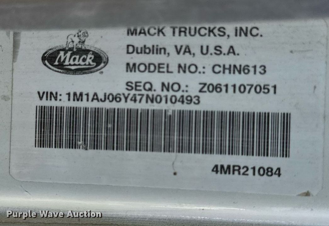 Purple Wave is selling a used Construction Dump Truck in Arkansas. This item is a 2007 Mack CHN613 dump truck with the following: Miles: 470,692 on odometer, VIN: 1M1AJ06Y47N010493, Unit #: 114