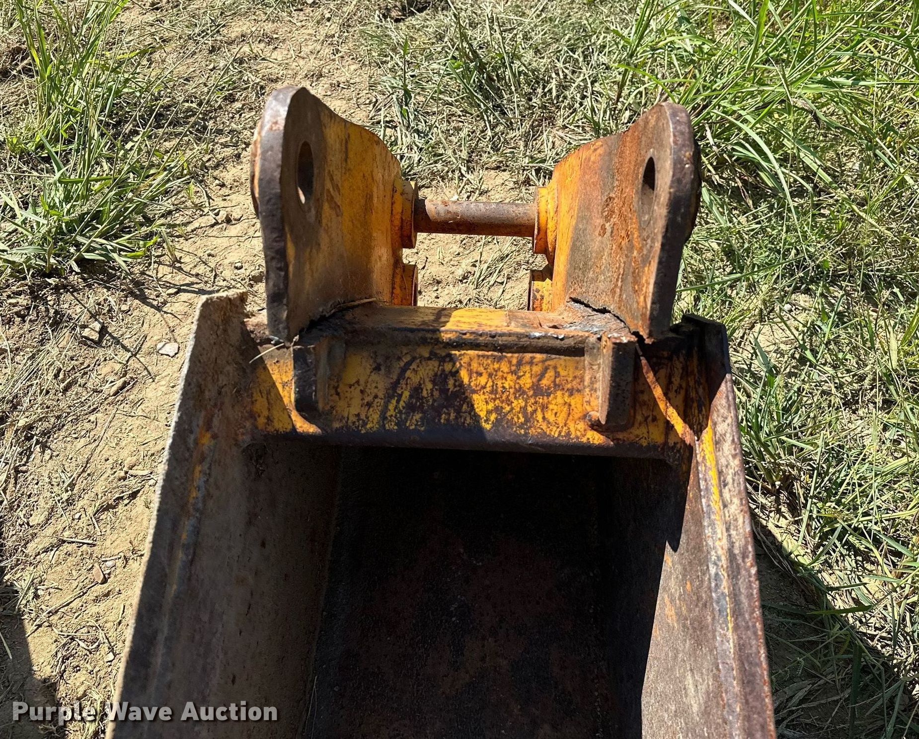 Purple Wave is selling a used Backhoe Attach. in Oklahoma. This item is a Backhoe buckets with the following: 16" bucket, Teeth: 3, Mounting brackets cracked, 42" scraper bucket