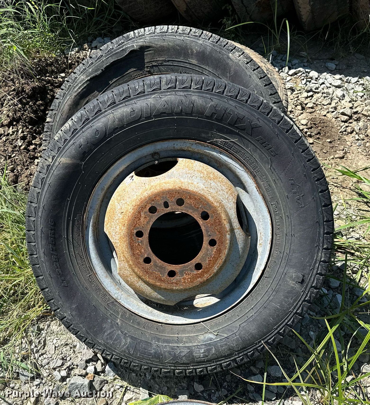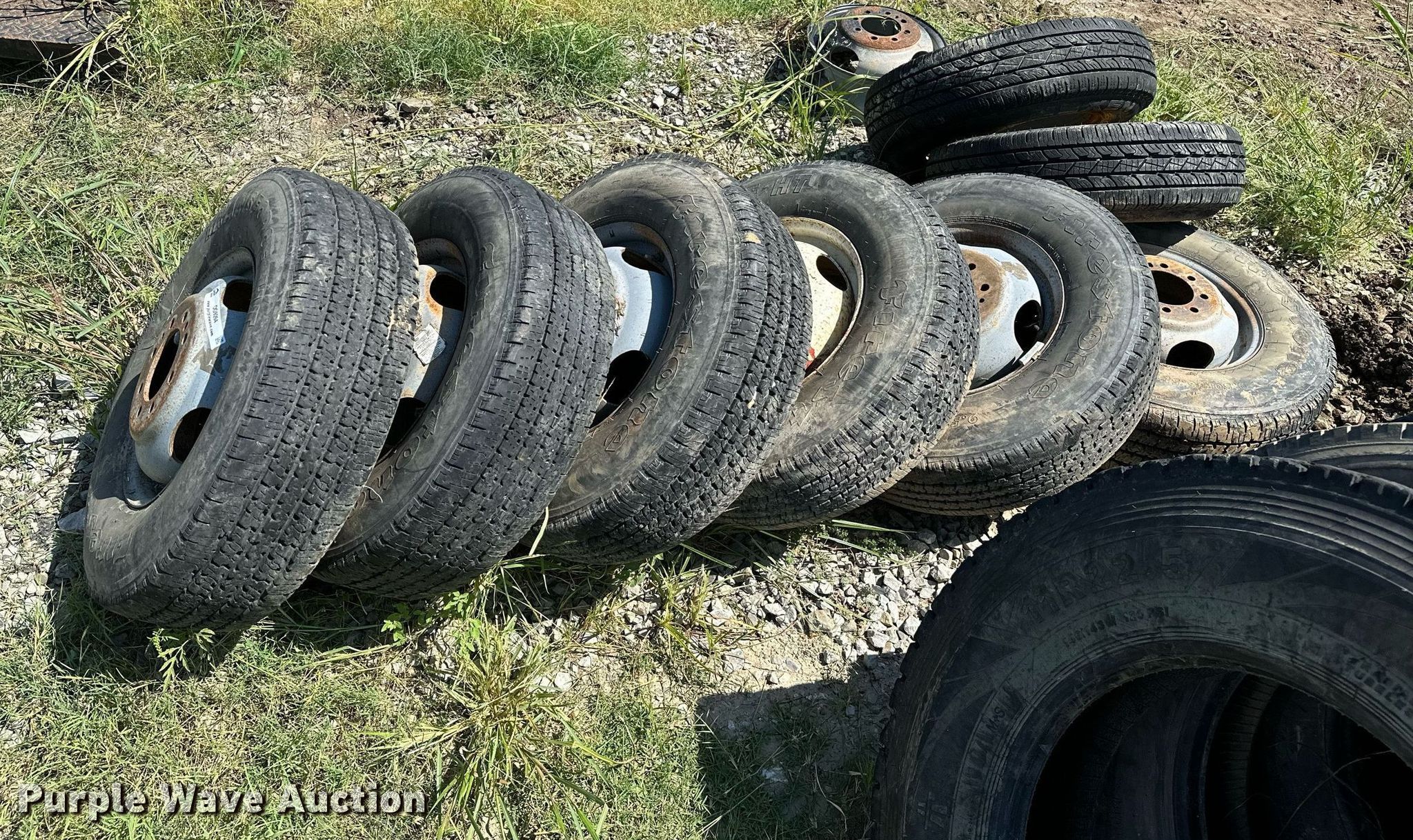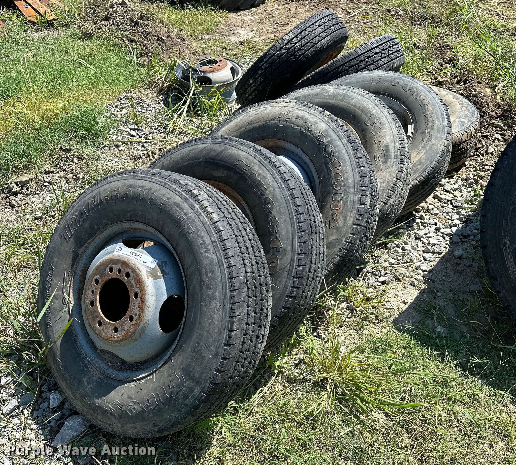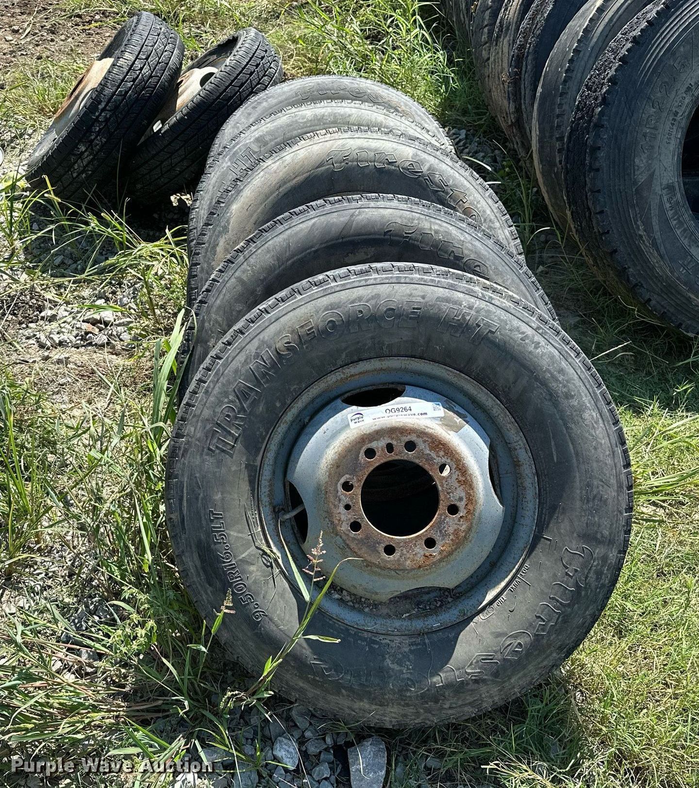 Purple Wave is selling a used Fleet Tires in Oklahoma. This item is a (8) tires and wheels with the following: (6) 9.50R16.5 Firestone Transforce, (2) 225/75R16 Nexen Roadian HTX, Holes in sidewall