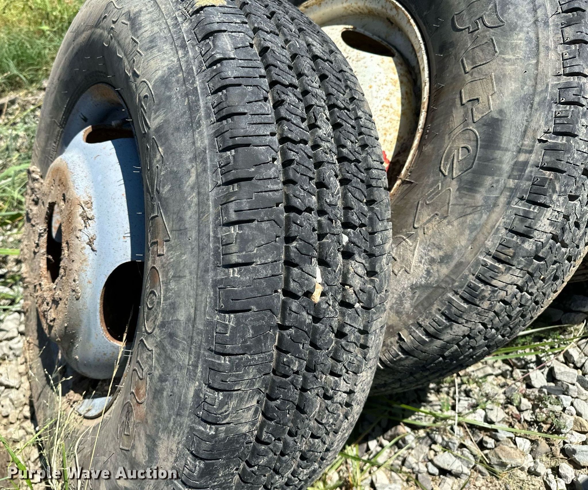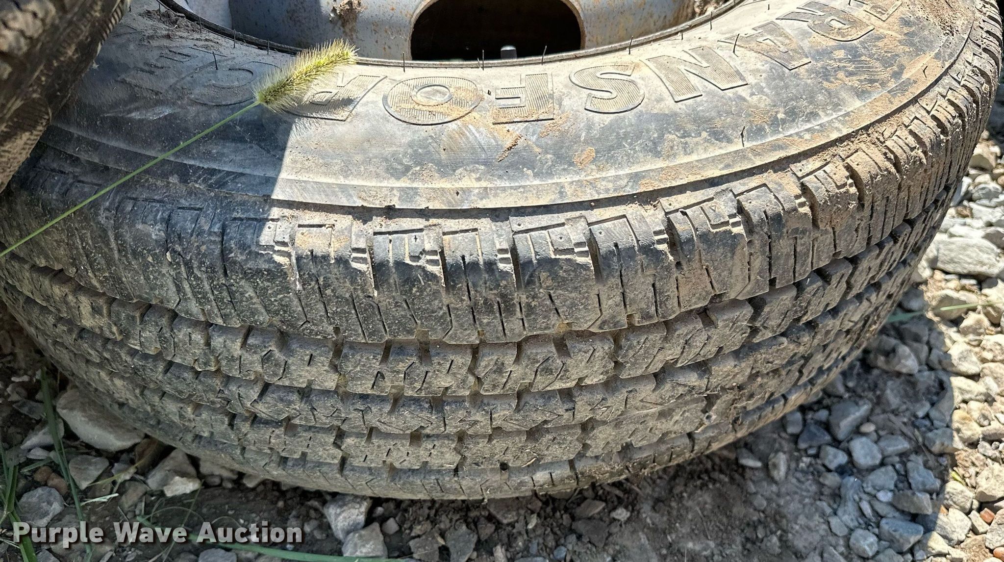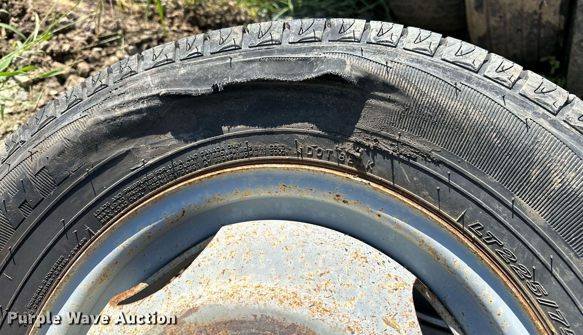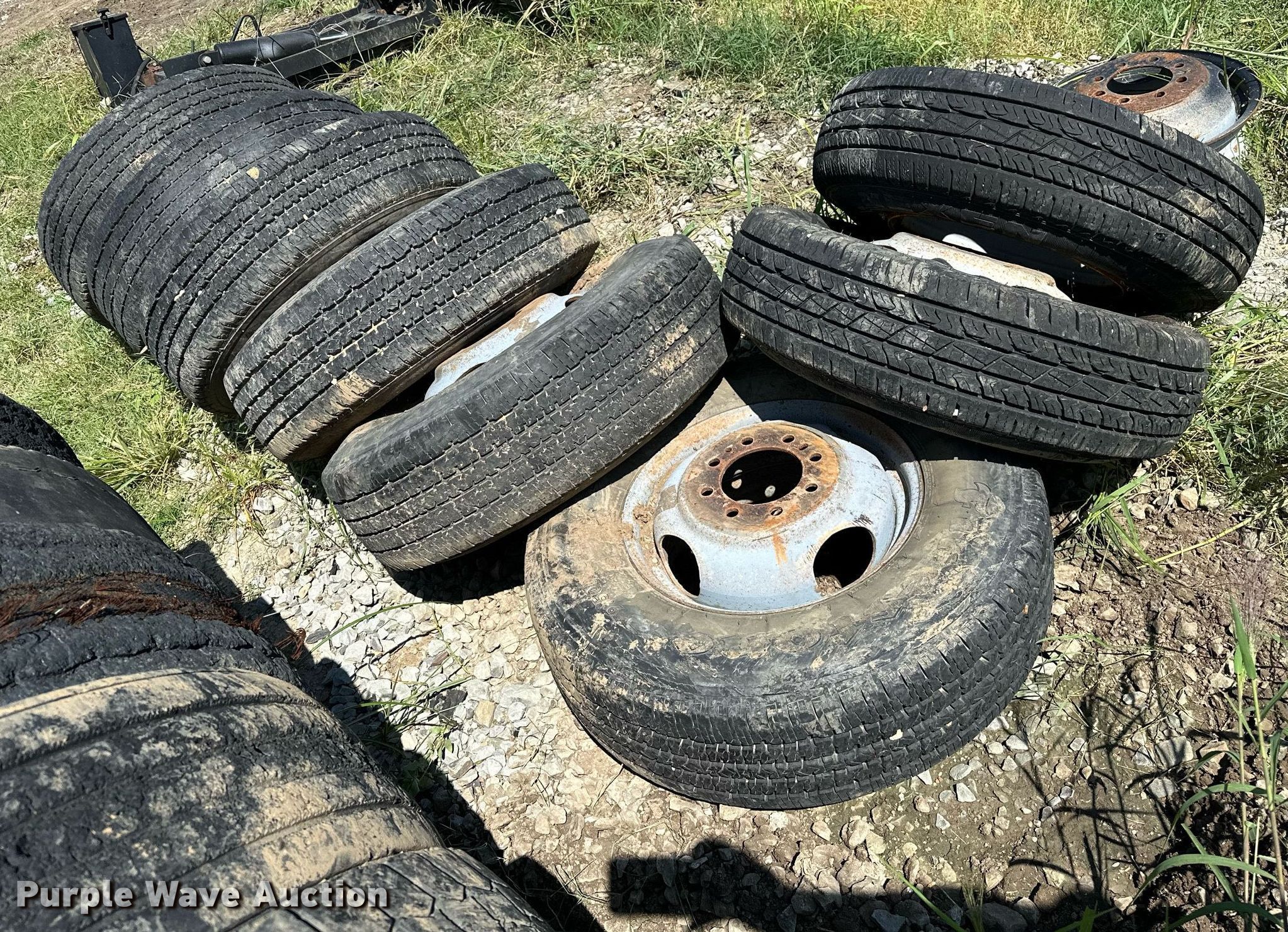 Purple Wave is selling a used Fleet Tires in Oklahoma. This item is a (8) tires and wheels with the following: (6) 9.50R16.5 Firestone Transforce, (2) 225/75R16 Nexen Roadian HTX, Holes in sidewall