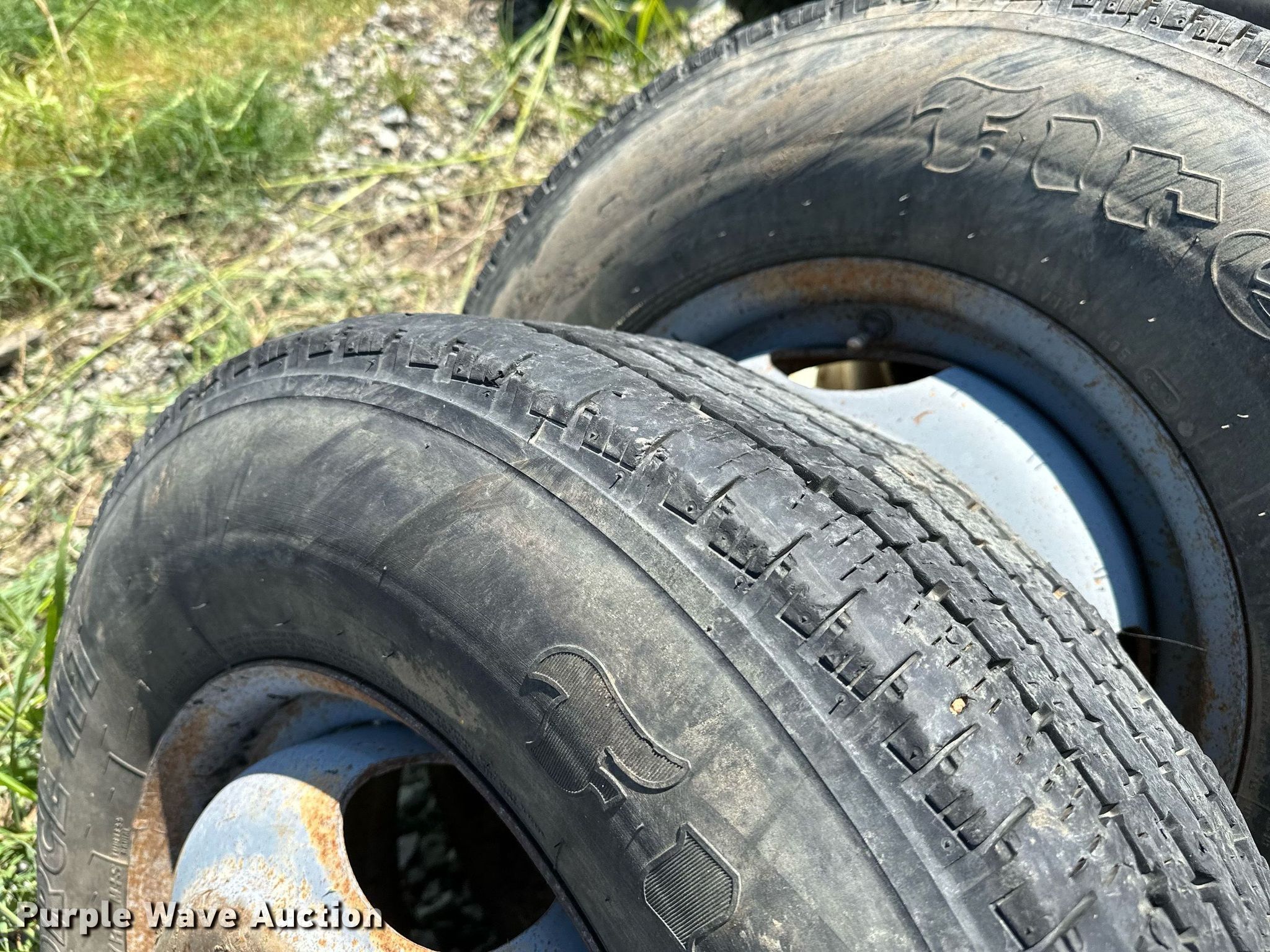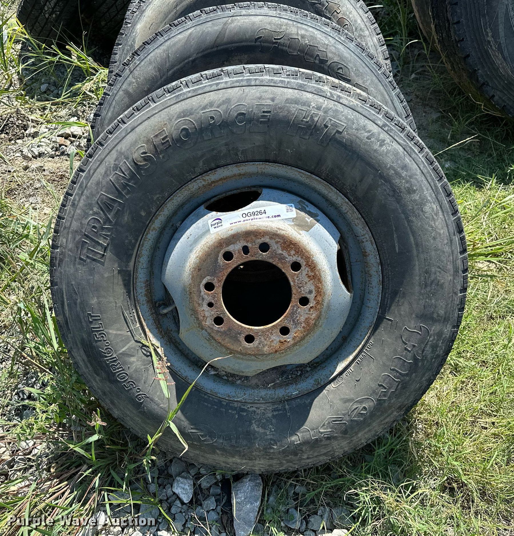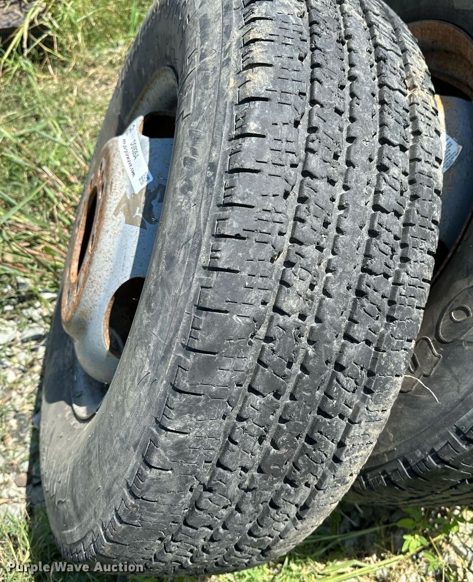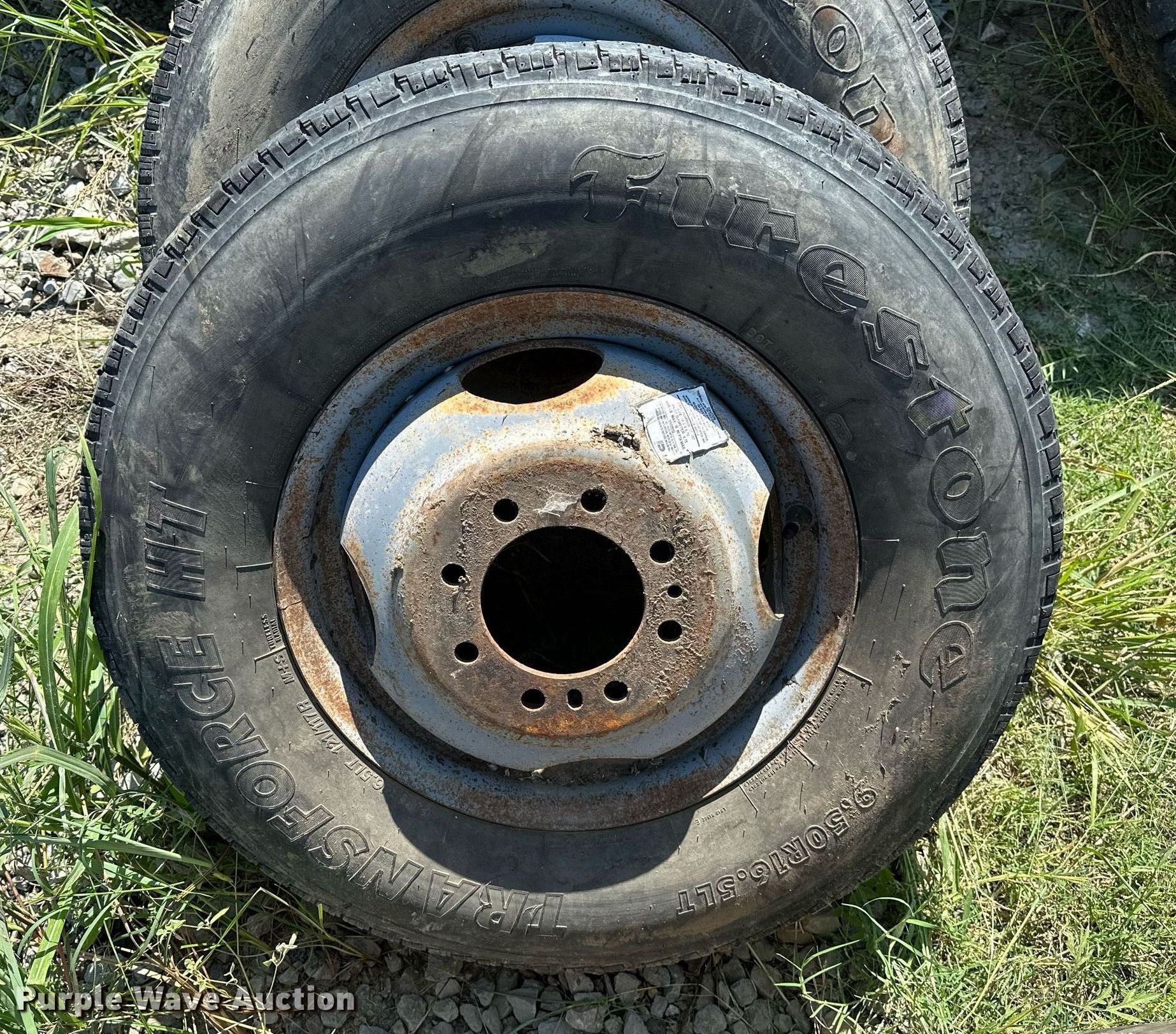 Purple Wave is selling a used Fleet Tires in Oklahoma. This item is a (8) tires and wheels with the following: (6) 9.50R16.5 Firestone Transforce, (2) 225/75R16 Nexen Roadian HTX, Holes in sidewall