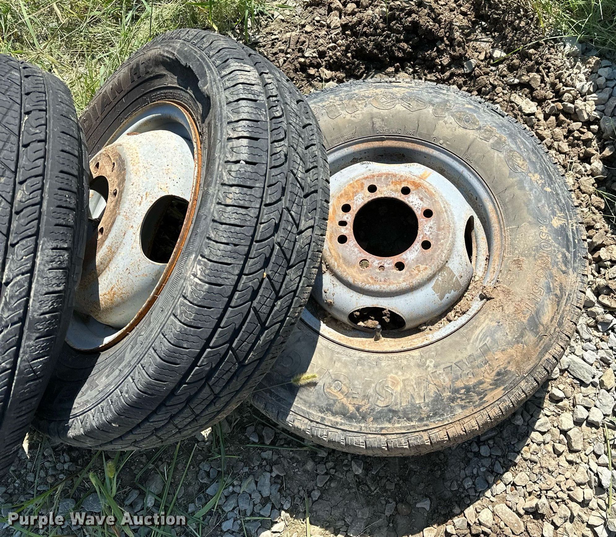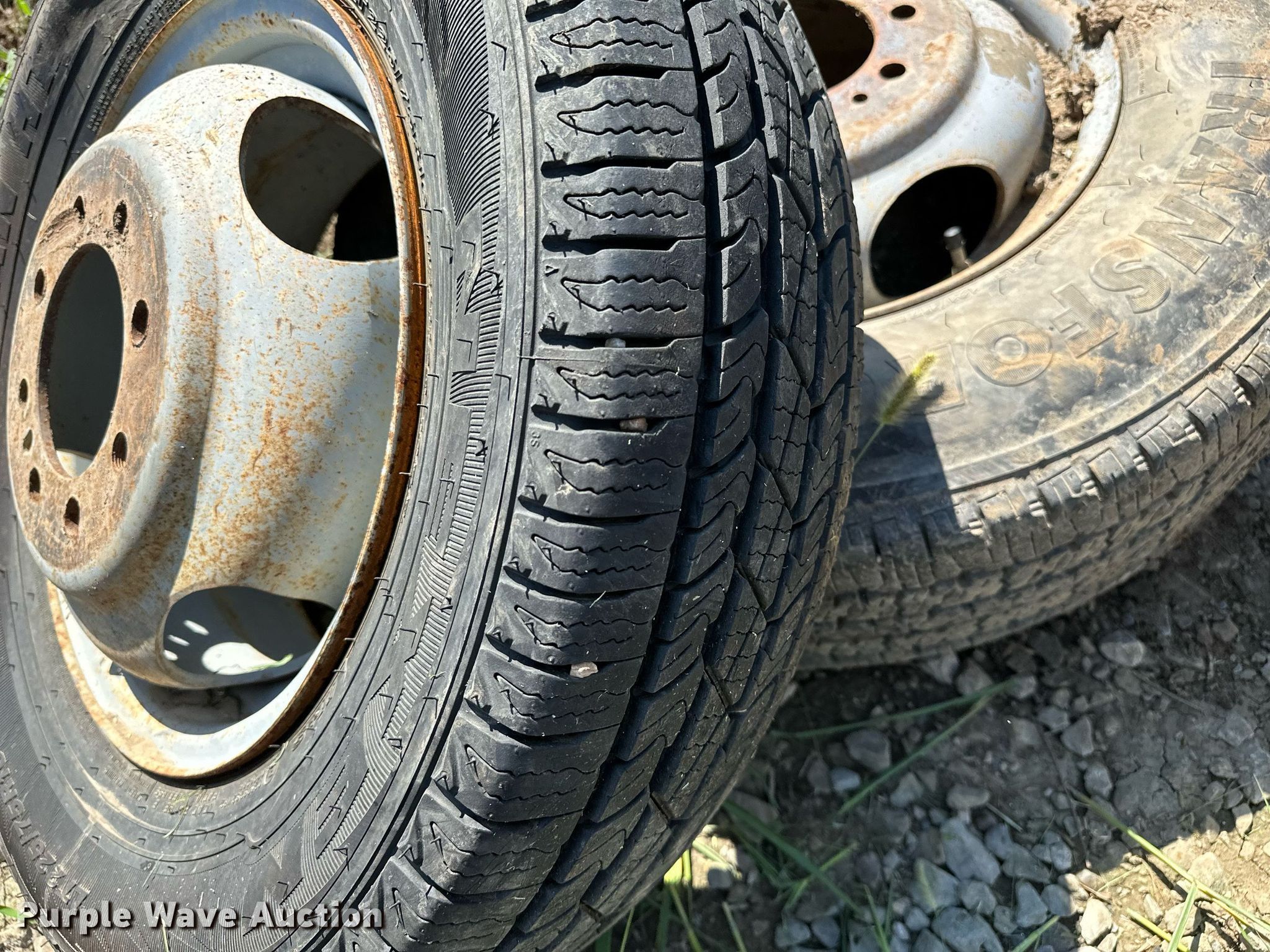 (8) tires and wheels. (6) 9.50R16.5 Firestone Transforce , (2) 225/75R16 Nexen Roadian HTX Holes in sidewall. Muskogee County. 306 Zenith. Warner, OK 74469