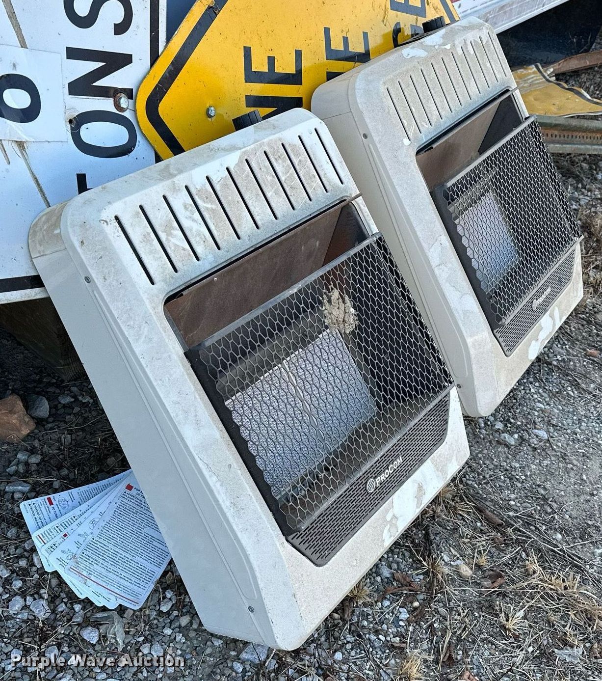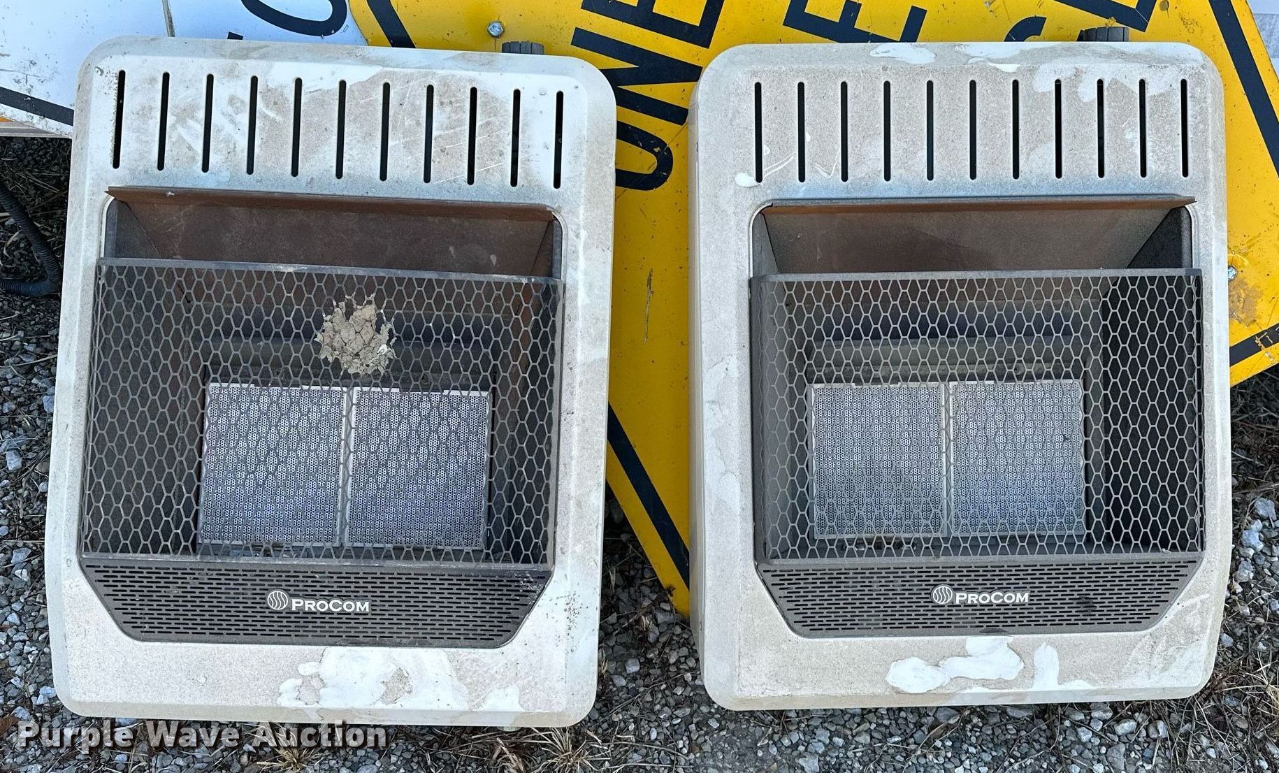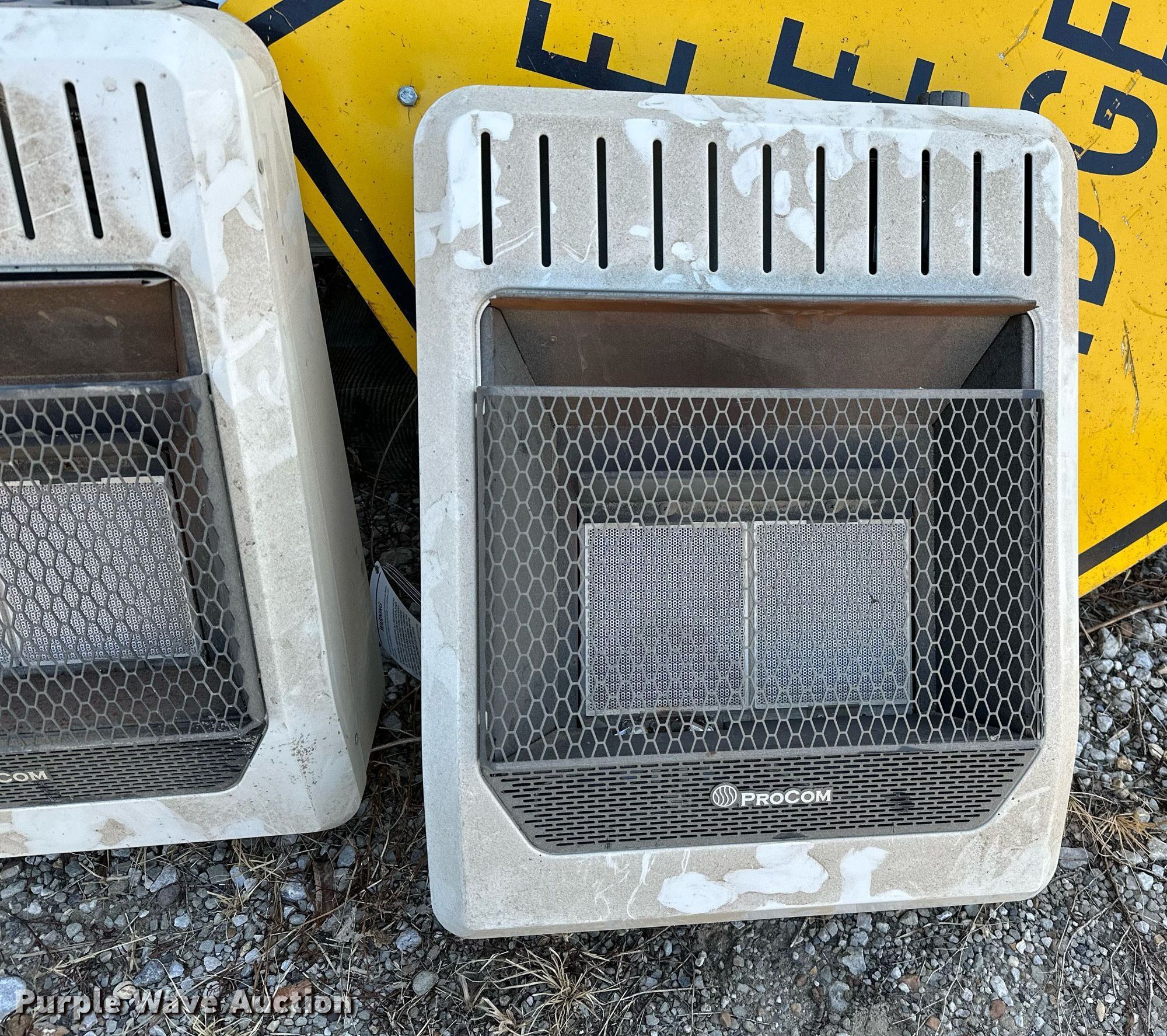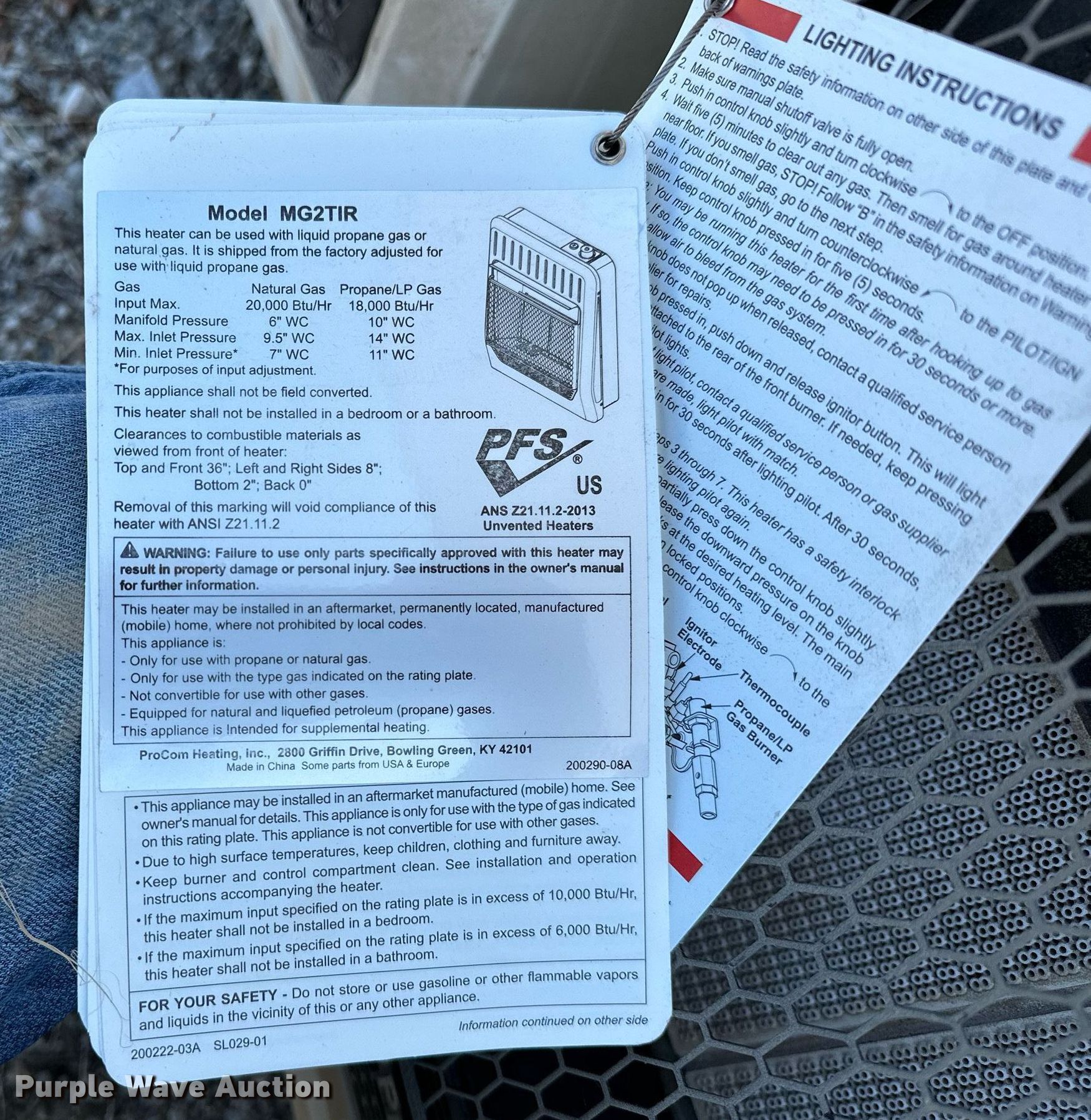 Purple Wave is selling a used Portable Heater or Fan in Oklahoma. This item is a (2) Procom MG1TIR heaters with the following: Natural gas fired, 20,000 BTU per hour, LPG fired, 18,000 BTU per hour