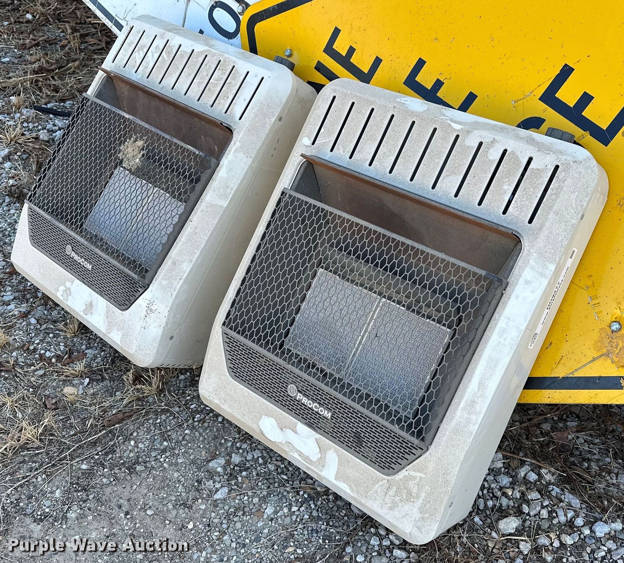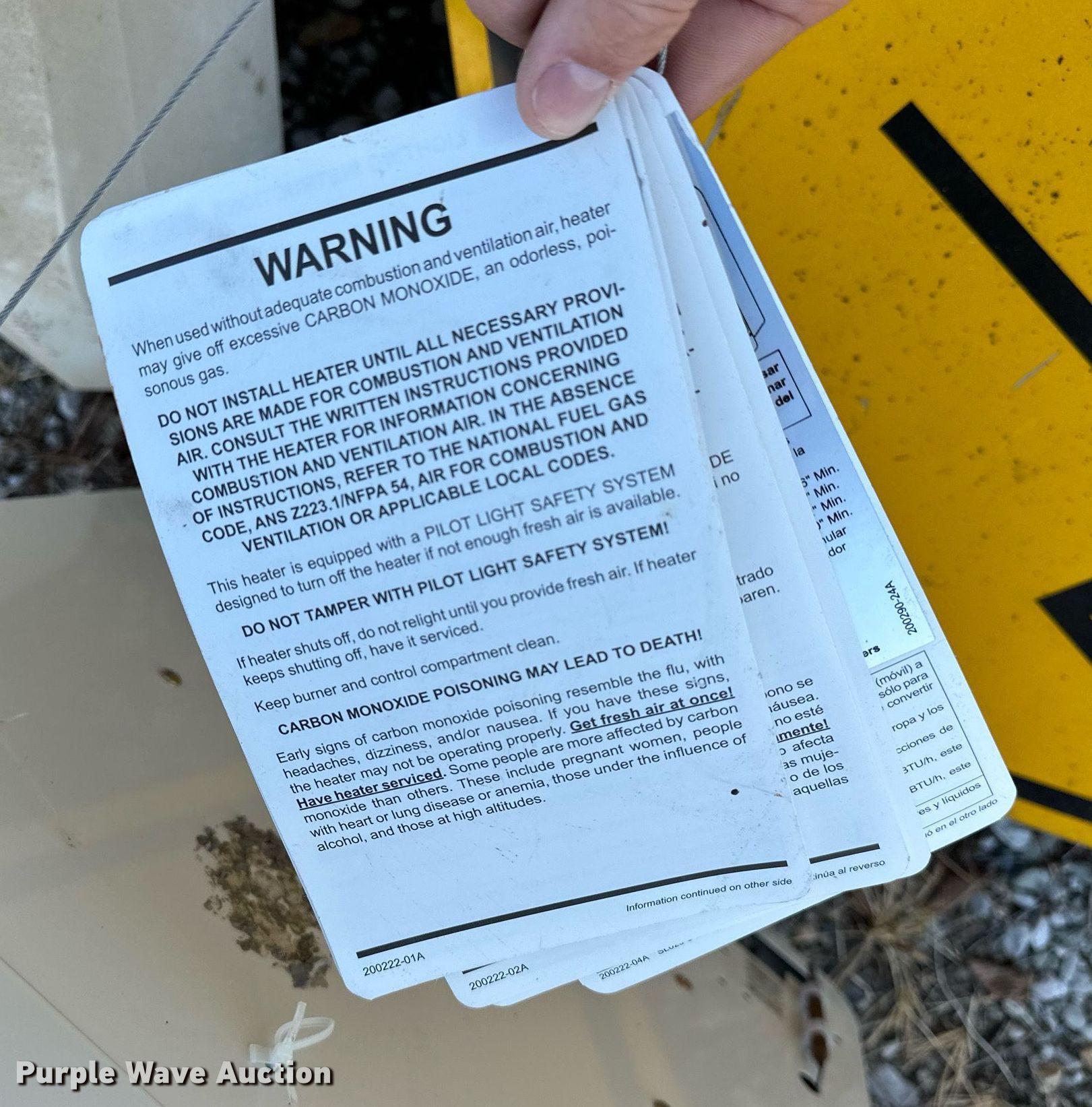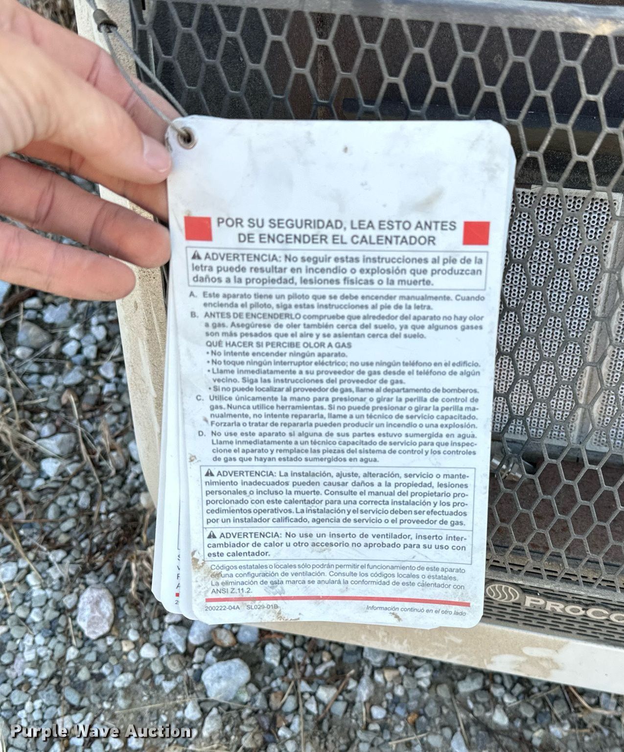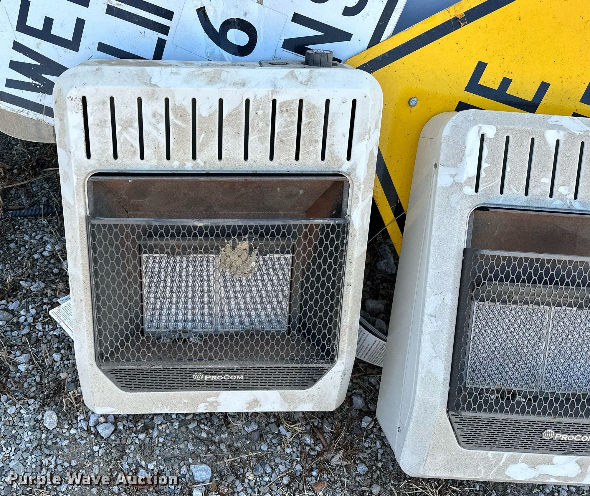 Purple Wave is selling a used Portable Heater or Fan in Oklahoma. This item is a (2) Procom MG1TIR heaters with the following: Natural gas fired, 20,000 BTU per hour, LPG fired, 18,000 BTU per hour