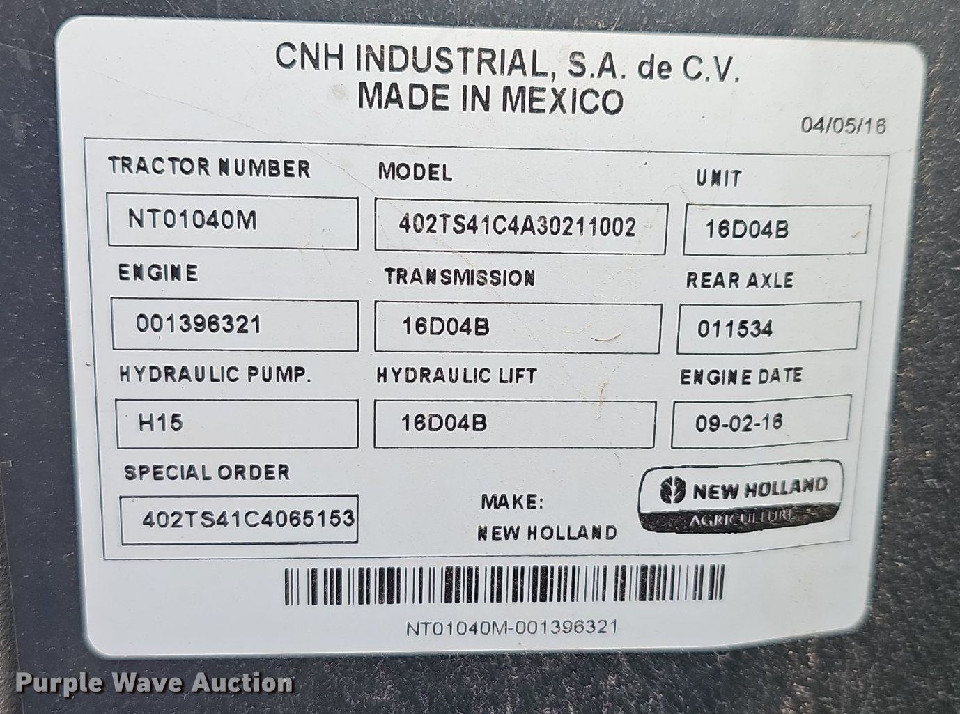 Purple Wave is selling a used Tractor in Missouri. This item is a 2016 New Holland TS6.110 MFWD tractor with the following: Hours: 2,169 on meter, Serial: NT01040M, Unit #: O6397