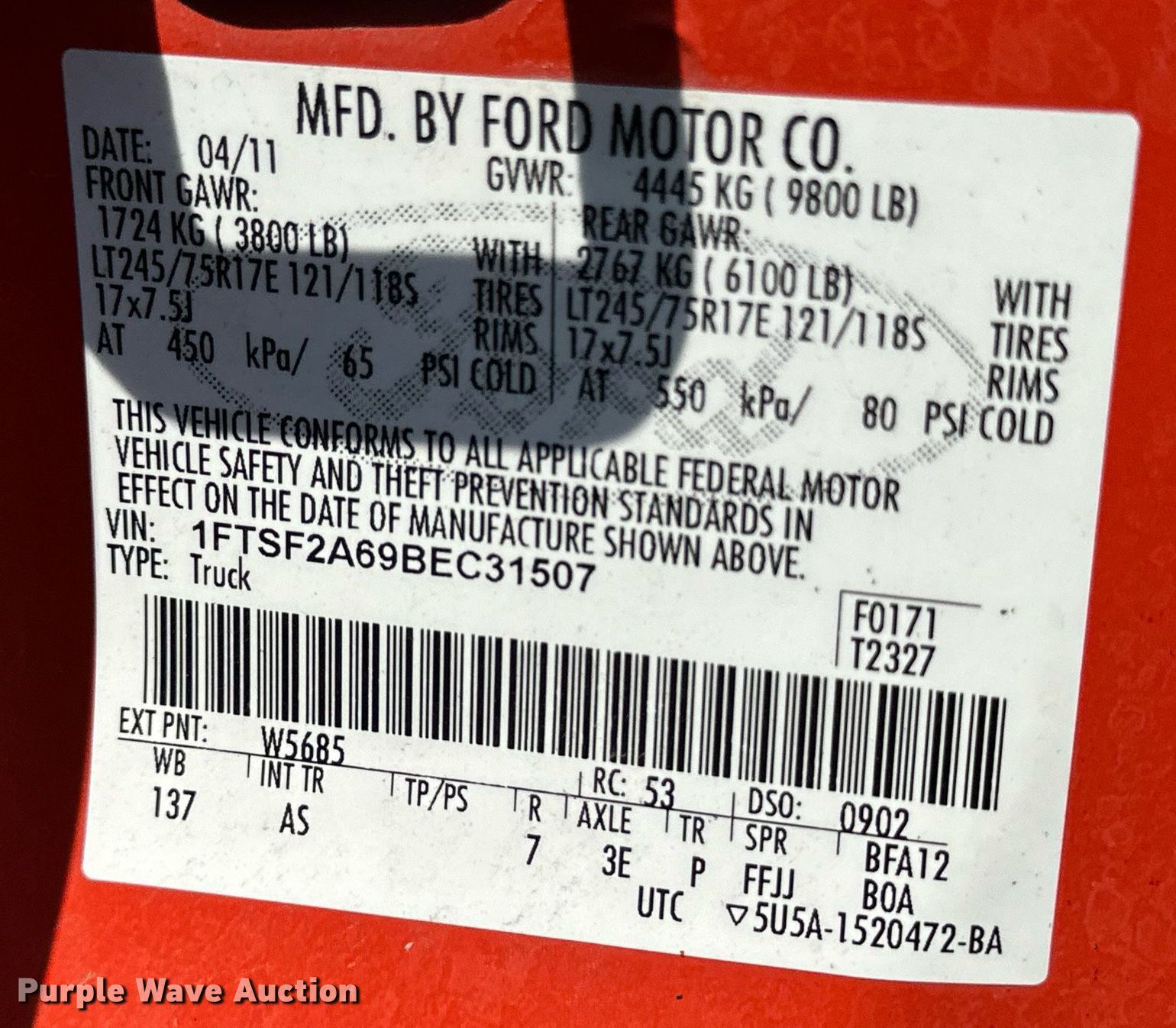 - VIN: 1FTSF2A69BEC31507