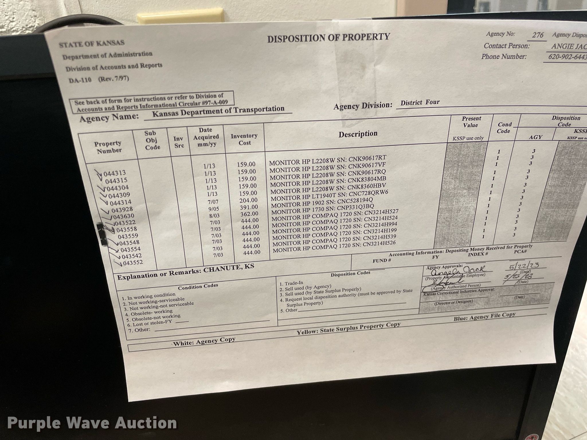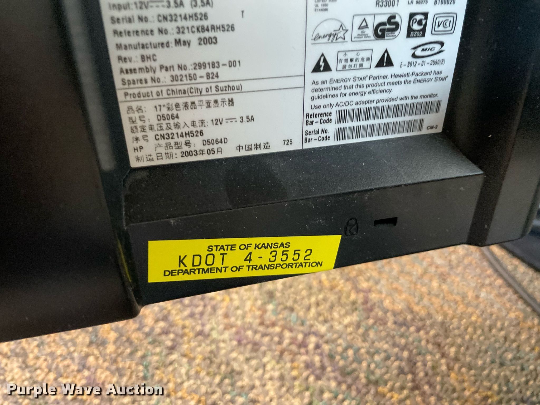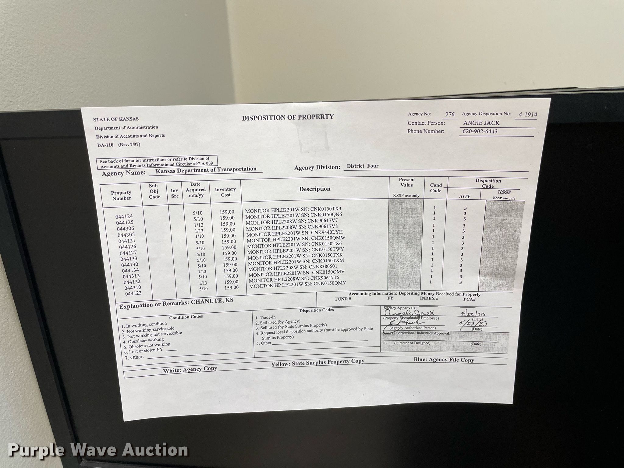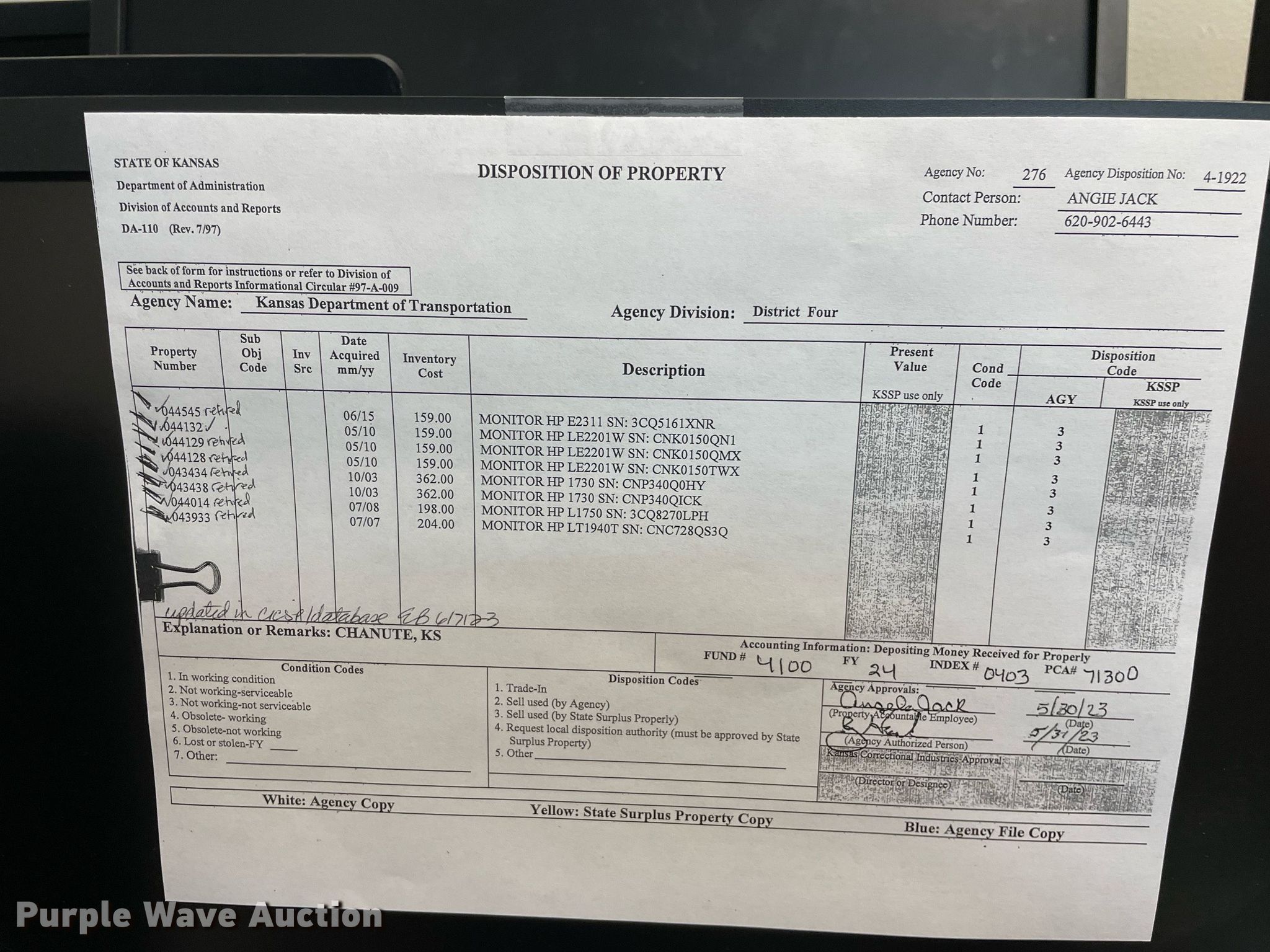 (36) HP monitors. KDOT ID: 043434, 043438, 043522, 043542, 043548, 043552, 043554, 043558, 043559, 043630, 043928, 043933, 044014, 044121, 044122, 044123, 044124, 044125, 044126, 044127, 044128, 044129, 044130, 044132, 044133, 044134, 044304, 044305, 044306, 044309, 044310, 044312, 044313, 044314, 044315, 044545. View inventory for more information. Purple Wave reserves the right to obtain additional buyer information prior to item removal. Kansas Department of Transportation - Chanute IT. 411 W 14th St. Chanute, KS 66720