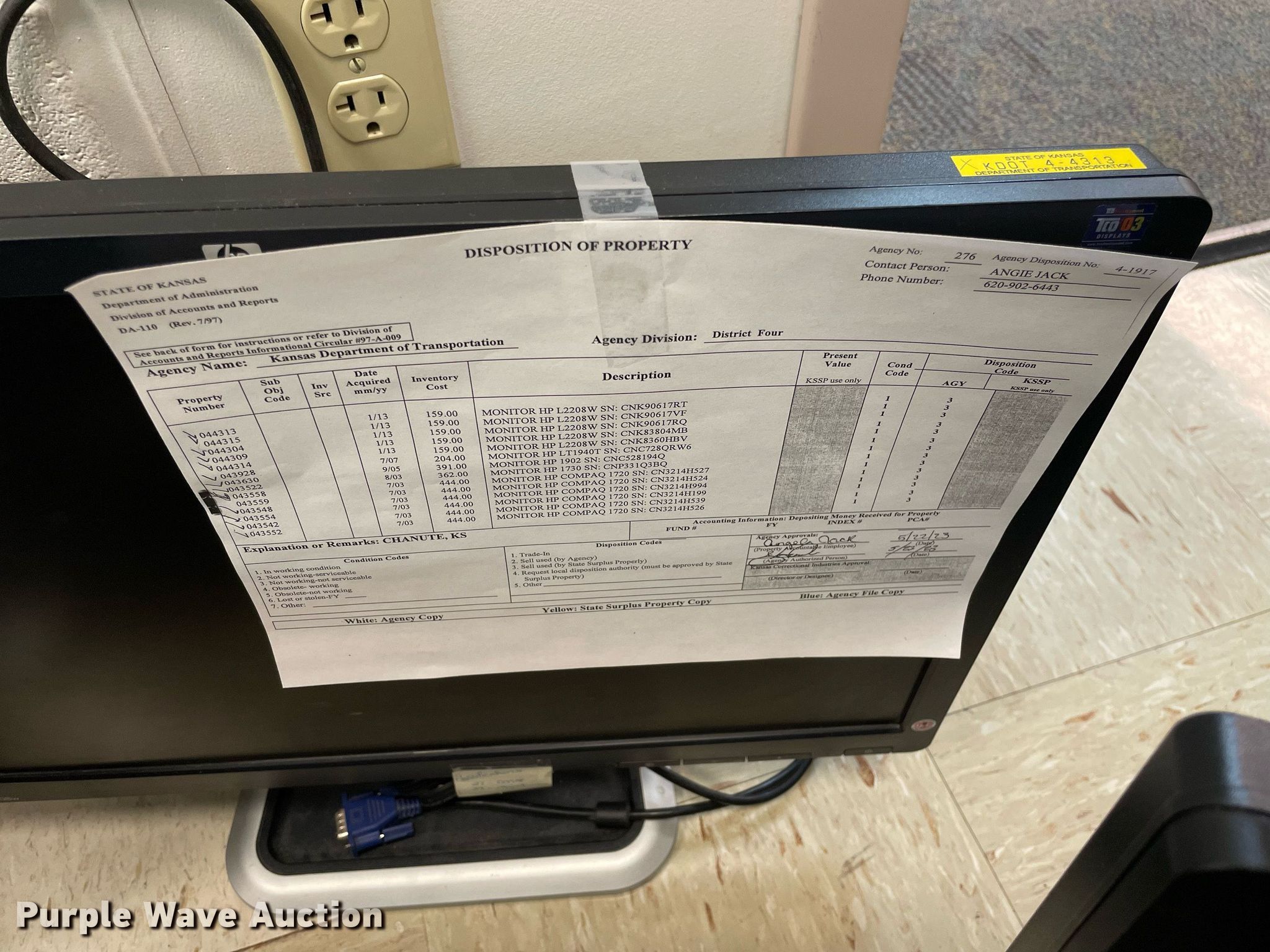 Purple Wave is selling a used Computers in Kansas. This item is a (36) HP monitors with the following: KDOT ID: 043434, 043438, 043522, 043542, 043548, 043552, 043554, 043558, 043559, 043630, 043928, 043933, 044014, 044121, 044122, 044123, 044124, 044125, 044126, 044127, 044128, 044129, 044130, 044132, 044133, 044134, 044304, 044305, 044306, 044309, 044310, 044312, 044313, 044314, 044315, 044545
