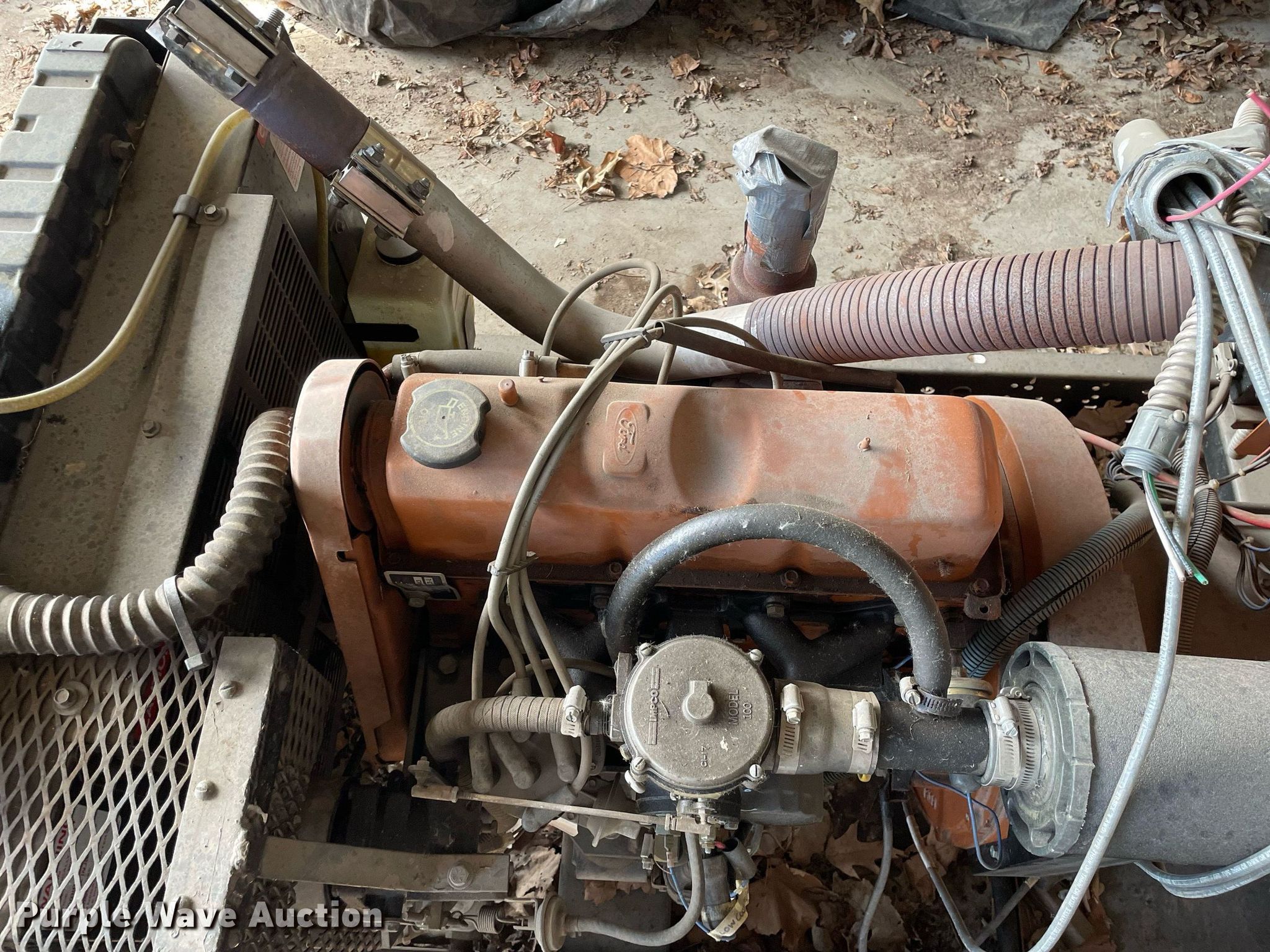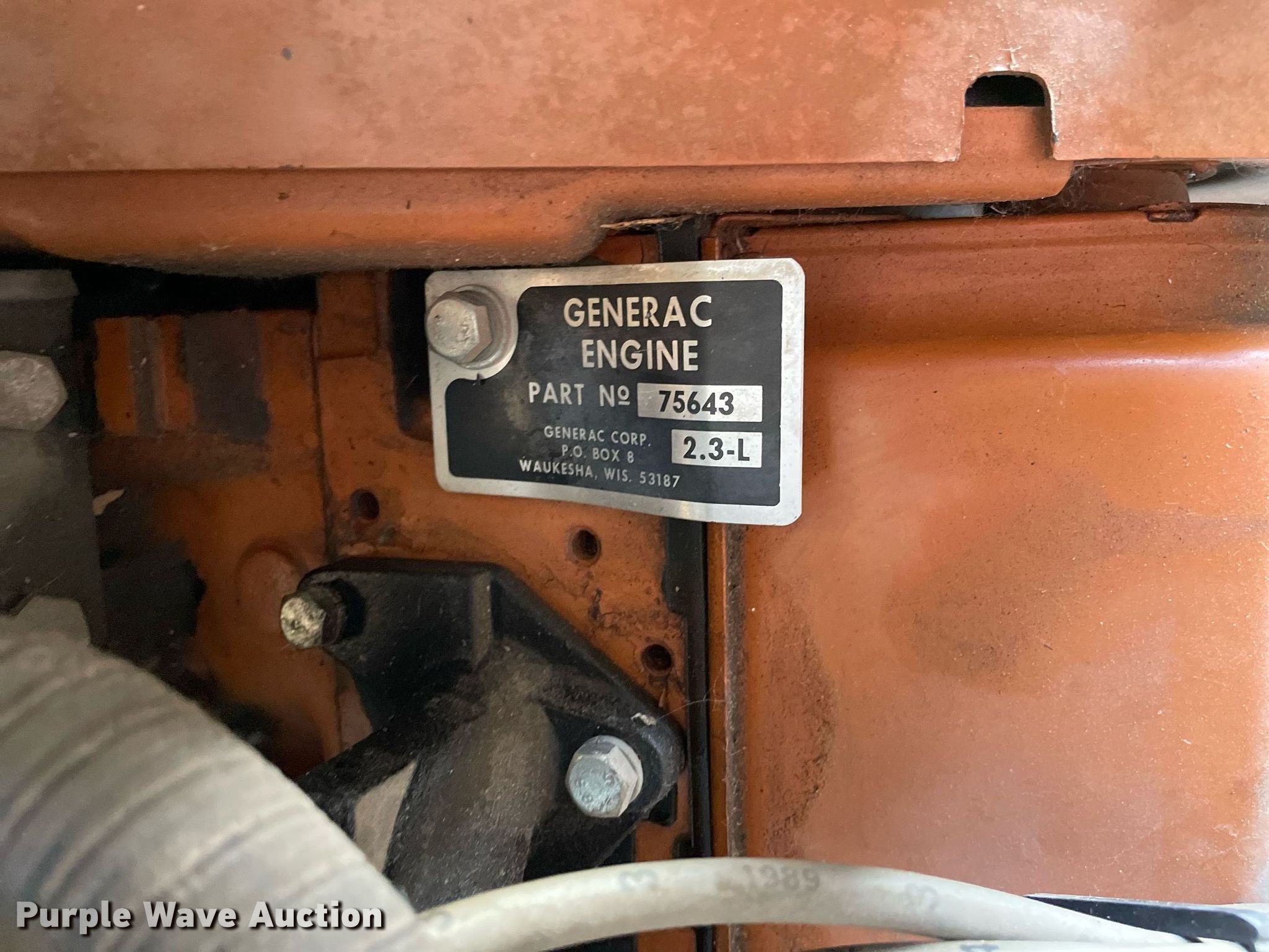 1991 Generac SG015 generator. Hours: 518 on meter, Serial: 20000103, KDOT ID: 541-4031. Engine Ford 75643, Displacement: 2.3L, Cylinders: 4, Fuel type: Natural gas. Features Generator Generac 91A02850-S, kVA: 15, kW: 15, Phase: Single, Electric start, Skid mounted. Kansas Department of Transportation - Chanute Shop. 411 W 14th St. Chanute, KS 66720