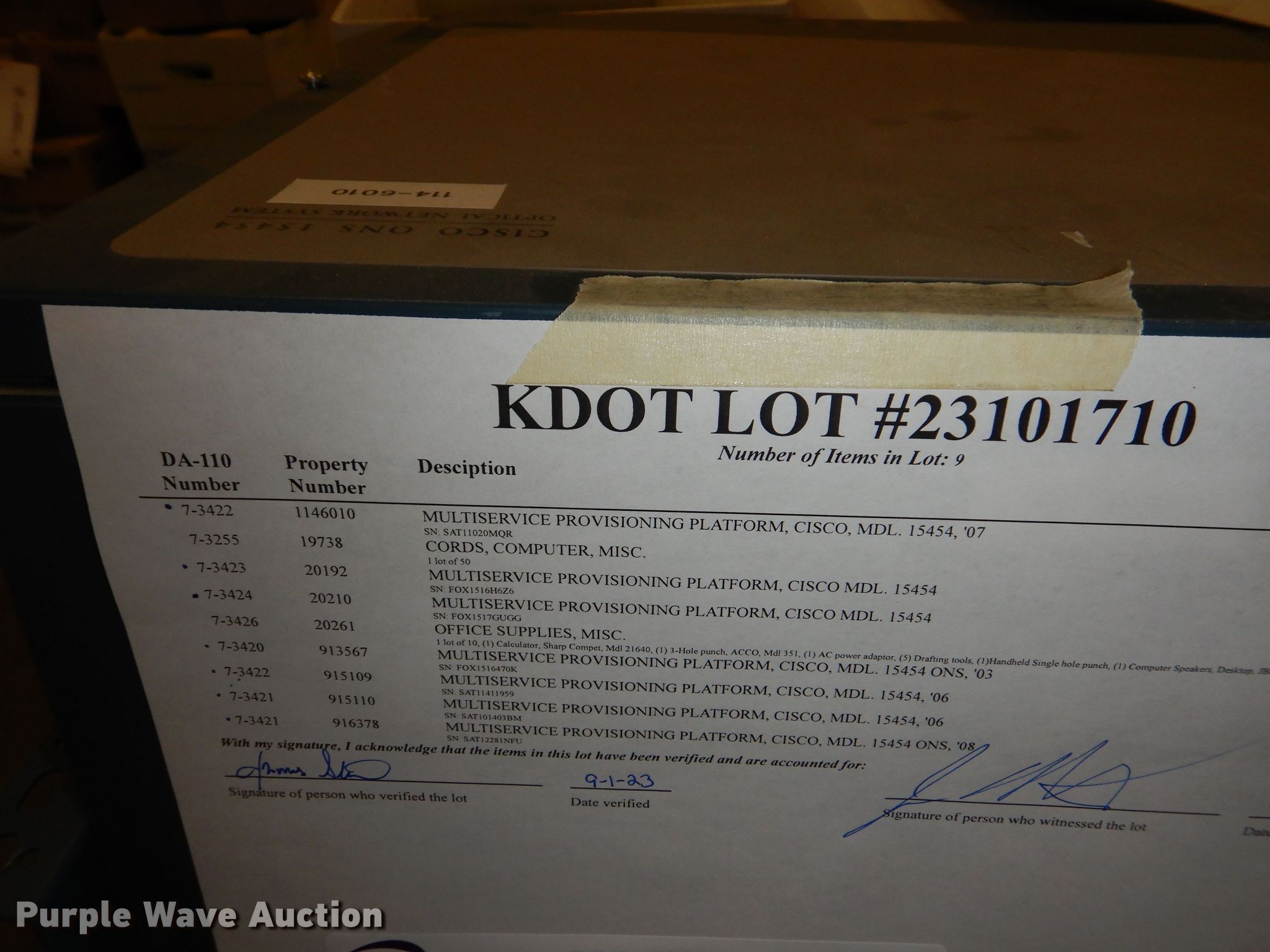 Electronics. (7) Cisco 15454 multiservice provisioning platforms, Sharp Compet 21640 calculator, Acco 351 three hole punch, AC power adapter, (5) drafting tools, Single hole punch, JBL SP08A11 speakers, (50) computer cords, KDOT ID: 23101710. View inventory for more information. Purple Wave reserves the right to obtain additional buyer information prior to item removal. Kansas Department of Transportation - Topeka Warehouse. 2035 SW Western Ave. Topeka, KS 66604