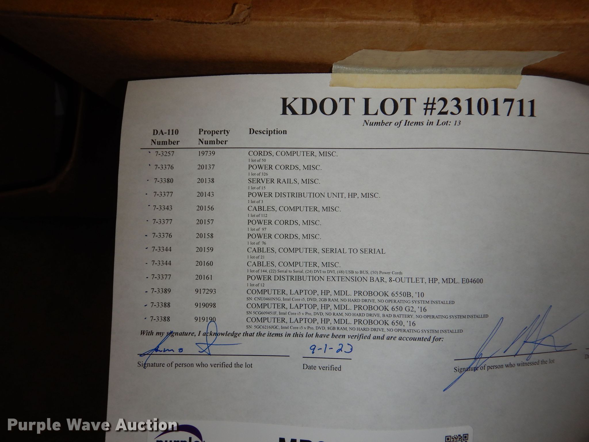 Electronics. (2) HP Probook 650 laptops, HP Probook 6550B laptop, (12) HP E04600 eight outlet power distribution extension bars, (3) HP power distributors, (15) server rails, (499) power cords, (327) computer cables, KDOT ID: 23101711. View inventory for more information. Purple Wave reserves the right to obtain additional buyer information prior to item removal. Kansas Department of Transportation - Topeka Warehouse. 2035 SW Western Ave. Topeka, KS 66604