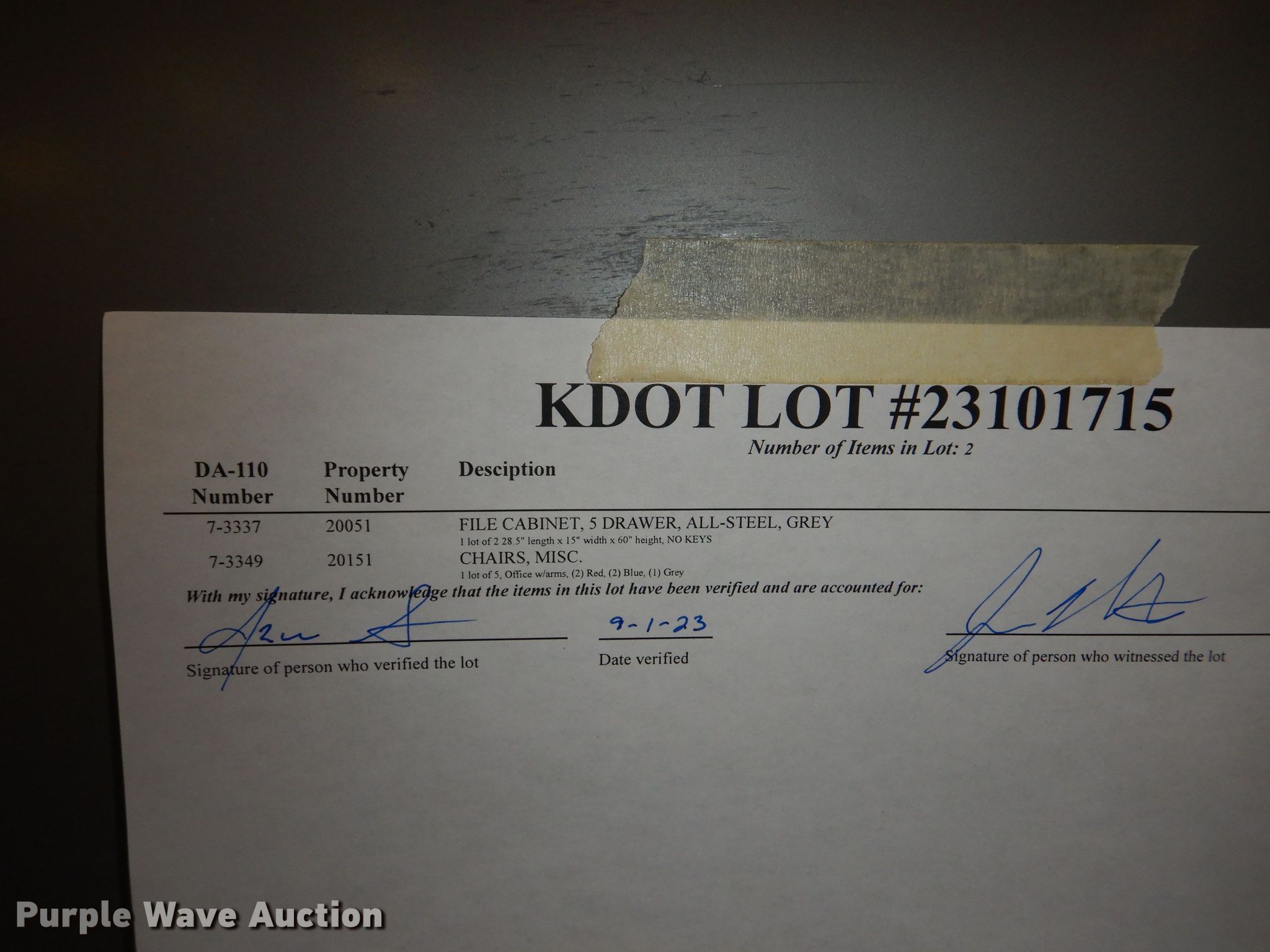 Furniture. (5) chairs, (2) All-Steel five drawer file cabinets 28.5"W x 15"D x 60"H, No keys, KDOT ID: 23101715. View inventory for more information. Kansas Department of Transportation - Topeka Warehouse. 2035 SW Western Ave. Topeka, KS 66604