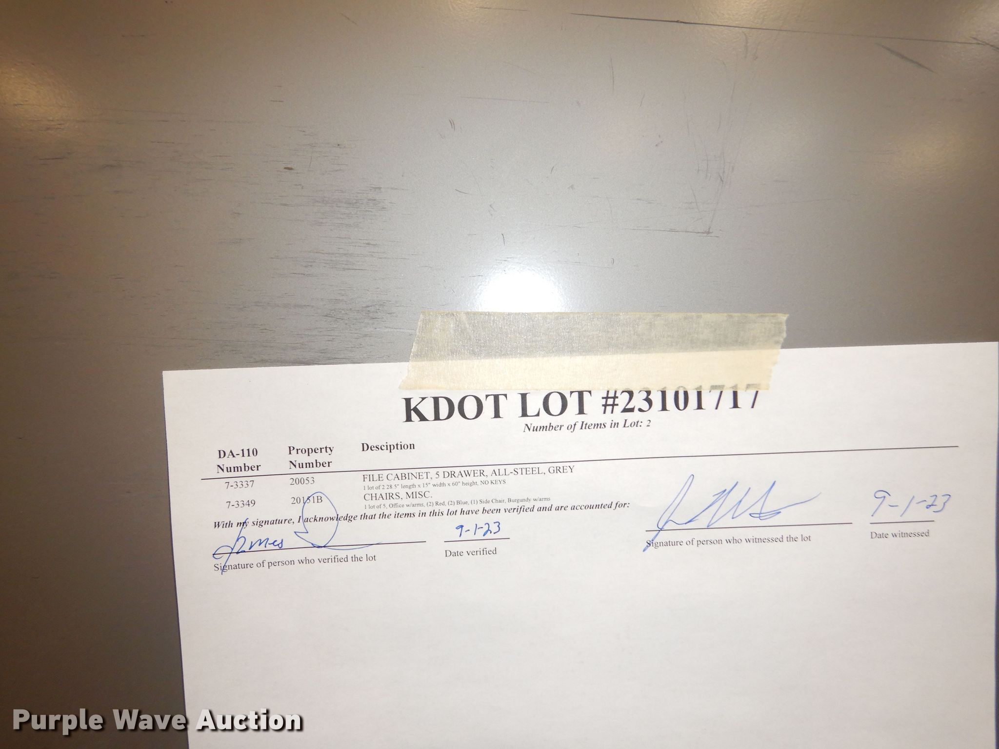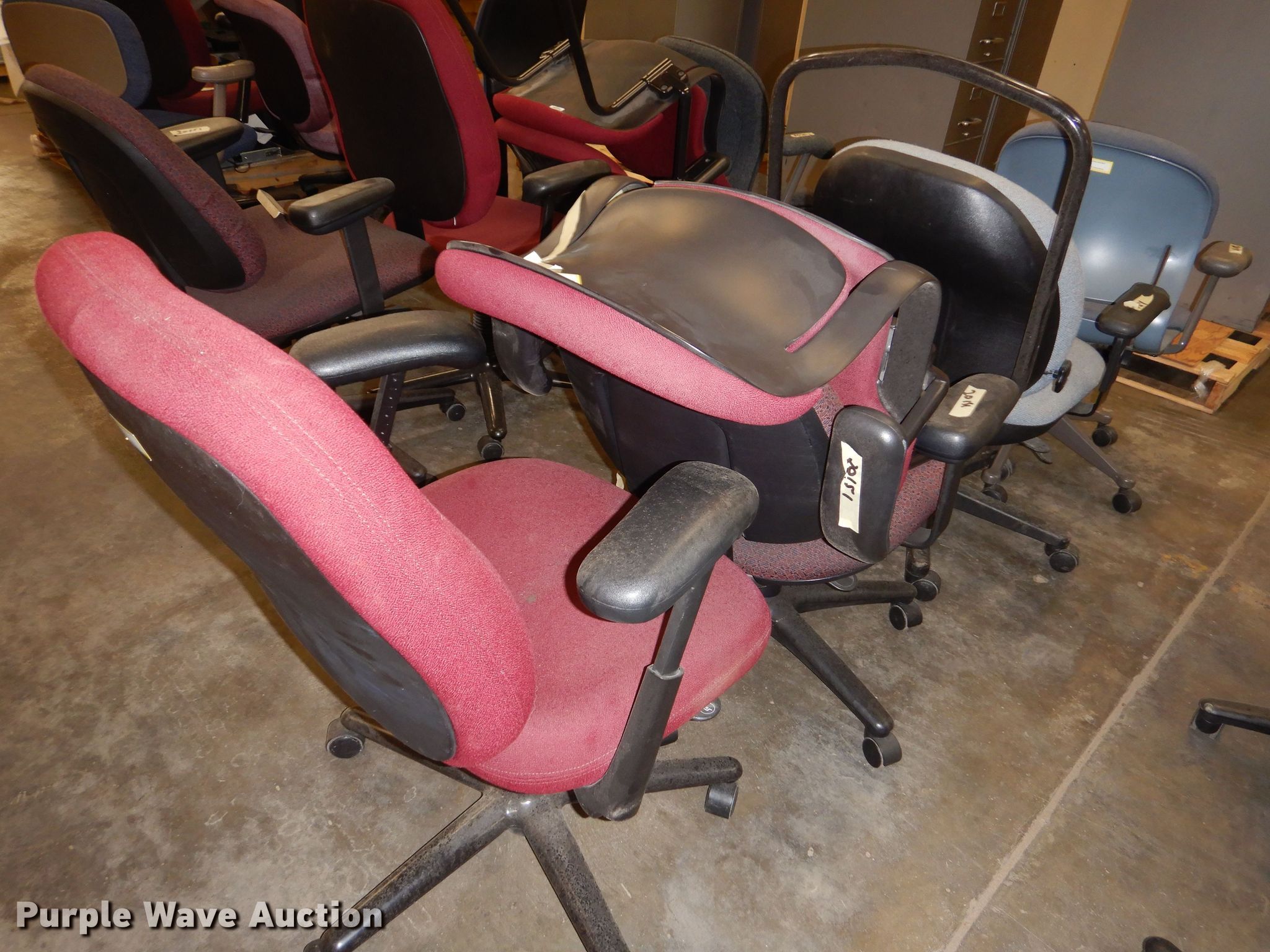 Purple Wave is selling a used Furniture in Kansas. This item is a Furniture with the following: (5) chairs, (2) All-Steel five drawer file cabinets, 28.5"W x 15"D x 60"H, No keys, KDOT ID: 23101717