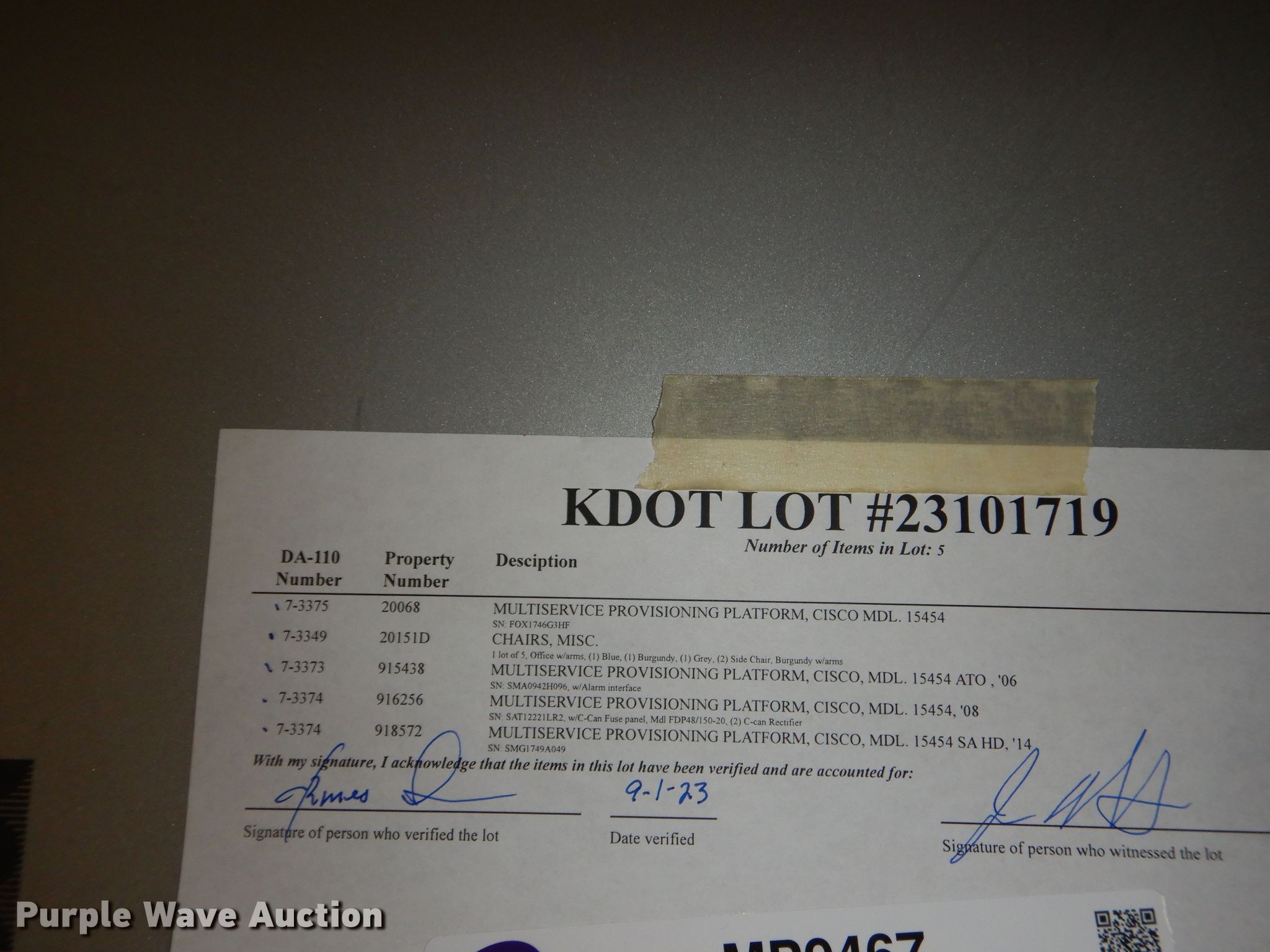 Office supplies and equipment. (5) chairs, (4) Cisco 15454 multiservice provisioning platforms, KDOT ID: 23101719. View inventory for more information. Purple Wave reserves the right to obtain additional buyer information prior to item removal. Kansas Department of Transportation - Topeka Warehouse. 2035 SW Western Ave. Topeka, KS 66604