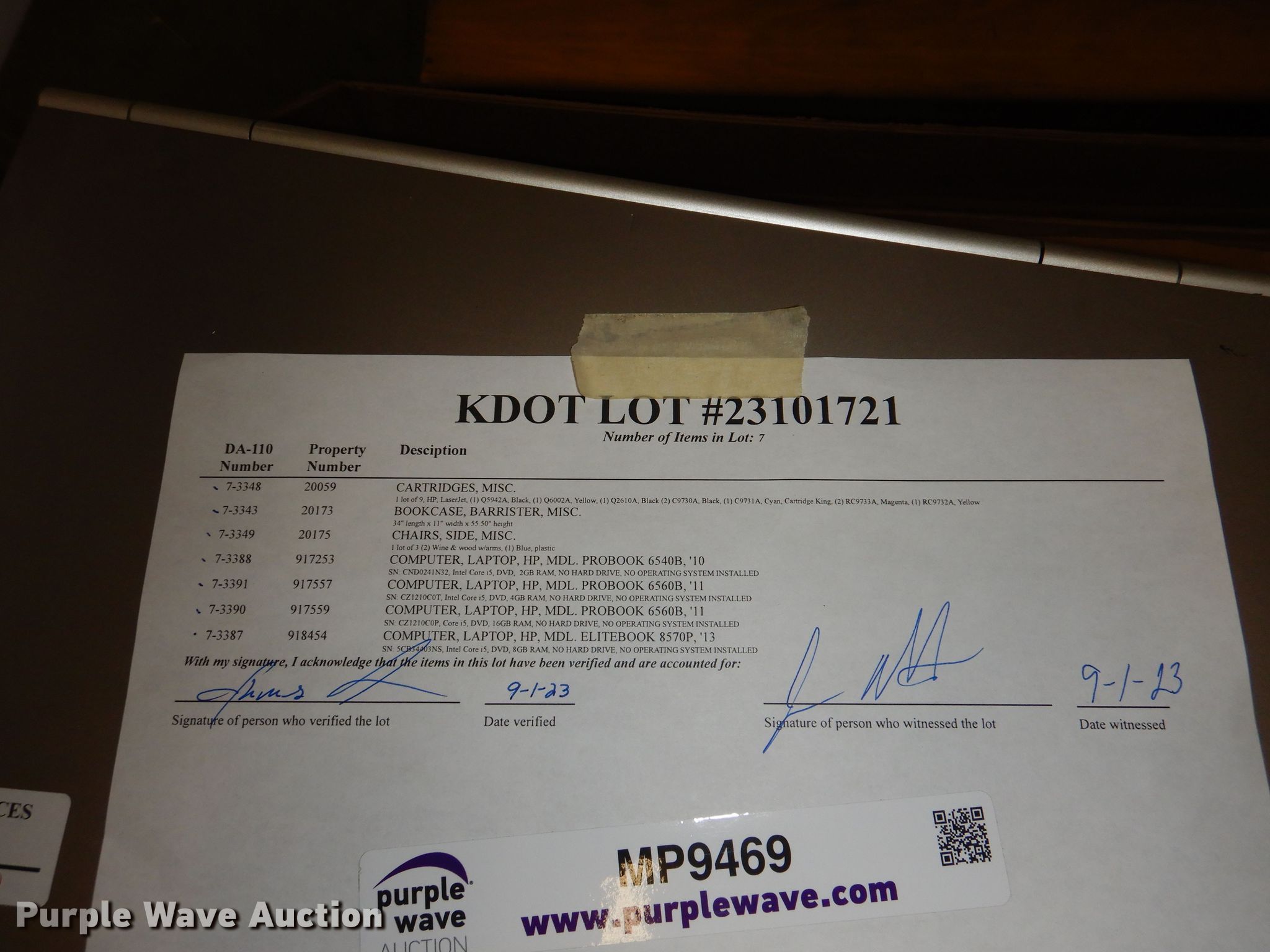 Office supplies and equipment. Barrister bookcase 34"W x 11"D x 55.5"H, (9) ink cartridges, (3) chairs, (6) laptops HP Elitebook 8570P, HP Elitebook 8730W, HP Probook 6460B, HP Probook 6540B, (2) HP Probook 6560B, Hard drives have been reformatted and no operating system installed, KDOT ID: 23101721. View inventory for more information. Purple Wave reserves the right to obtain additional buyer information prior to item removal. Kansas Department of Transportation - Topeka Warehouse. 2035 SW Western Ave. Topeka, KS 66604