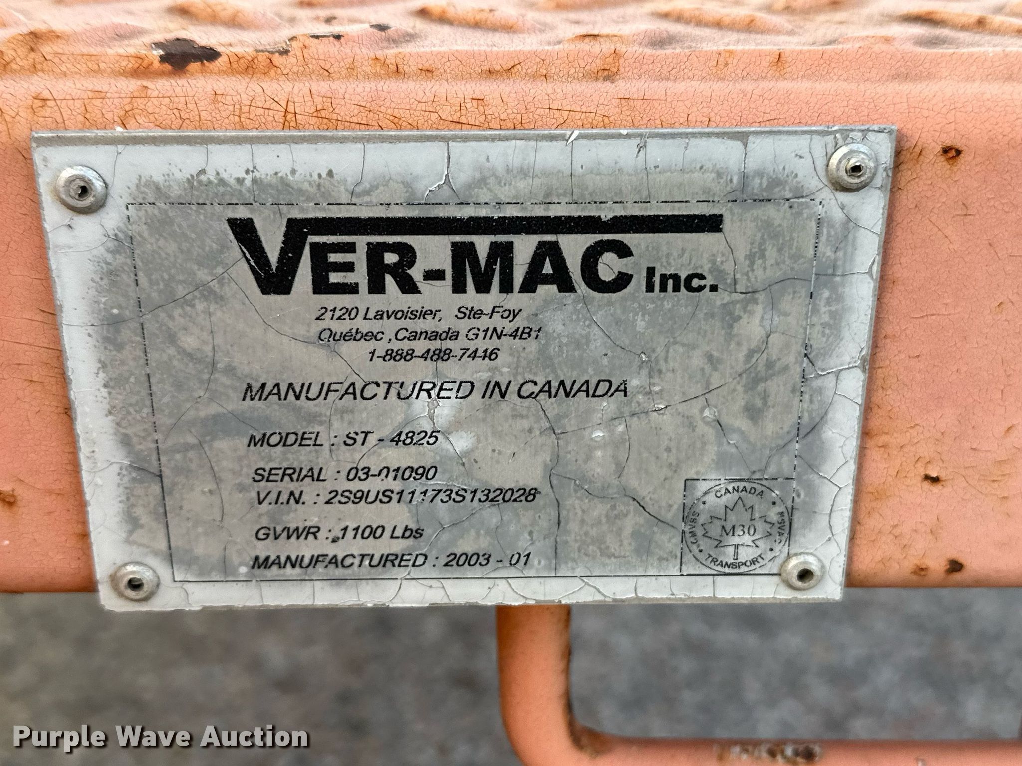 2003 Ver-Mac ST4825 arrow board trailer. VIN: 2S9US11173S132028, Serial: 03-01090, KDOT ID: 552-5033. Features 11'L x 66"W, Solar panel. Tires Size: 205/75R15. Notes Dead batteries , Non-operational unit. Transfer of ownership documentation will be a bill of sale. Kansas Department of Transportation - Hutchinson Shop. 500 N. Hendricks. Hutchinson, KS 67501