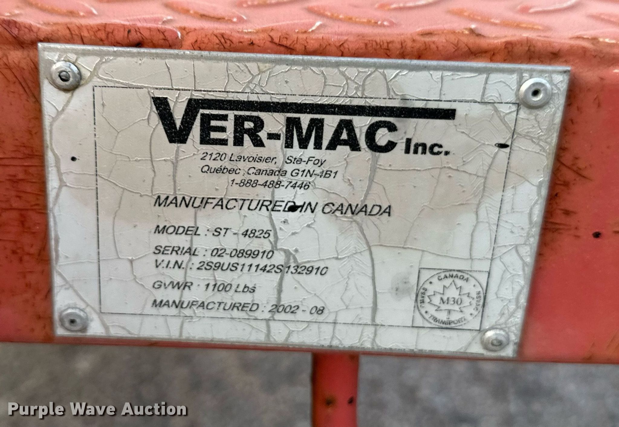 2002 Ver-Mac ST4825 arrow board trailer. VIN: 2S9US11142S132910, Serial: 02-089910, KDOT ID: 552-5072. Features 11'L x 66"W, Solar panel. Tires Size: 205/75R15. Notes Dead batteries , Non-operational unit. Transfer of ownership documentation will be a bill of sale. Kansas Department of Transportation - Hutchinson Shop. 500 N. Hendricks. Hutchinson, KS 67501