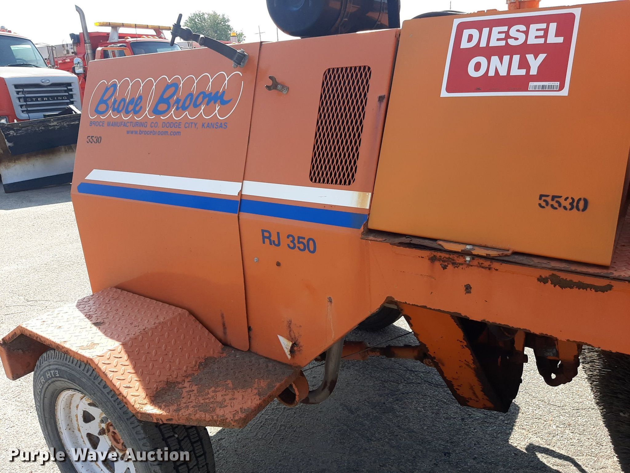 2008 Broce RJ350 broom. Hours: 1,311 on meter, Serial: 406333, KDOT ID: 689-5028. Engine John Deere, Cylinders: 4. Transmission Hydrostatic. Chassis Suspension: Spring, Brakes: Hydraulic. Operators station Enclosed cab, AC, Heat. Features Broom Width: 96", Front blade Width: 96", Water spray system. Tires Size: 225/75R16. Notes Dead battery, Front end issues, tie rods broken, Unknown operating condition. Kansas Department of Transportation - Hutchinson Shop. 500 N. Hendricks. Hutchinson, KS 67501
