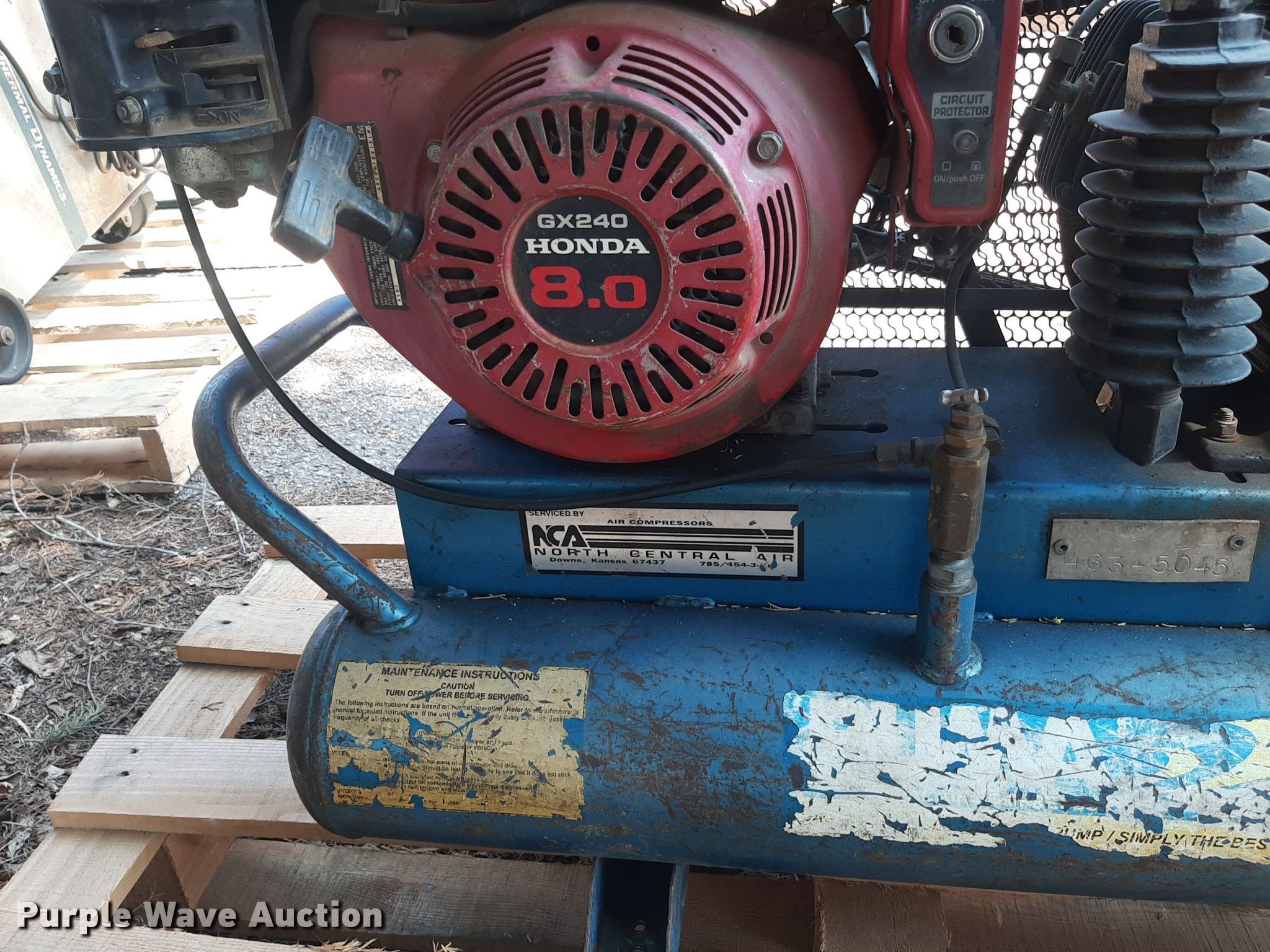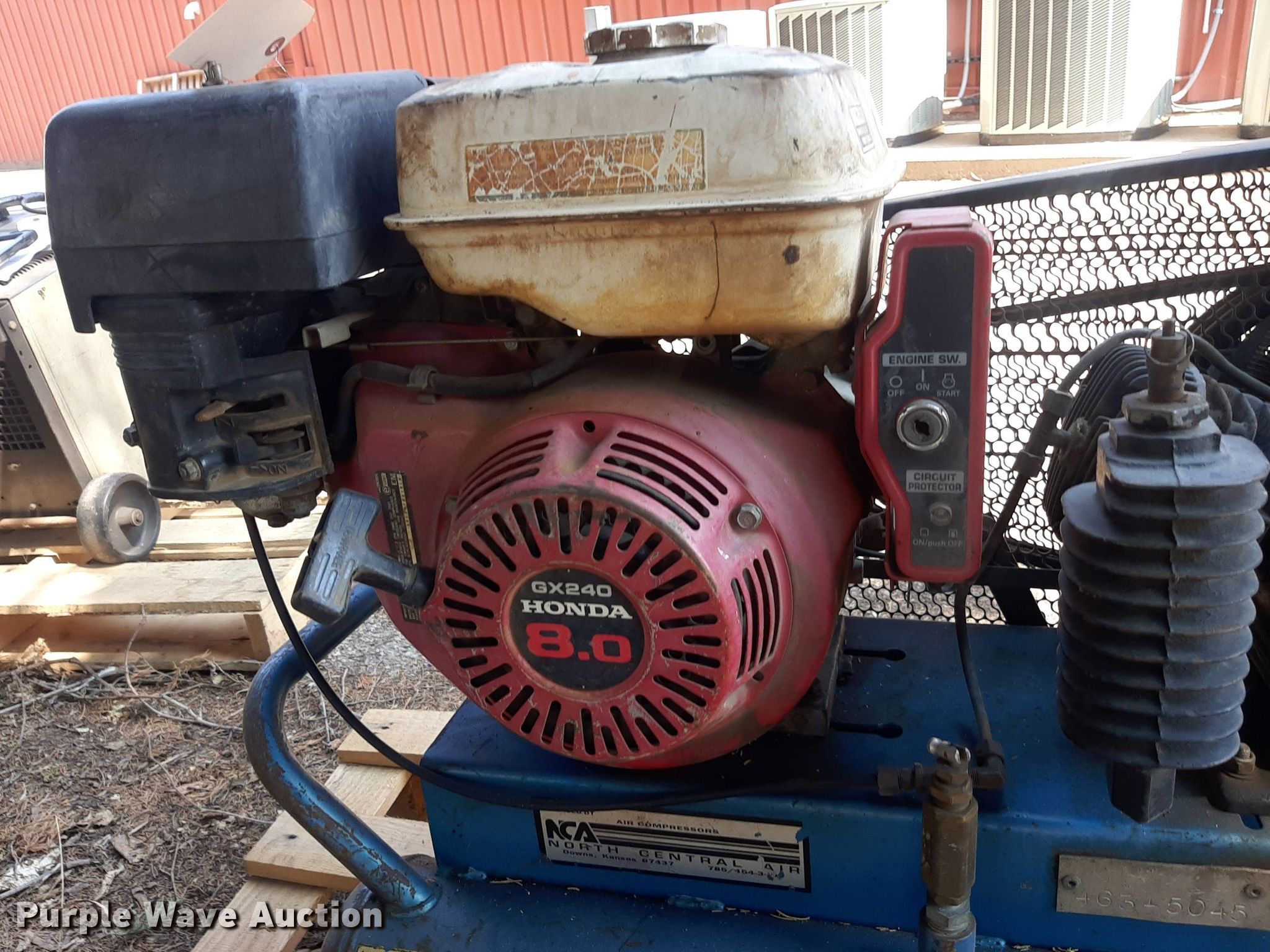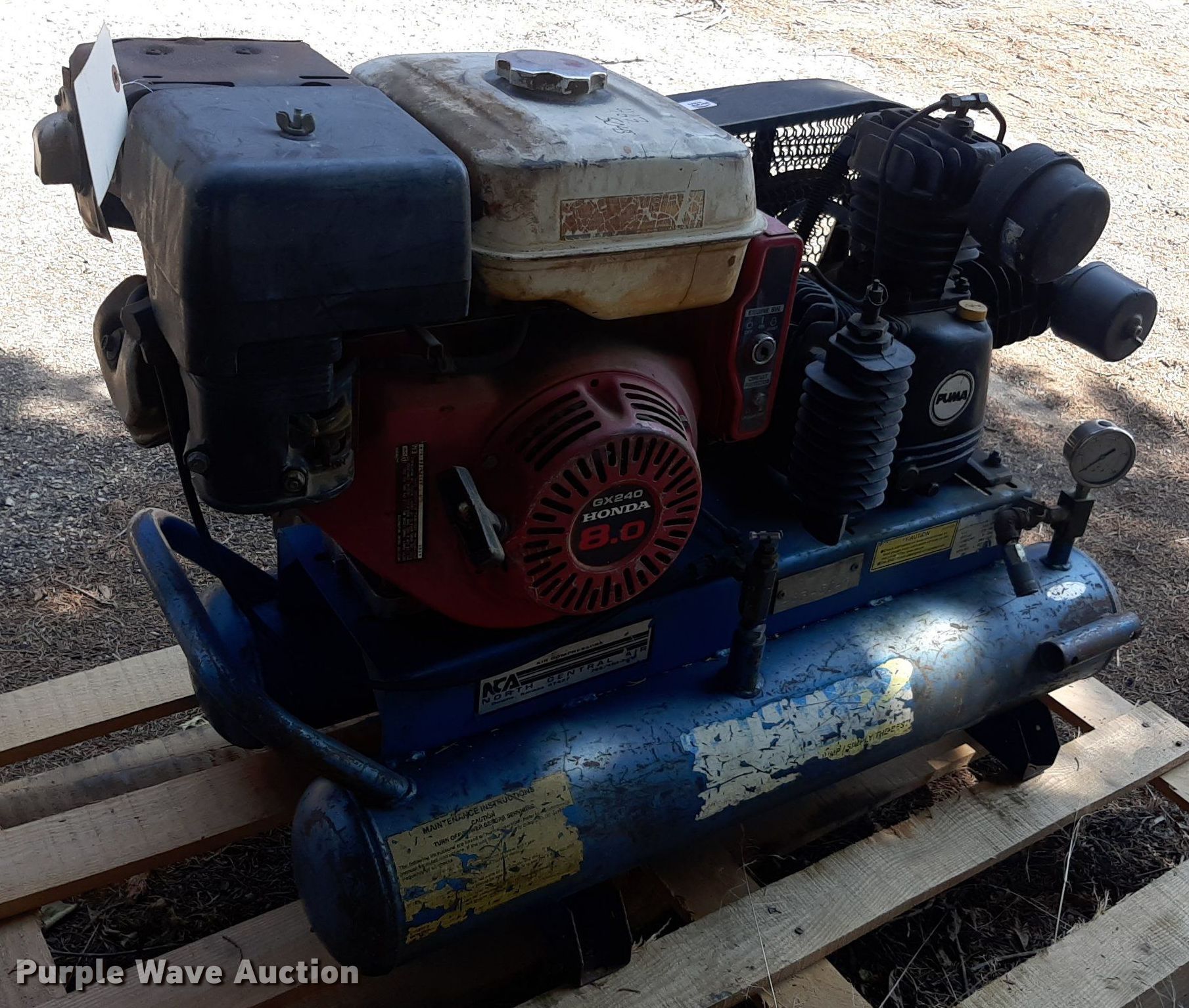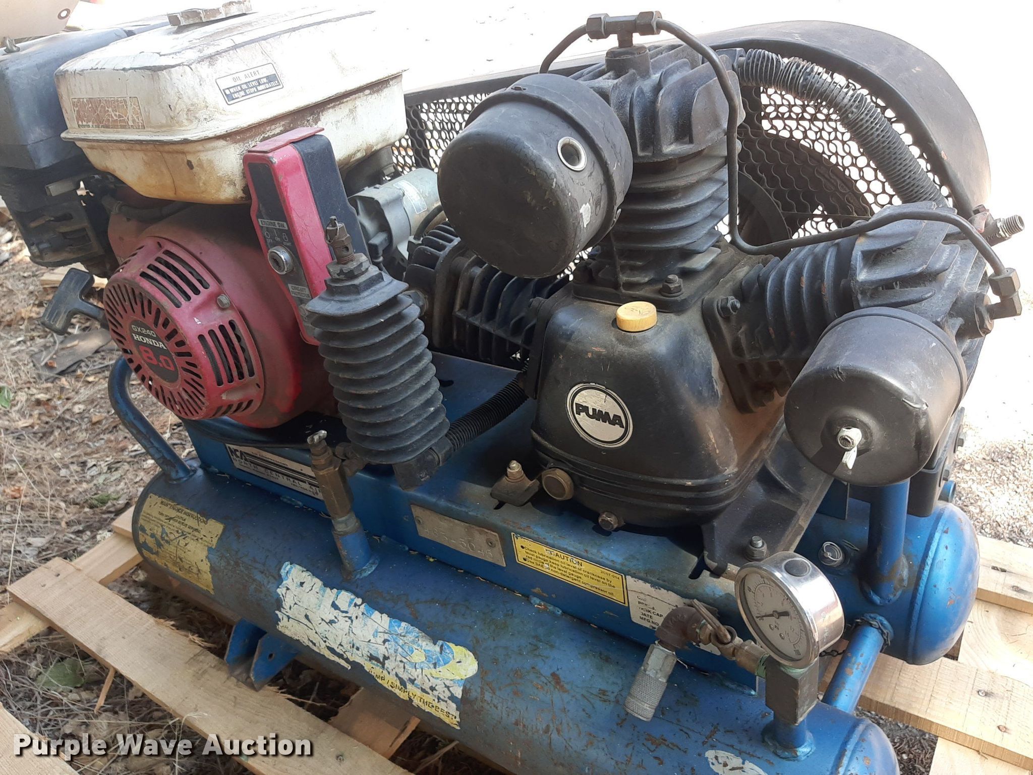2005 Puma TUE8008G air compressor. Serial: 05112236, KDOT ID: 463-5045. Engine Honda GX240, Cylinders: 1, Fuel type: Gas, HP: 8. Features CFM: 14.8, PSI: 175, Tank capacity: 16 gallons. Notes Non-operational unit. Kansas Department of Transportation - Hutchinson Shop. 500 N. Hendricks. Hutchinson, KS 67501