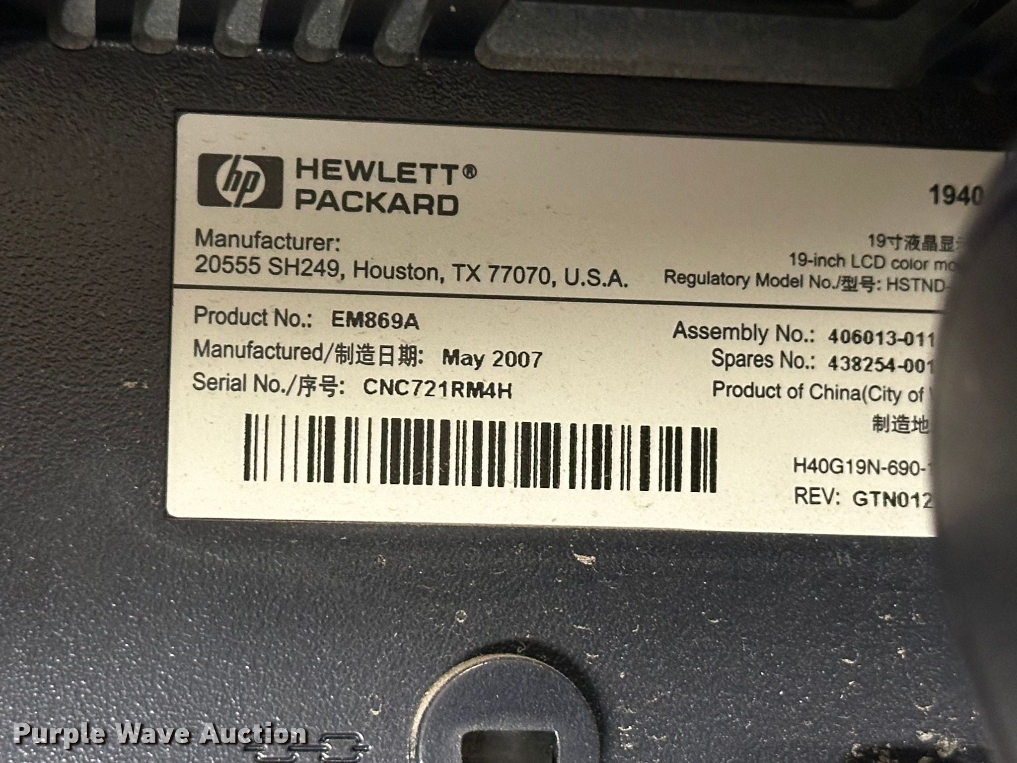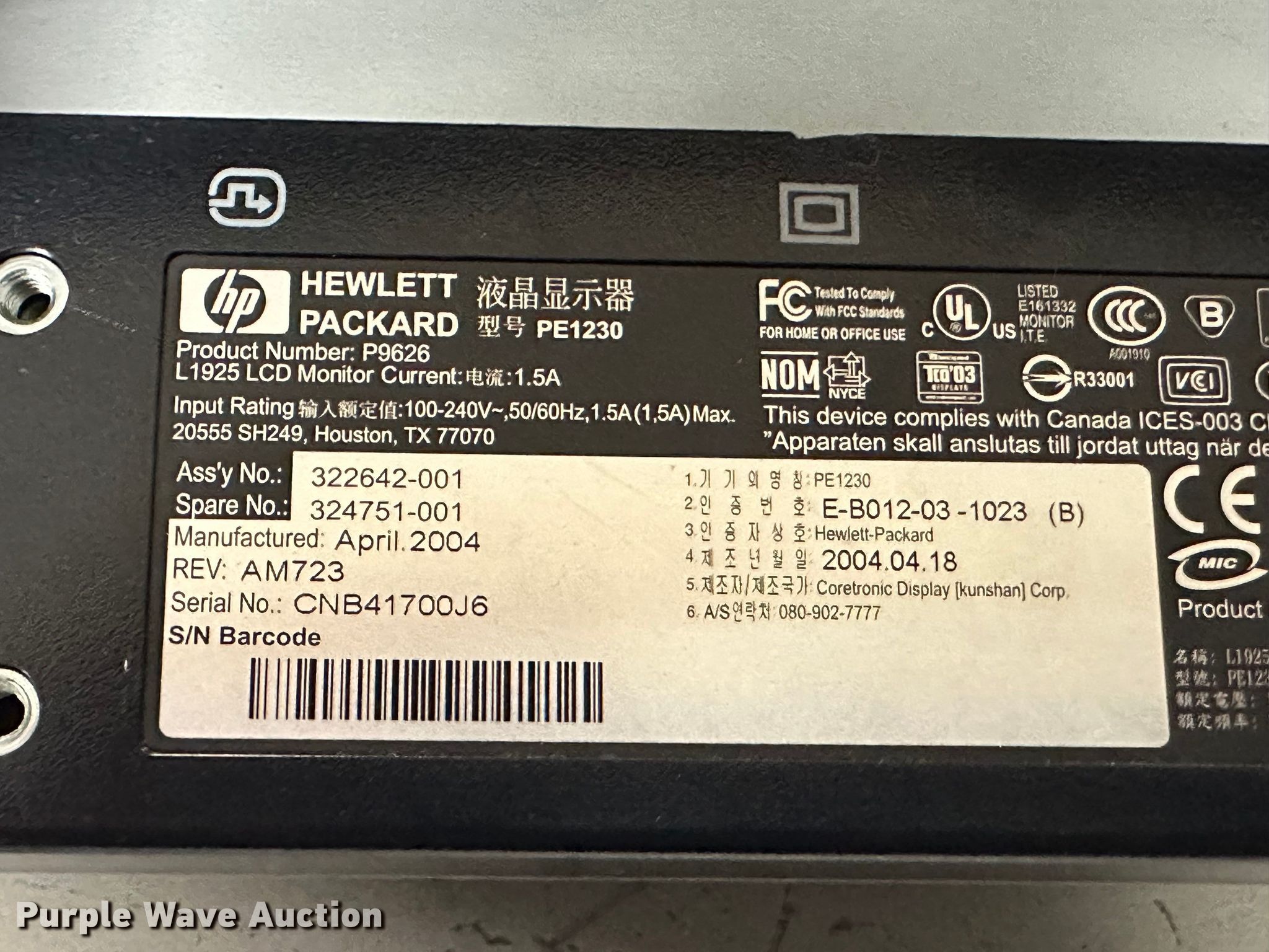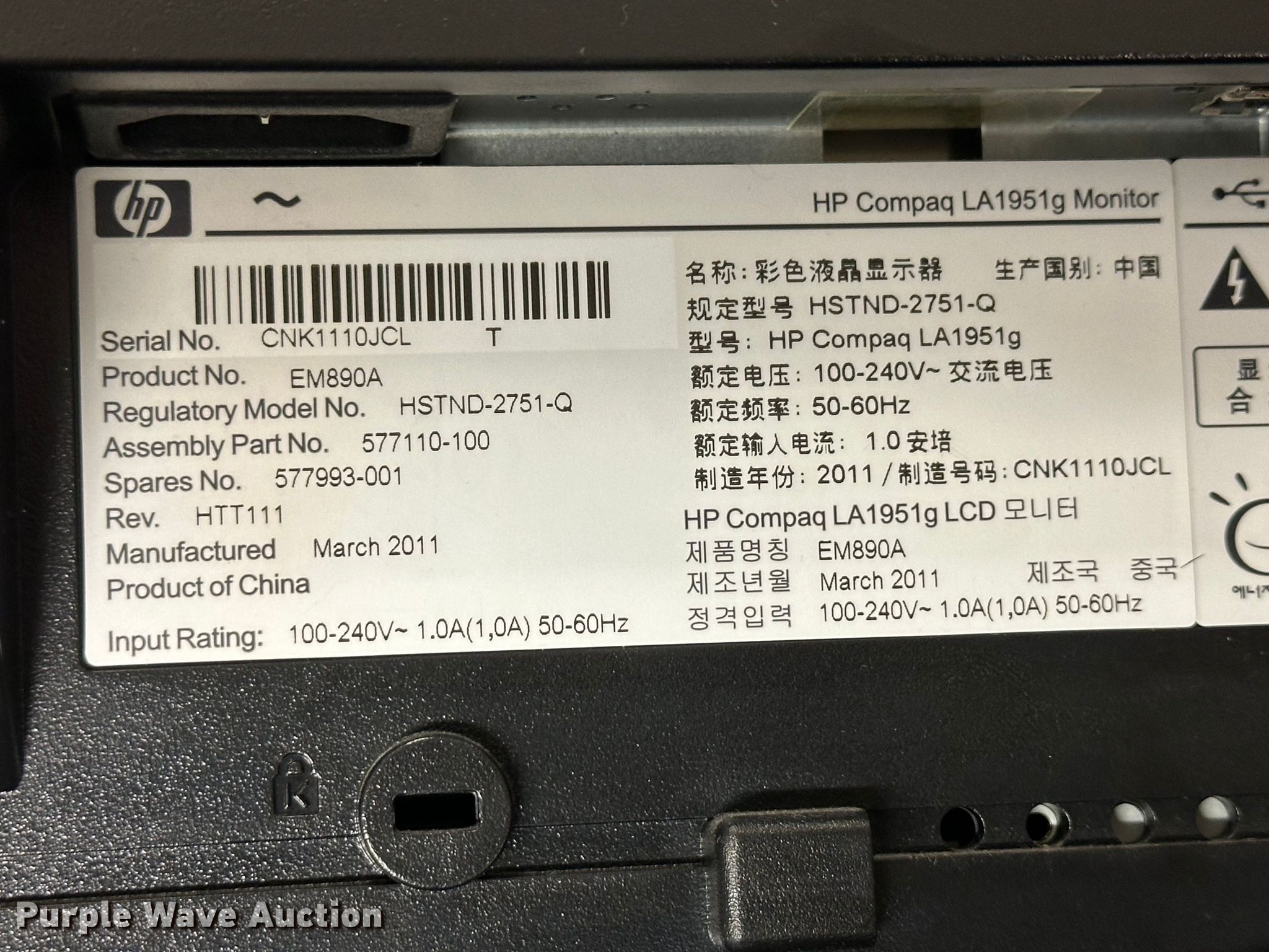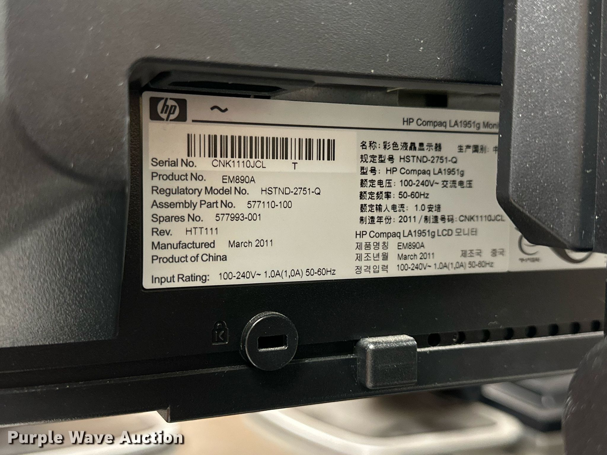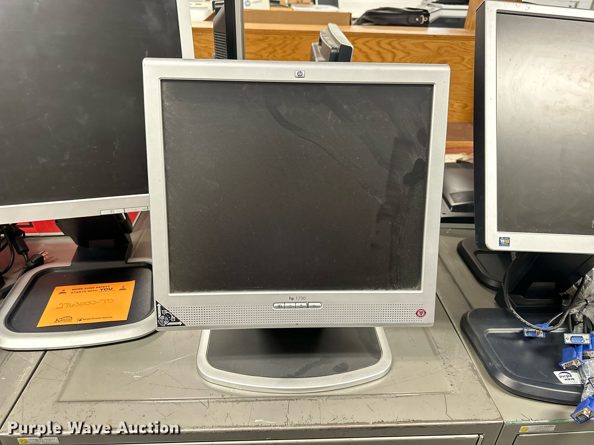 Purple Wave is selling a used Computers in Kansas. This item is a (10) HP monitors with the following: (2) model: L1950, Model: LA1951G, Model: L1730, (2) model: L1740, Model: L1925, Model: L2045W, (2) model: L2245WG, KDOT ID: D3-23101710