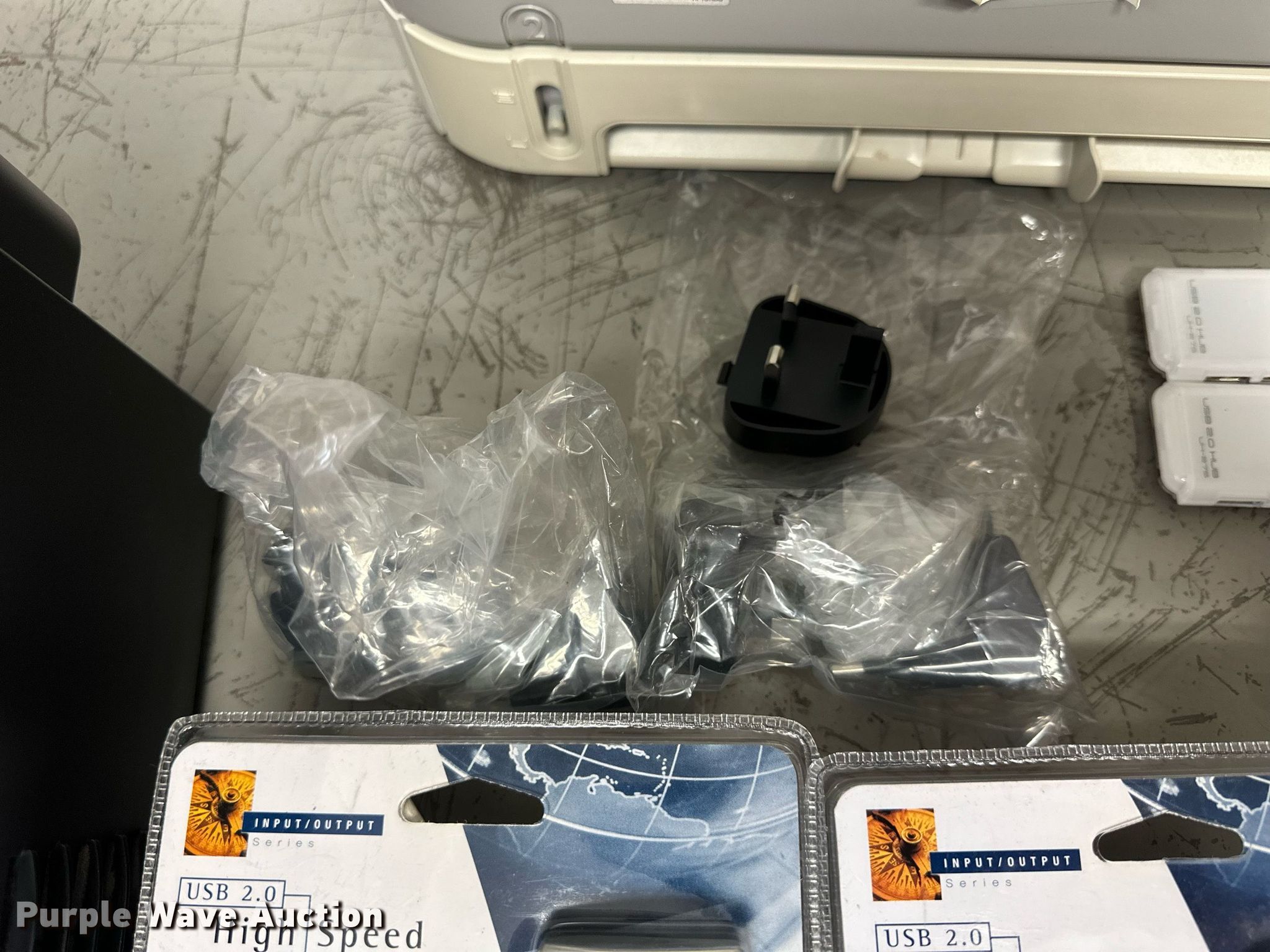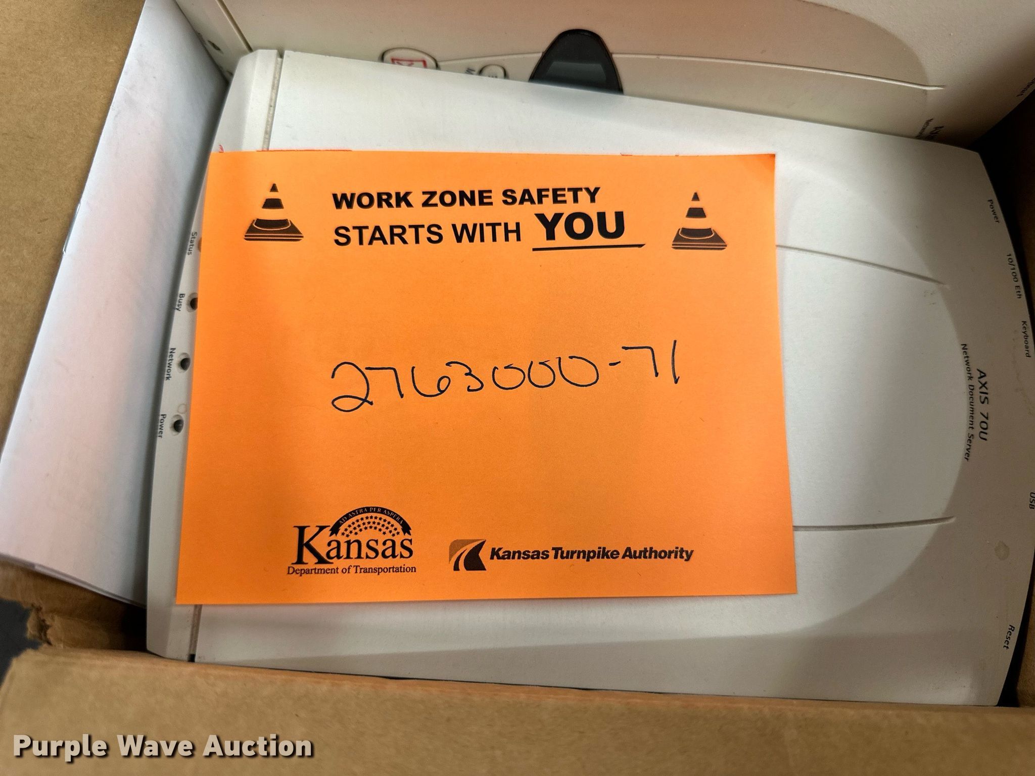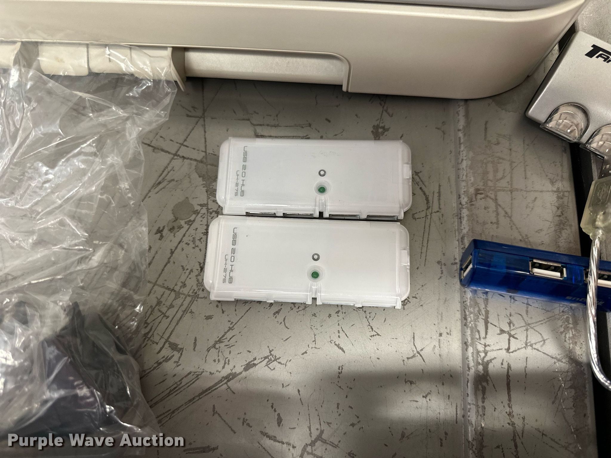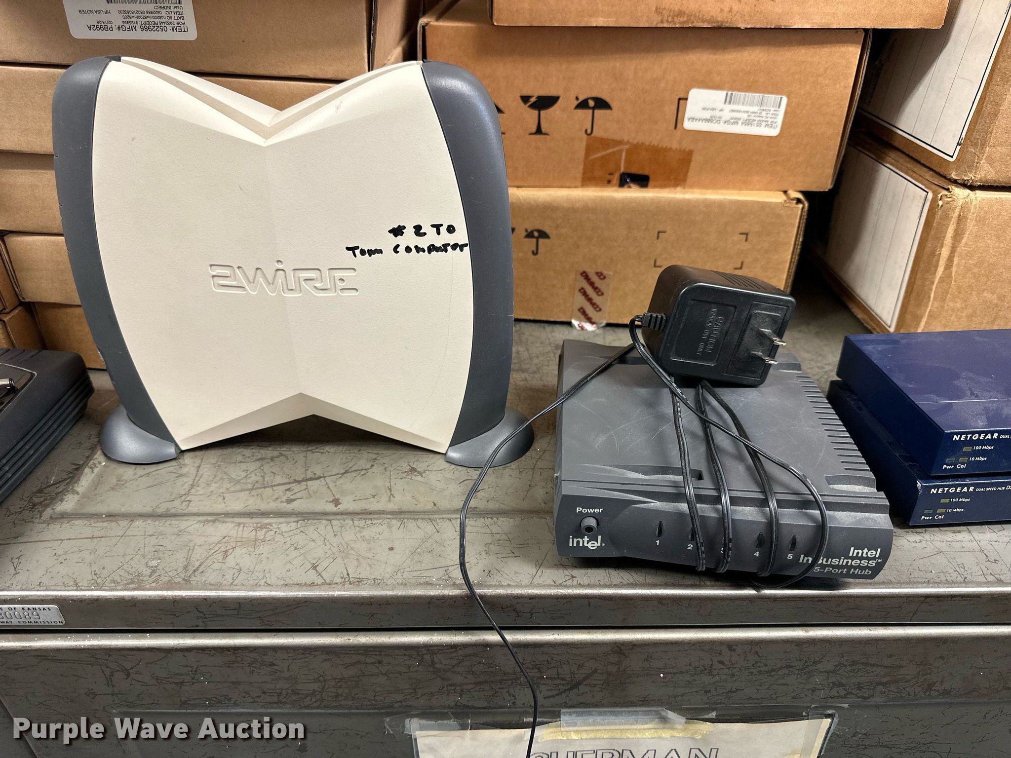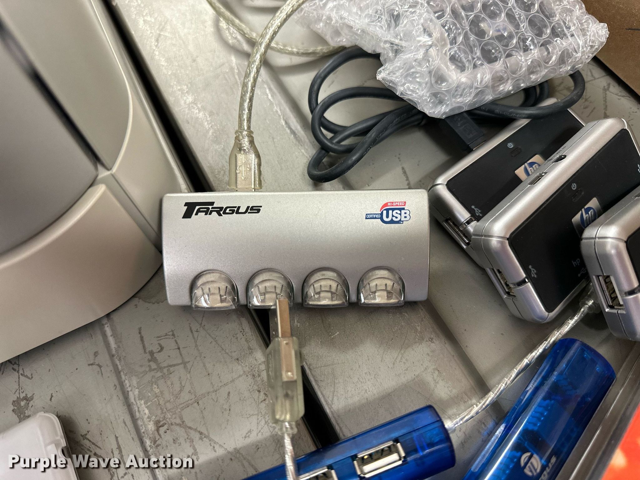 Purple Wave is selling a used Electronics in Kansas. This item is a Electronics with the following: (5) Axis 70U network document servers, (5) HP PB994A batteries, (7) HP PB992A batteries, HP PB993A battery, (7) HP QK643AA batteries, (18) NX 9600 180W AC adapters, (3) Sierra Airlink LS300, (3) Raven X wireless V4228, (7) DSL routers, (4) sets of speakers, (59) HP speaker bars, (8) Tarsus port hubs, (7) HP four port USB hubs, Armada HDD BAY, (30) DVI cables, (31) power supplies, (4) computer power controls, Netgear FA300, (6) Netgear eight port hubs, (2) HP Jetdirect300x, (2) HP Jetdirect175x, Jabara GN9330E, (19) wall adapters, (2) Linksys Wireless G access point WAP54G, (2) Linksys WPC54G, Laptop monitor stand, HP XB2000 Notebook expansion base, Intel five port hub, KDOT ID: D3-23101703