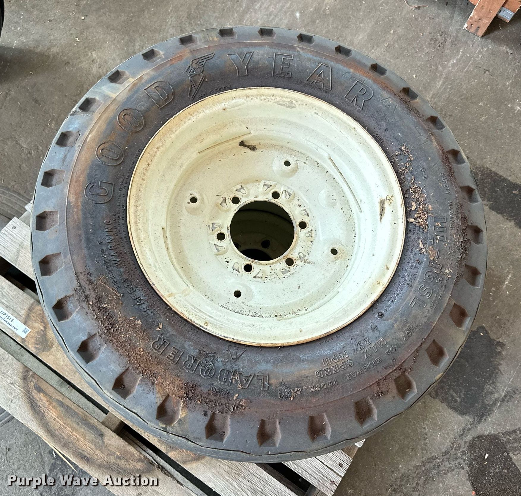 (4) tires and wheels. Harvest King 11L-16, Titan 11L-16SL Wheel bent, Hole in tire, (2) Goodyear 11L-16SL, KDOT ID: 3-2321. Kansas Department of Transportation - Norton. 312 S 2nd Ave. Norton, KS 67654
