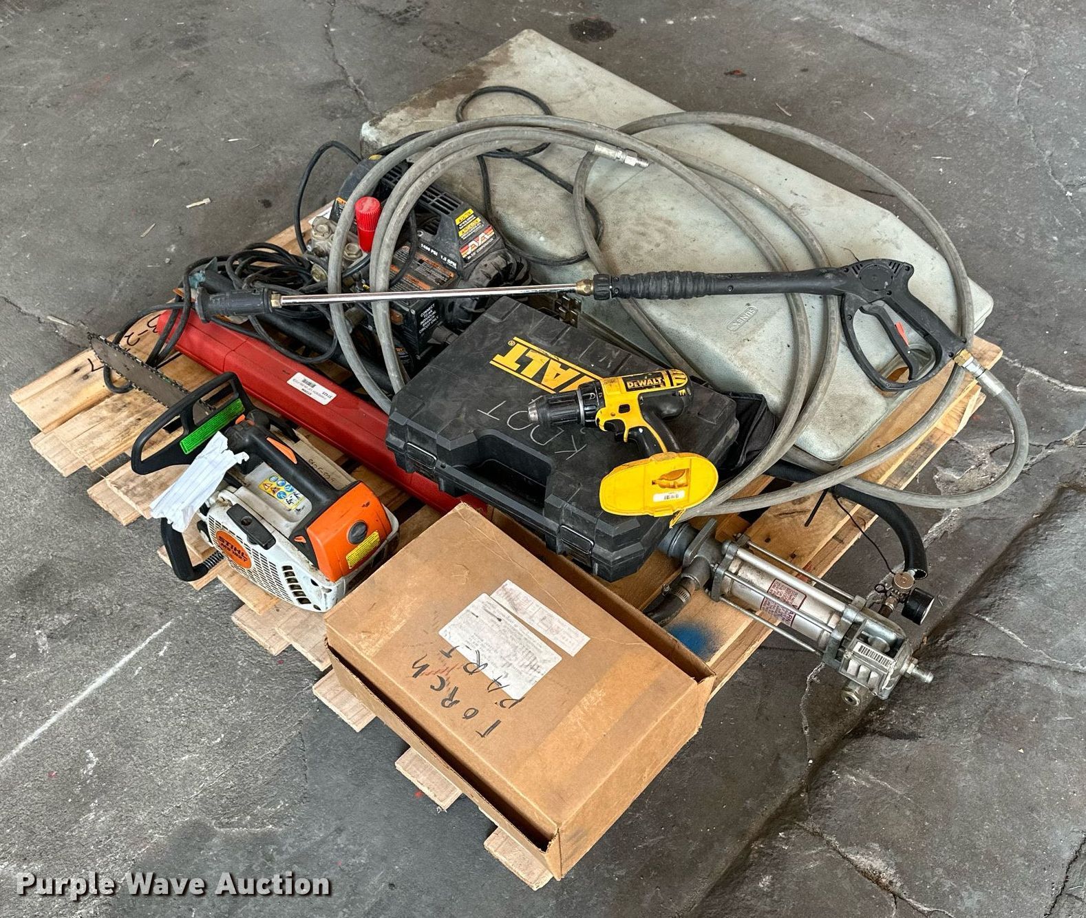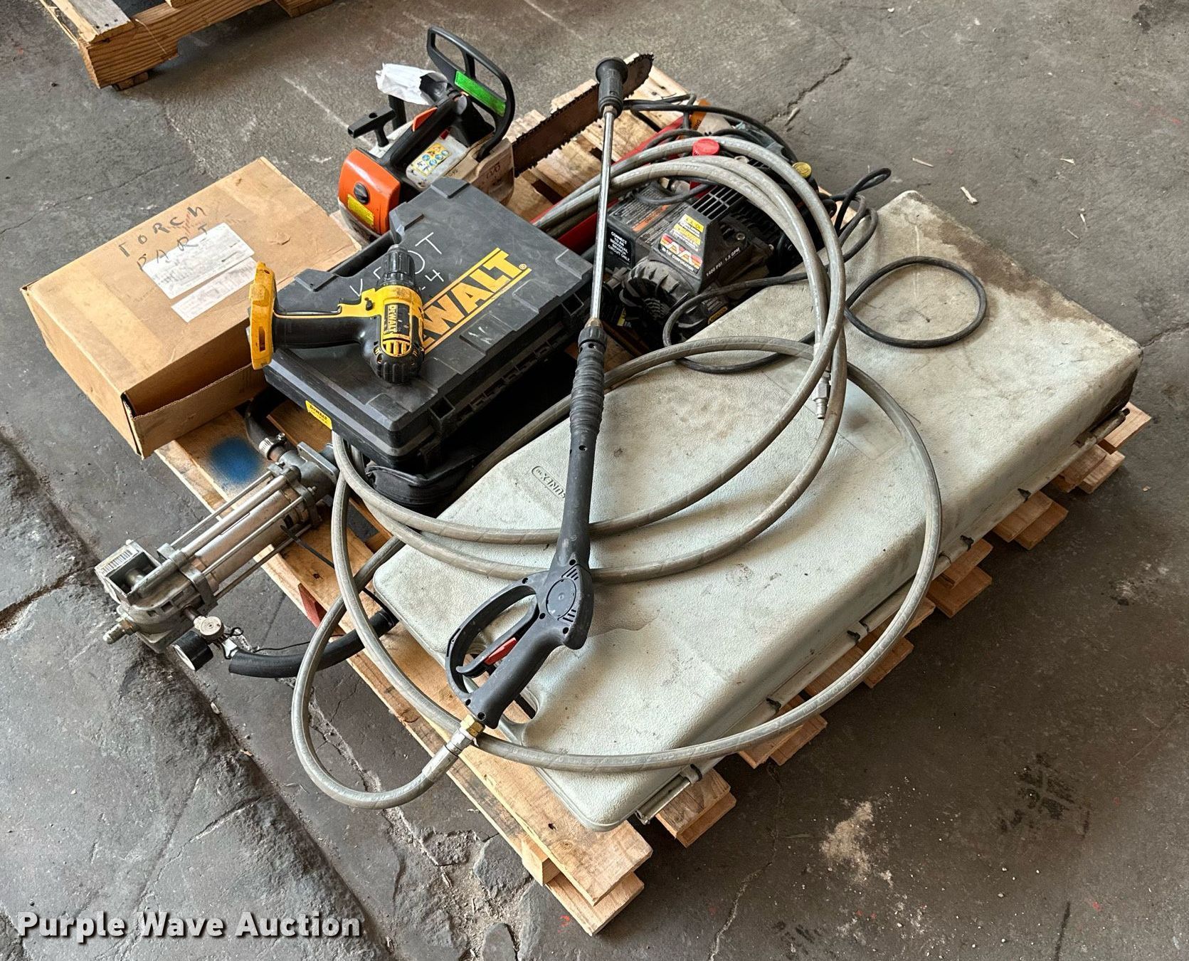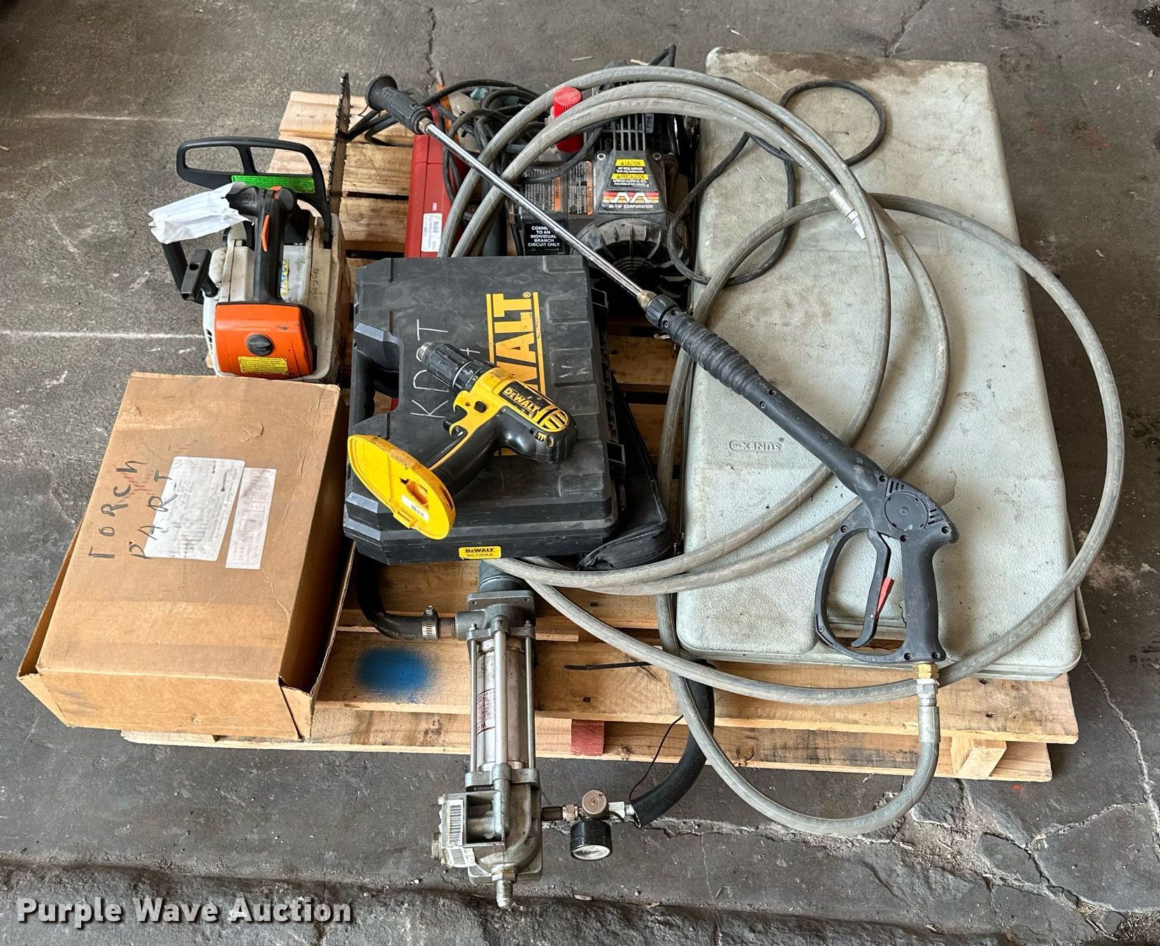 Purple Wave is selling a used Tools in Kansas. This item is a (12) tools with the following: Sunex 4910A Port-A-Jack, Capacity: 10 tons, Mi-T-M pressure washer pump, 110V, PSI: 1,400, GPM: 1.5, Wand, Stihl MS192T chainsaw, Engine issues, scored cylinder head, (2) Dewalt DC720 18V drills, (2) batteries, Non-operational, Battery charger, Torch parts, Acetylene tank, Gauges, Tips, Storm 1/2" torque wrench, 25 ft/lbs to 250 ft/lbs, Setting issues, not accurate, TIF ZX-1 refrigerant leak detector, Lincoln 282396 Bare Stub oil pump, Series B, Serial: 002358, Unknown operating conditions, KDOT ID: 3-2317