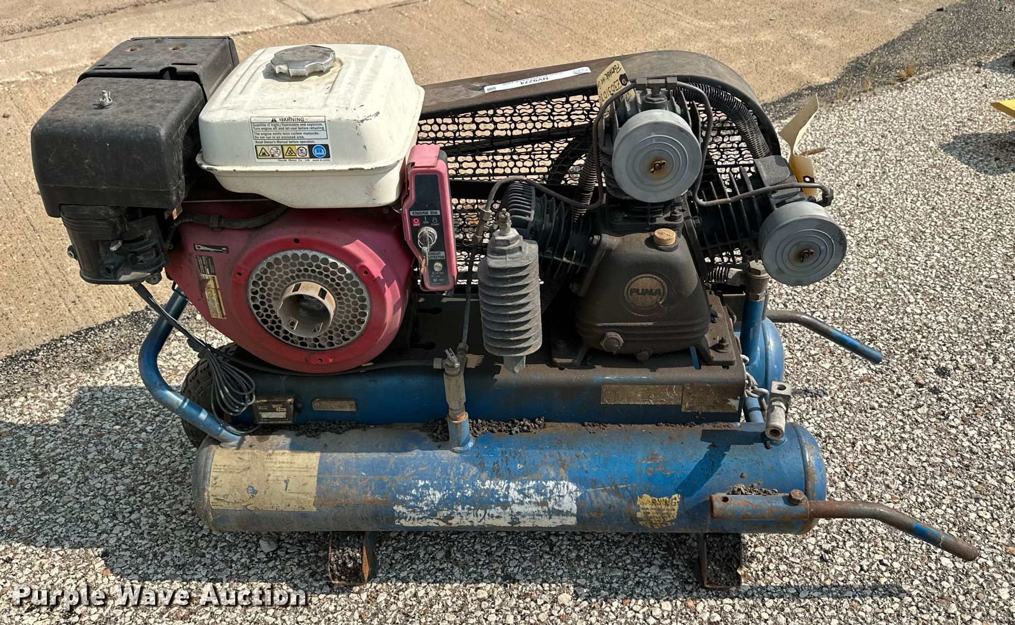 2007 Puma TUE8008GE air compressor. Serial: QA021046, KDOT ID: 23031030. Engine Honda GX240, Cylinders: 1, Fuel type: Gas, HP: 8. Features Tank capacity: 16 gallons. Notes Recoil start assembly missing, Starting issues, Pump issues, low compression, Non-operational unit. Kansas Department of Transportation - Salina Shop. 1006 North 3rd. Salina, KS 67401