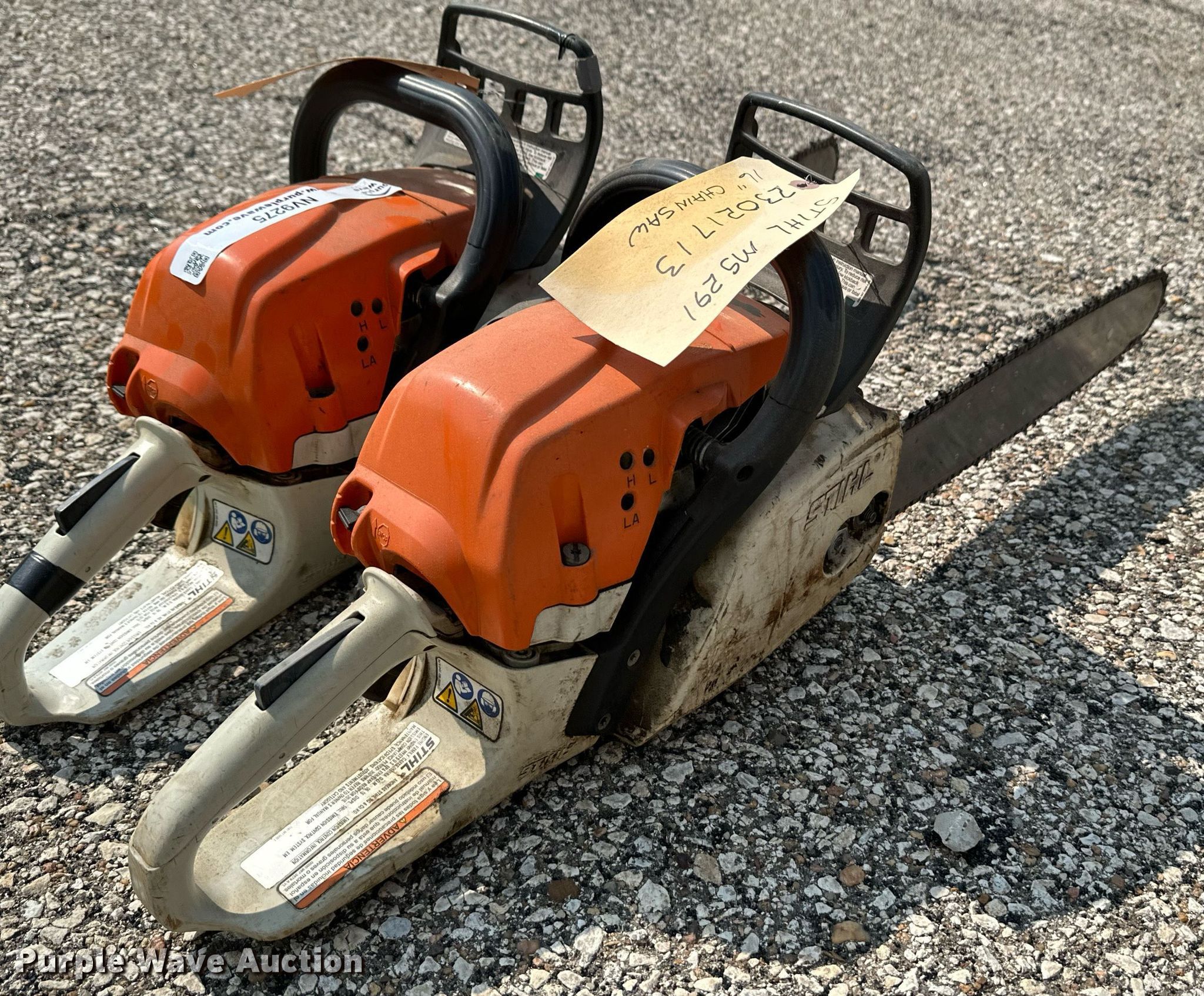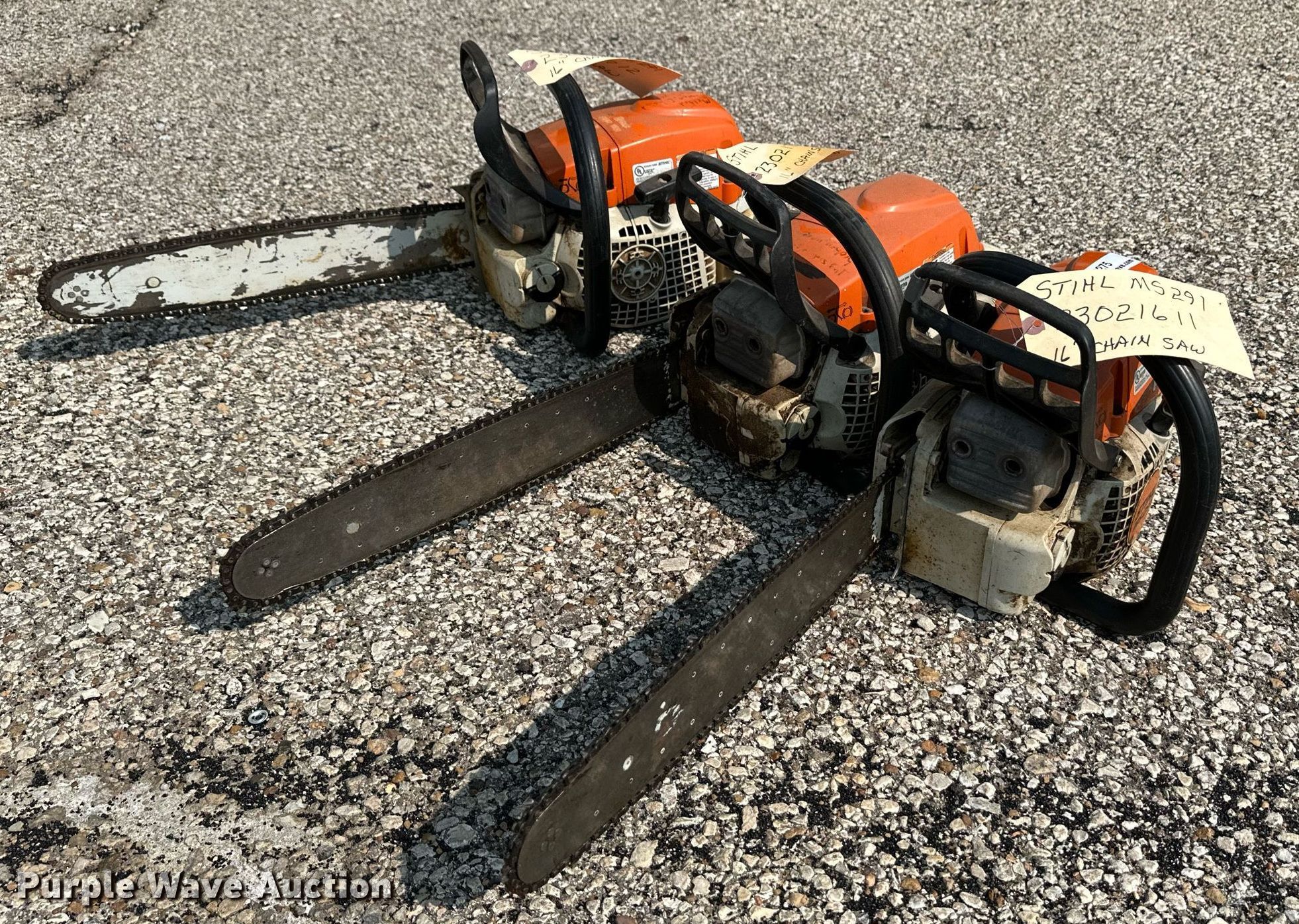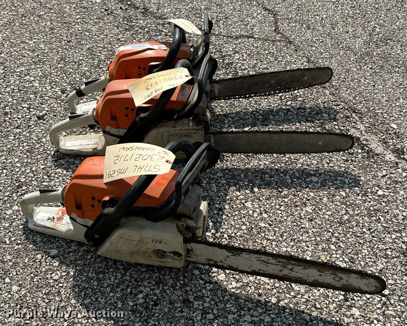 Purple Wave is selling a used Lawn and Garden in Kansas. This item is a (3) Stihl MS291 chainsaws with the following: 16" bars, Parts missing, Unknown operating conditions, KDOT ID: 23021611, 23021612, 23021713