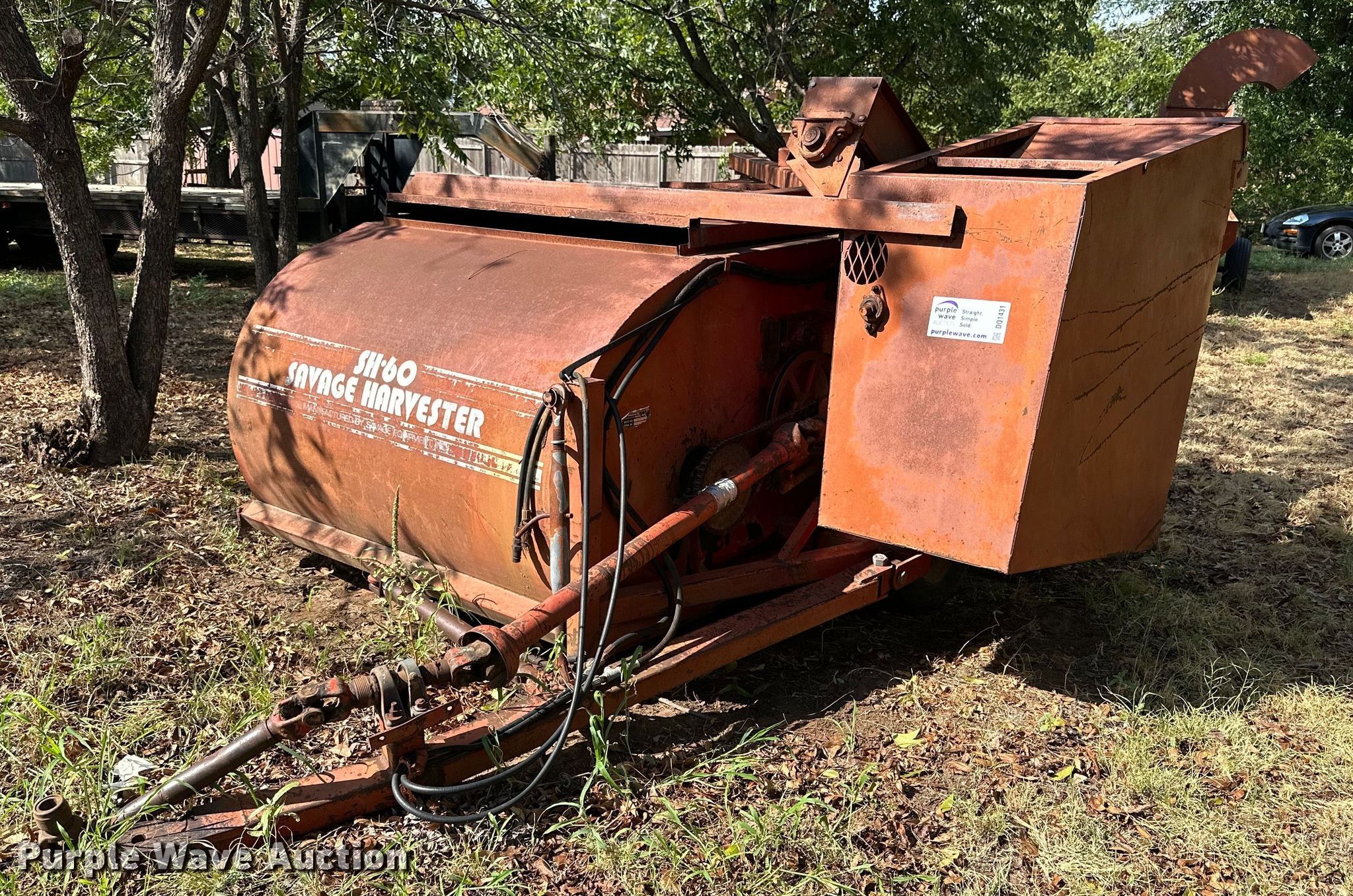 Savage SH60 pecan harvester. Serial: 608099. Features Rubber fingers, Pickup width: 60", PTO: 540 , Auger diameter: 6". Tires Size: 26x12.00-12. Vernon, TX 76384