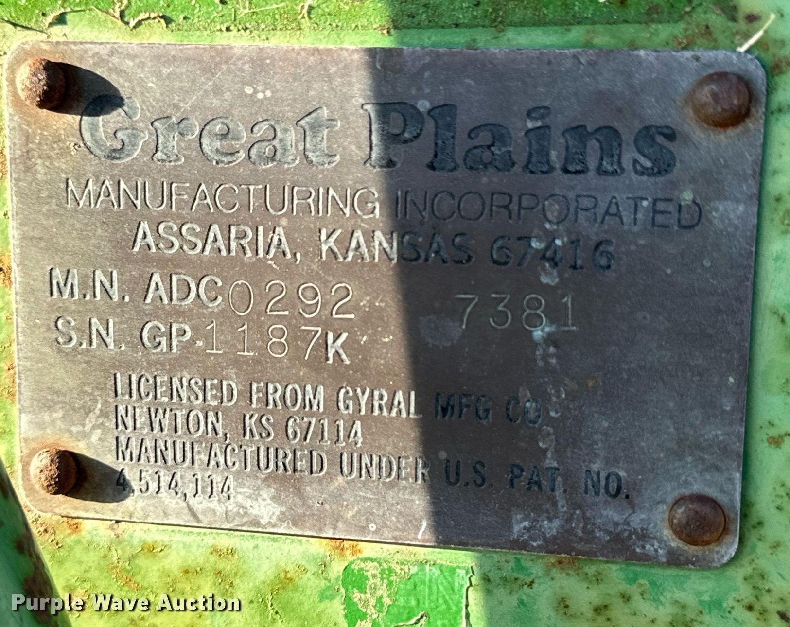 Great Plains air seeder. Width: 45', Row units: 54, Row spacing: 10", Serial: GP1187K. Features Seed delivery Bulk fill system, Air commodity cart Great Plains 0292, Serial: GP1187K, Capacity: 250 bushels, Row units Meter drive: Ground, Down pressure: Hydraulic, Closing system: Single Type: Cast, Electronics Monitor Great Plains 241000 R0.. Tires Transport tire size: 19.5L-15 Quantity: 8, Drive/ outside tire size: 9.5L-15 Quantity: 6, Commodity cart: 16.5L-16. Otis, KS 67565