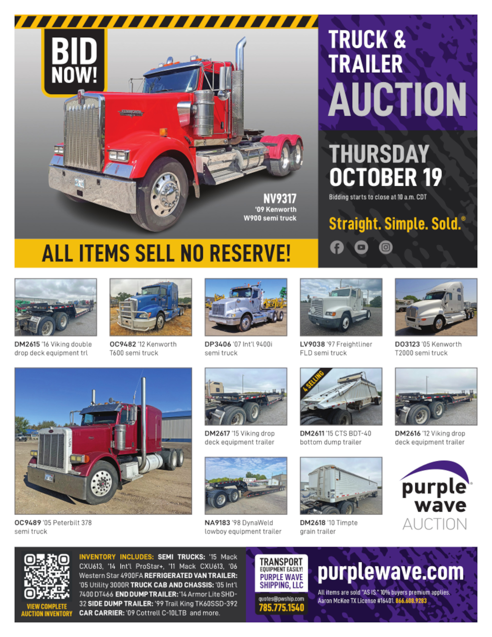 Purple Wave Shipping, LLC provides shipping and transportation services to winning bidders on ag, construction and fleet type assets. Purple Wave Shipping, LLC does not provide shipping on items weighing less than 1,000 pounds.