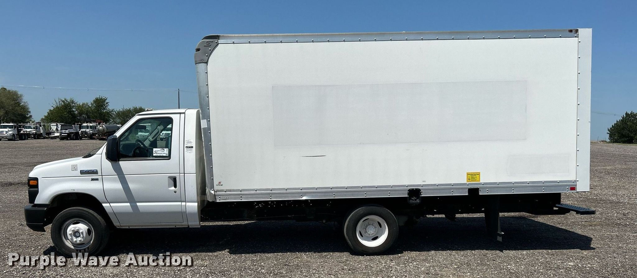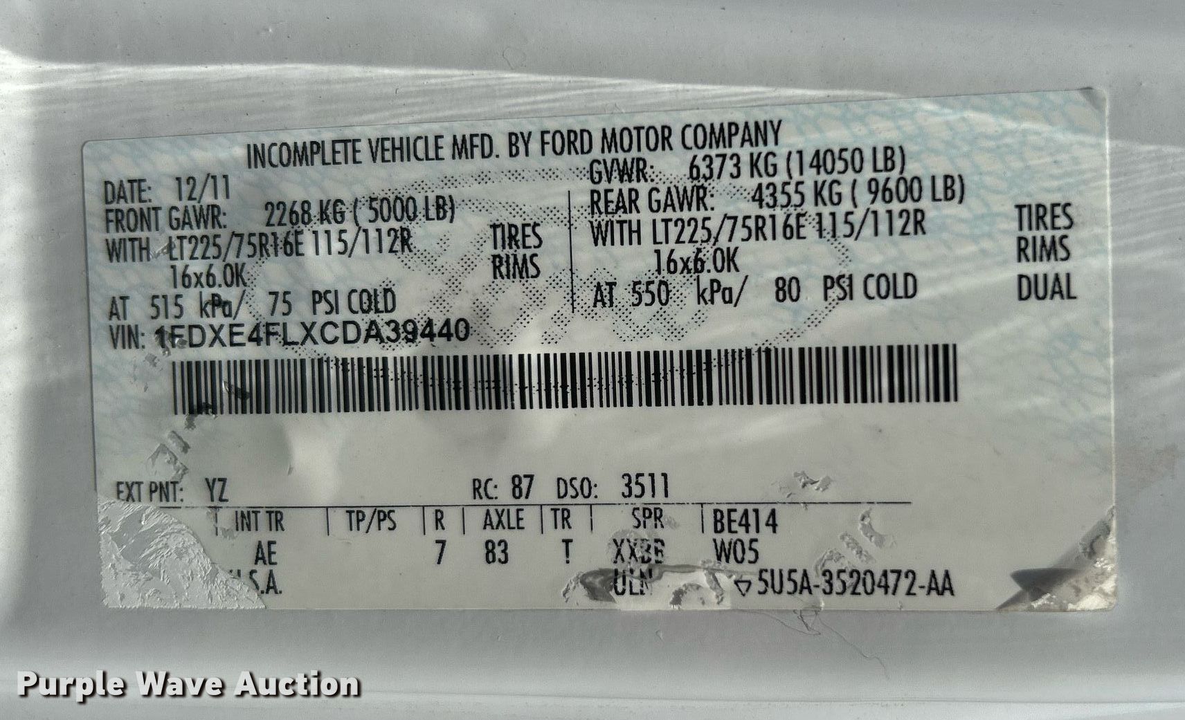 2012 Ford E450 Super Duty box truck. Miles: 68,355 on odometer, VIN: 1FDXE4FLXCDA39440. Engine Displacement: 5.4L V8 SOHC 16V, Cylinders: 8, Fuel type: Gas. Transmission Automatic. Chassis Axles: Single, Suspension: Spring, Brakes: Hydraulic, GVWR: 14,050 lbs, Wheelbase: 160". Interior AC, Heat. Operational Box bed Supreme Fleet 16, Serial: L0500780, 17' L x 96" W x 84" H, Floor: Wood, Slider ramp Width: 26".. Tires Size: 225/75R16. Notes Front bed corners damaged, Passenger side mirror cracked, Catalytic converter missing. Texas title. Title distribution may be delayed up to 30 days from verification of funds. 15107 North 137th East Avenue. Collinsville, OK 74021
