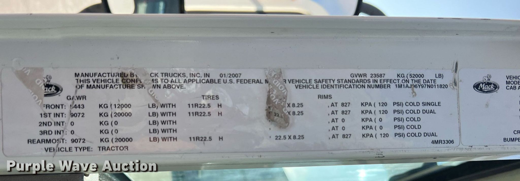 Purple Wave is selling a used Truck Tractor in Missouri. This item is a 2007 Mack CHN613 semi truck with the following: Miles: 747,999 on odometer, Hours: 28,167 on meter, VIN: 1M1AJ06Y97NO11820