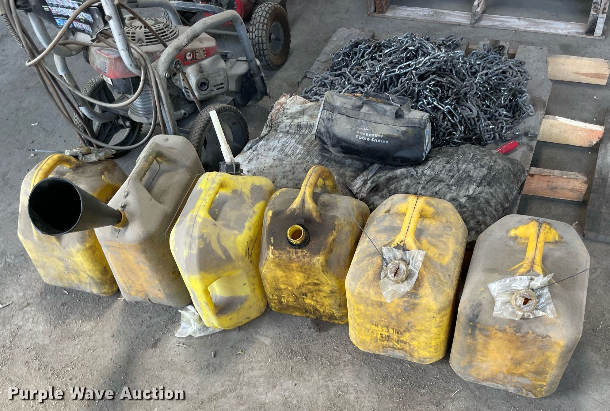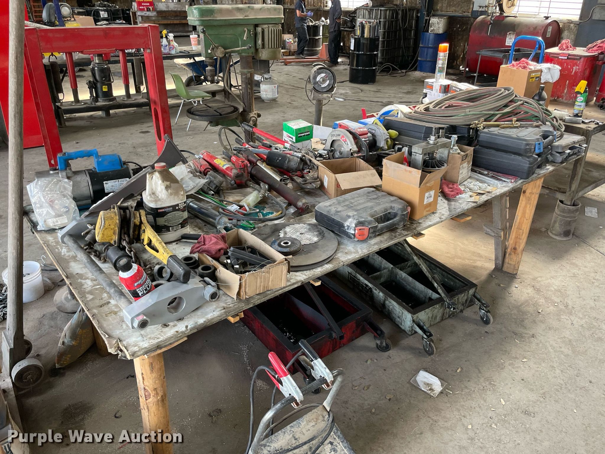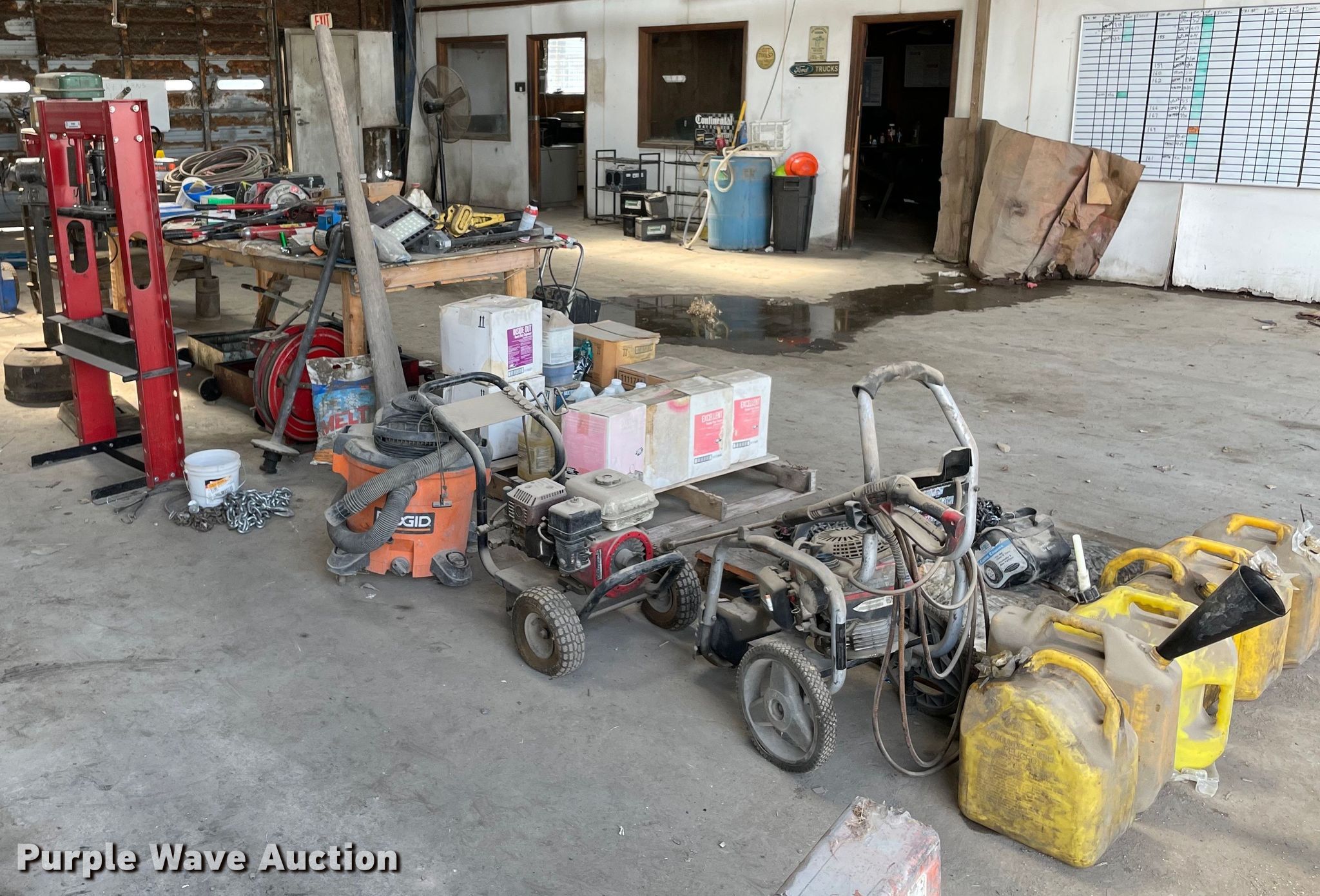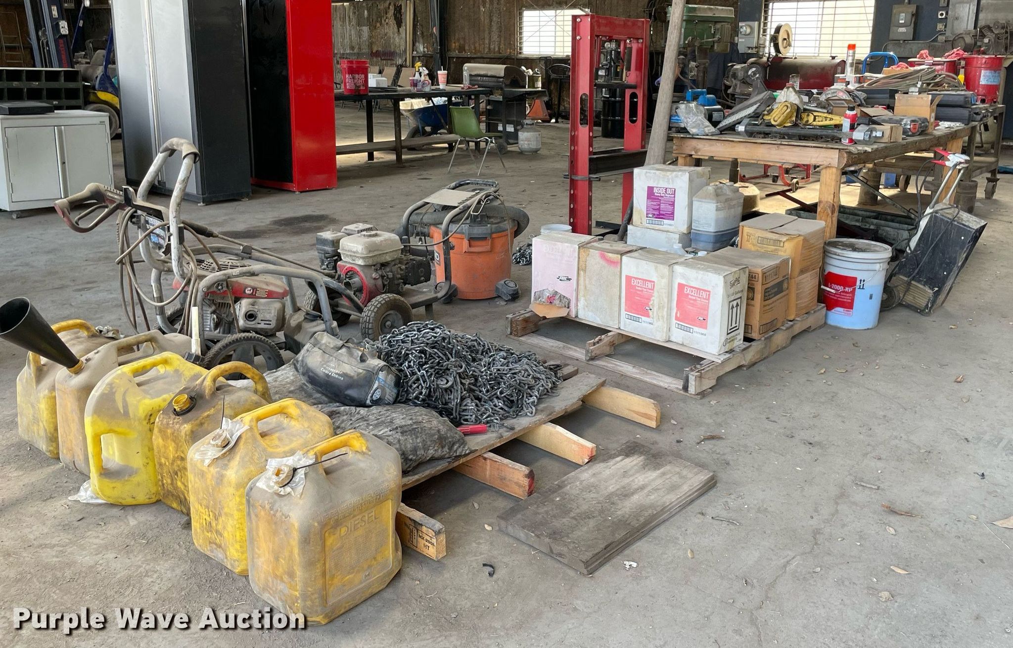 Purple Wave is selling a used Tools in Texas. This item is a Tools with the following: Tire Chains, (6) fuel cans, (2) oil catch wagon, Napa battery charger, (2) lube guns, (2) circular saws, Cutting torch and hoses, 6" bench grinder, Central Machinery drill press, 16 speed, 20 ton pipe bender, Ridgid shop vacuum, (2) pressure washers, Gas engines