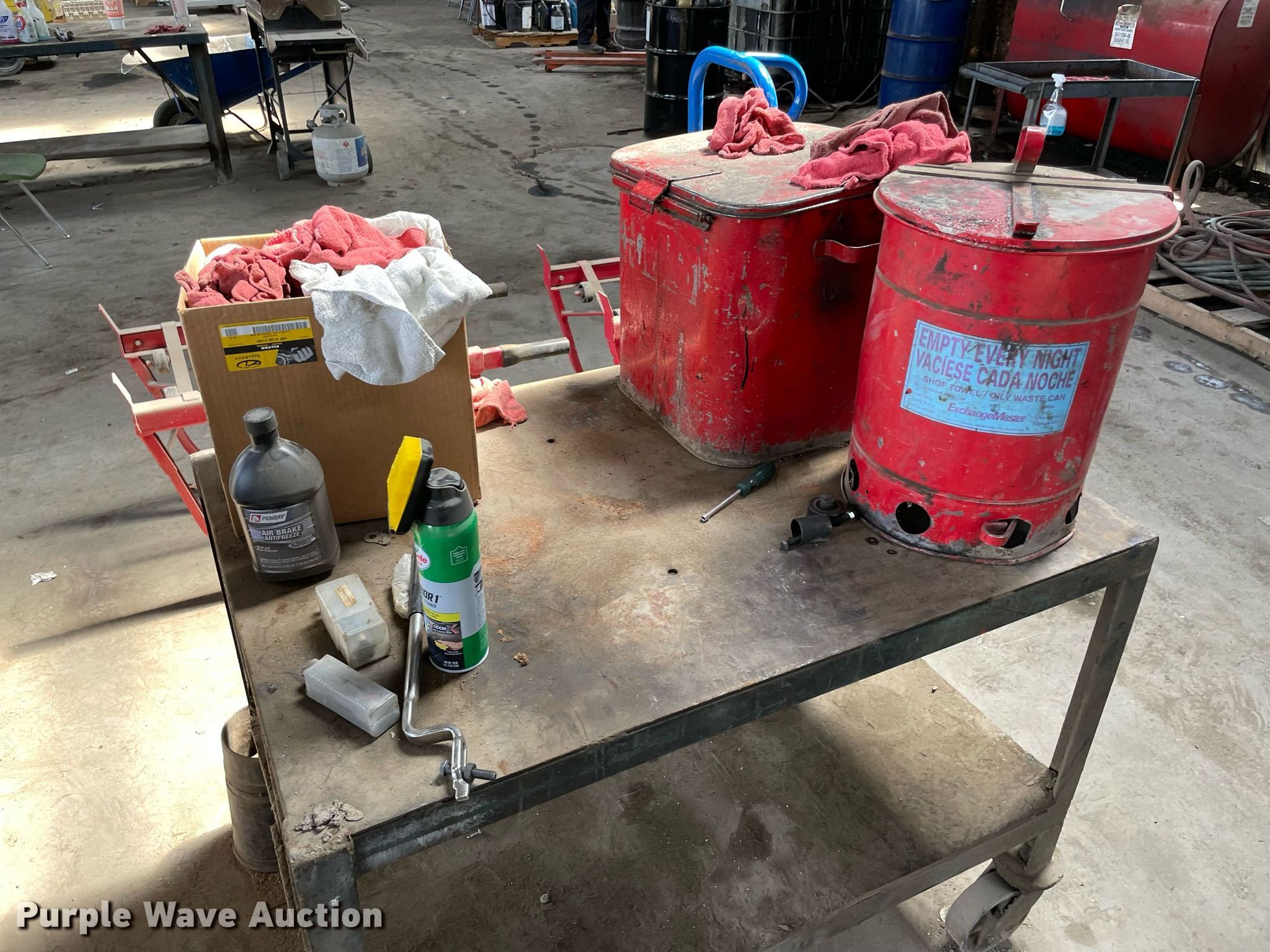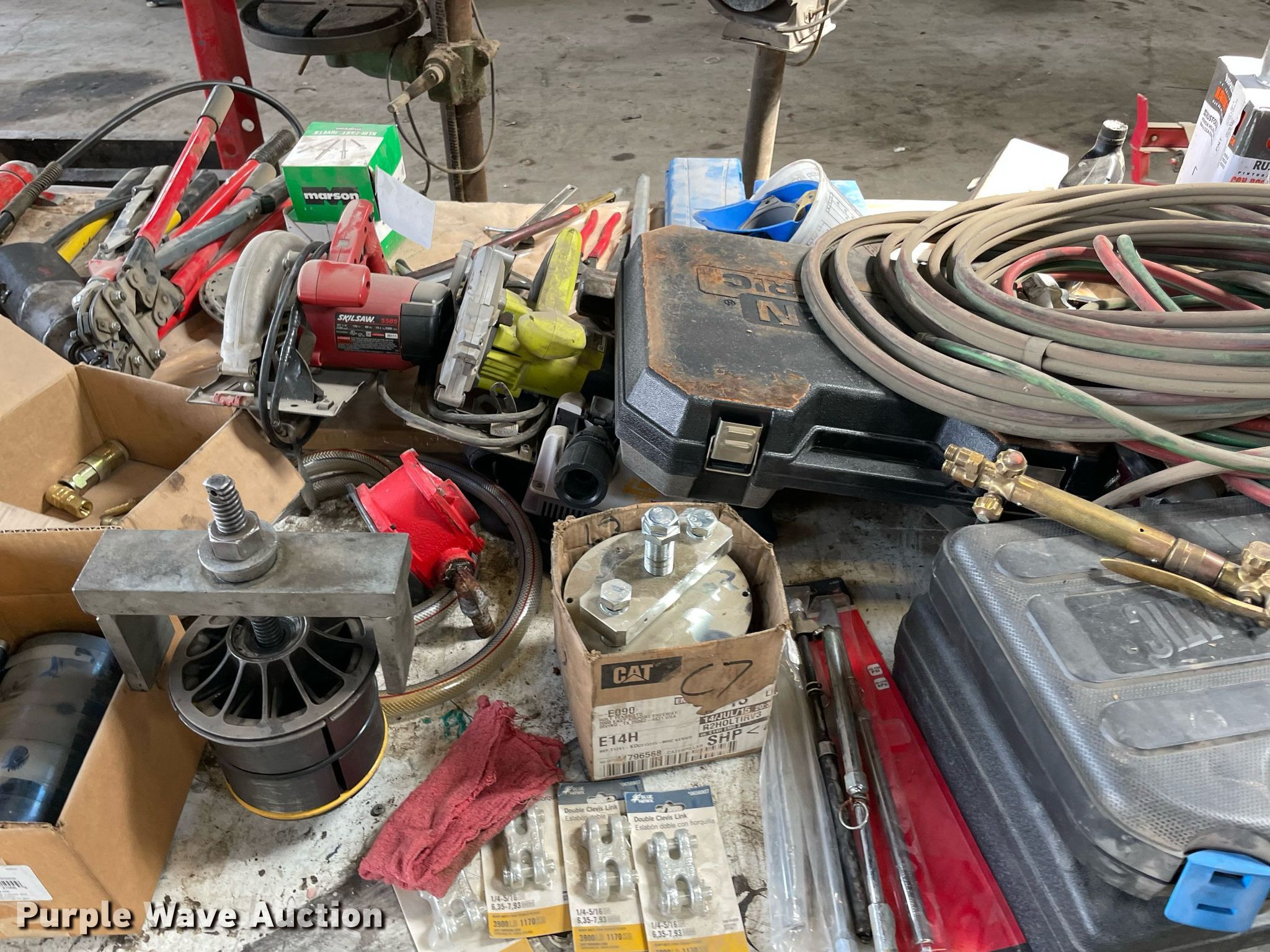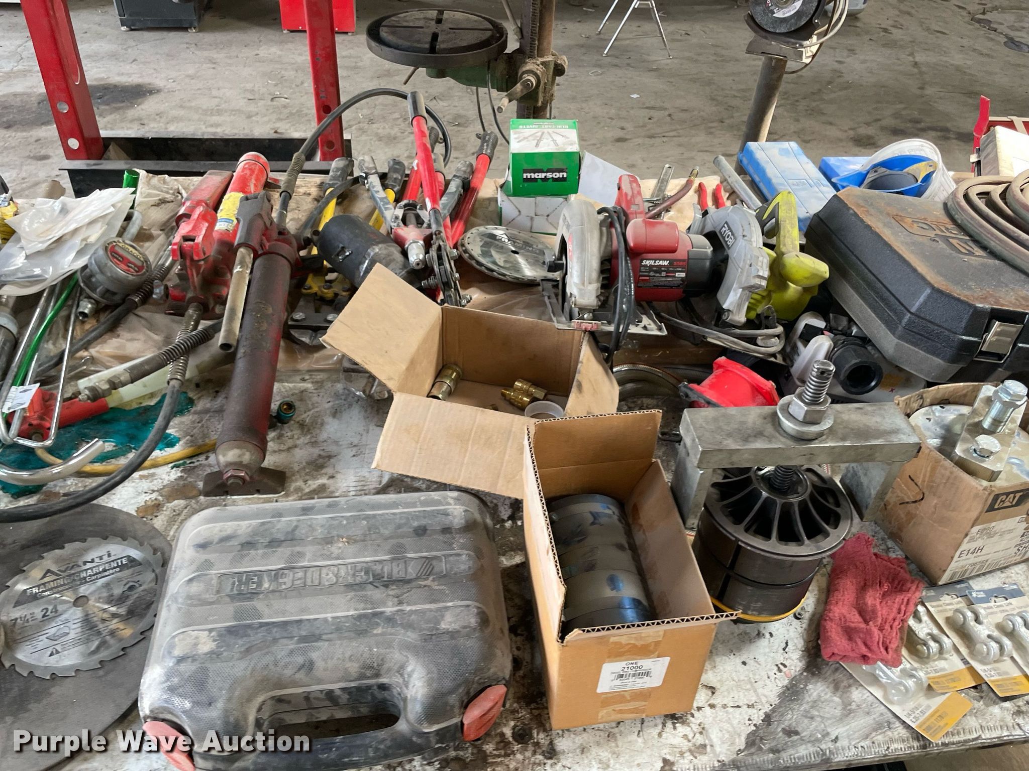 Purple Wave is selling a used Tools in Texas. This item is a Tools with the following: Tire Chains, (6) fuel cans, (2) oil catch wagon, Napa battery charger, (2) lube guns, (2) circular saws, Cutting torch and hoses, 6" bench grinder, Central Machinery drill press, 16 speed, 20 ton pipe bender, Ridgid shop vacuum, (2) pressure washers, Gas engines