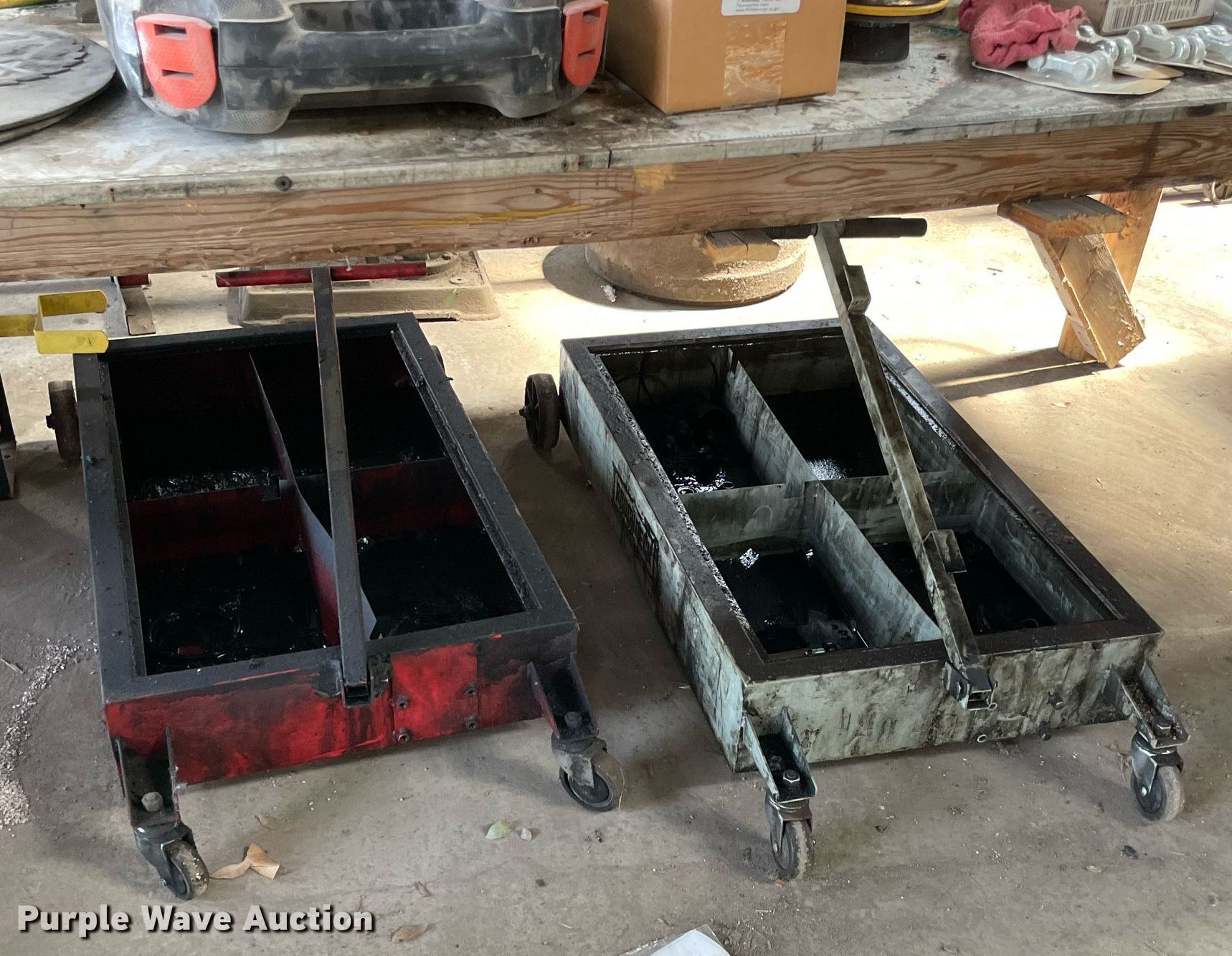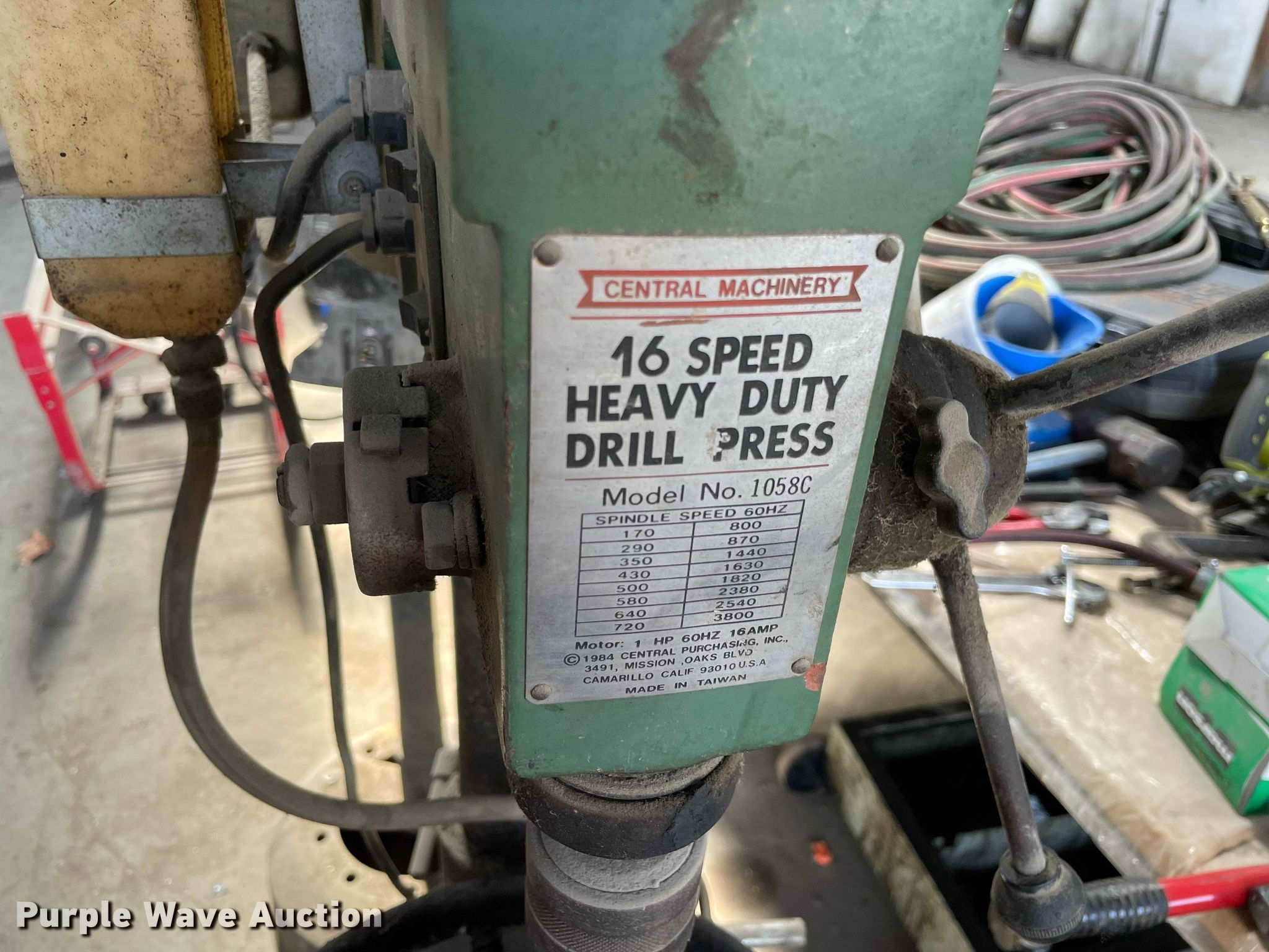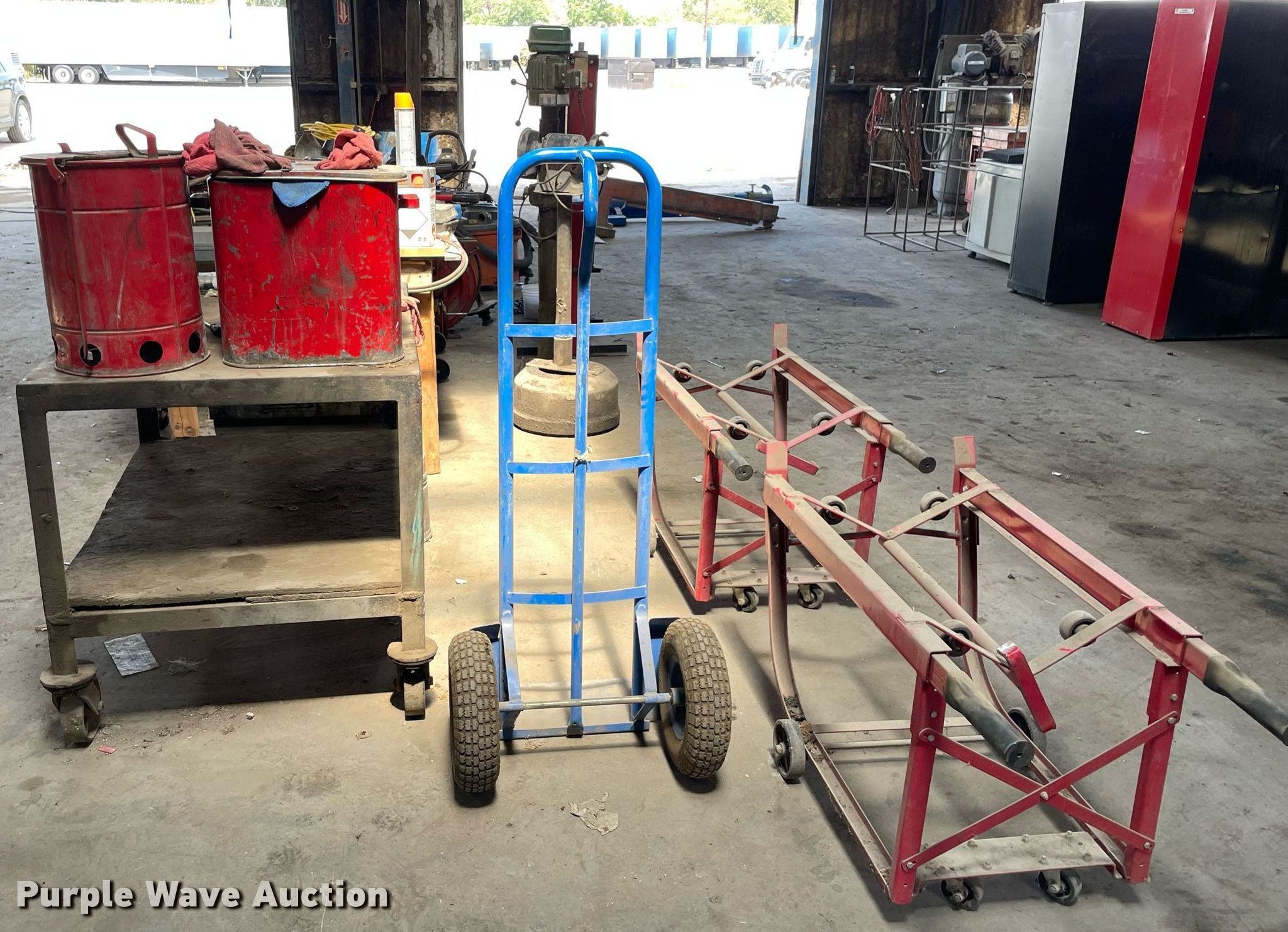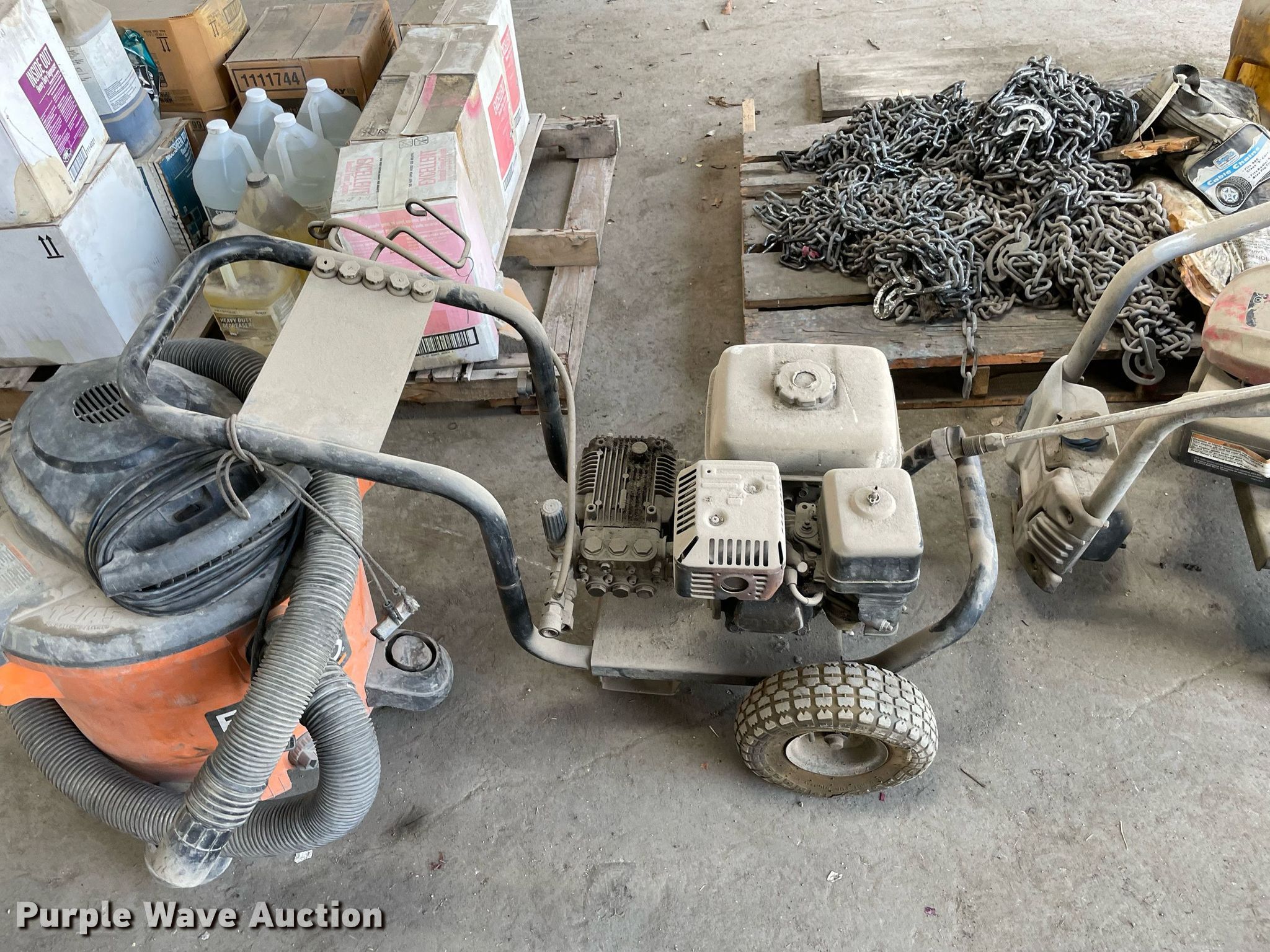 Purple Wave is selling a used Tools in Texas. This item is a Tools with the following: Tire Chains, (6) fuel cans, (2) oil catch wagon, Napa battery charger, (2) lube guns, (2) circular saws, Cutting torch and hoses, 6" bench grinder, Central Machinery drill press, 16 speed, 20 ton pipe bender, Ridgid shop vacuum, (2) pressure washers, Gas engines