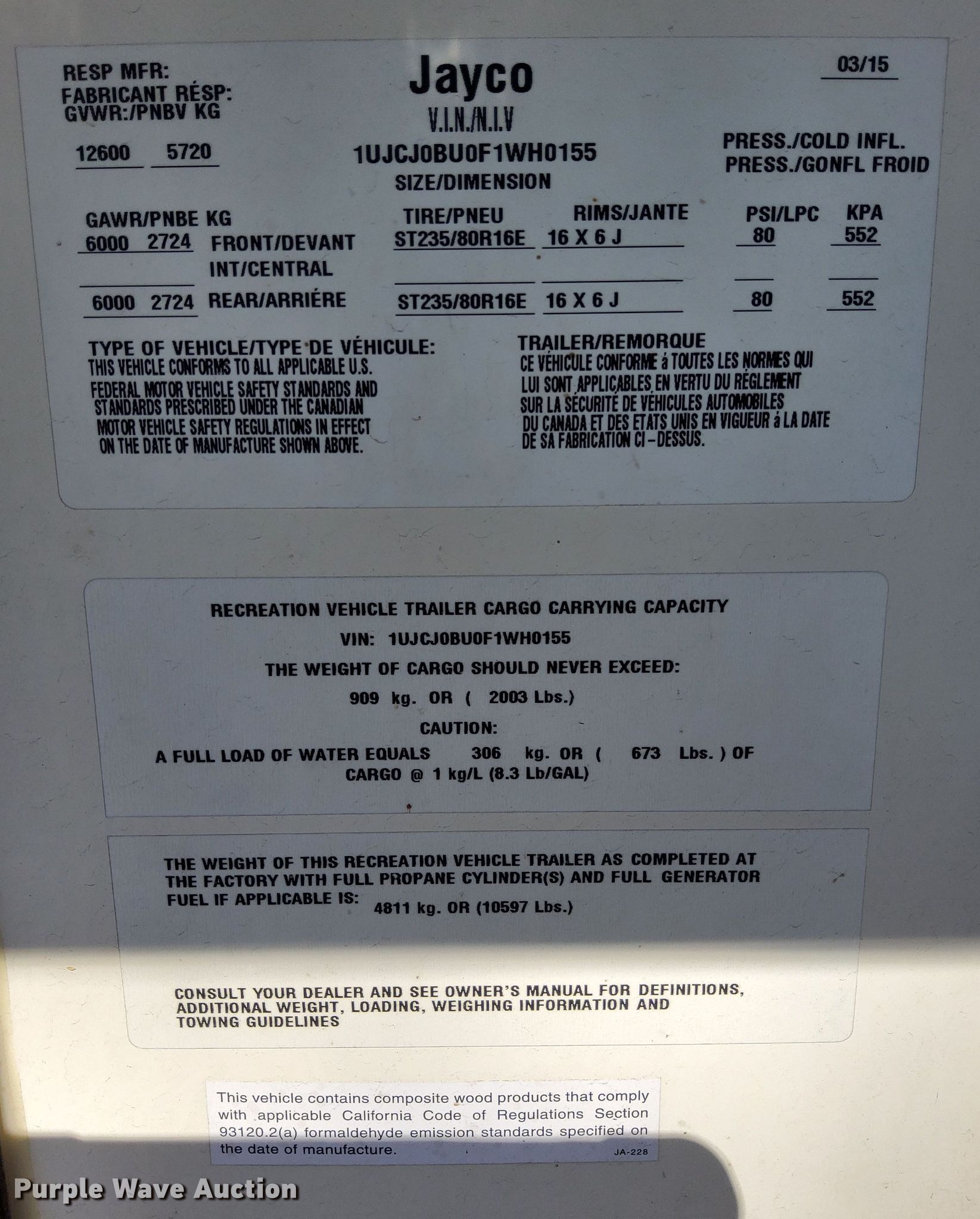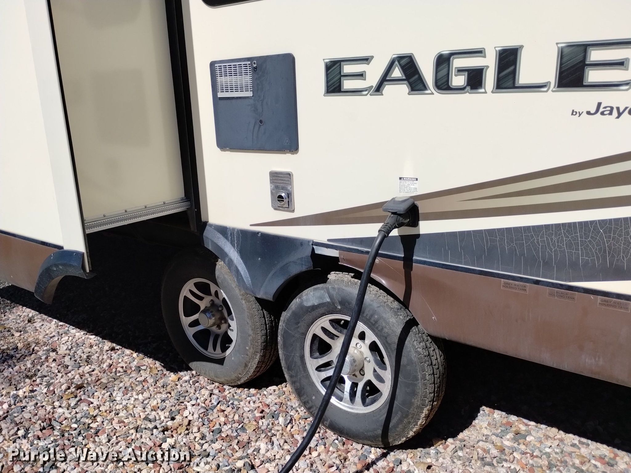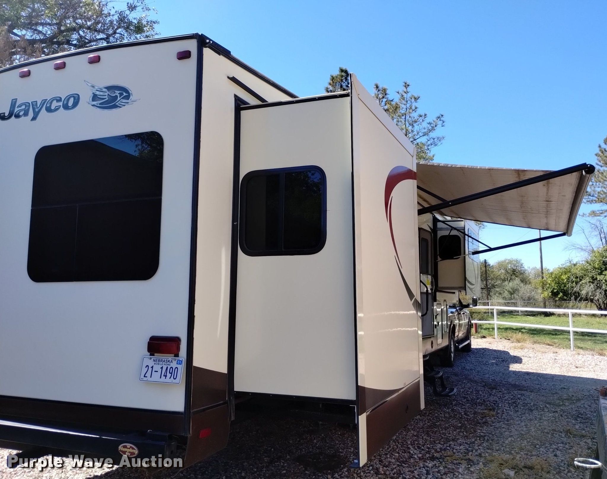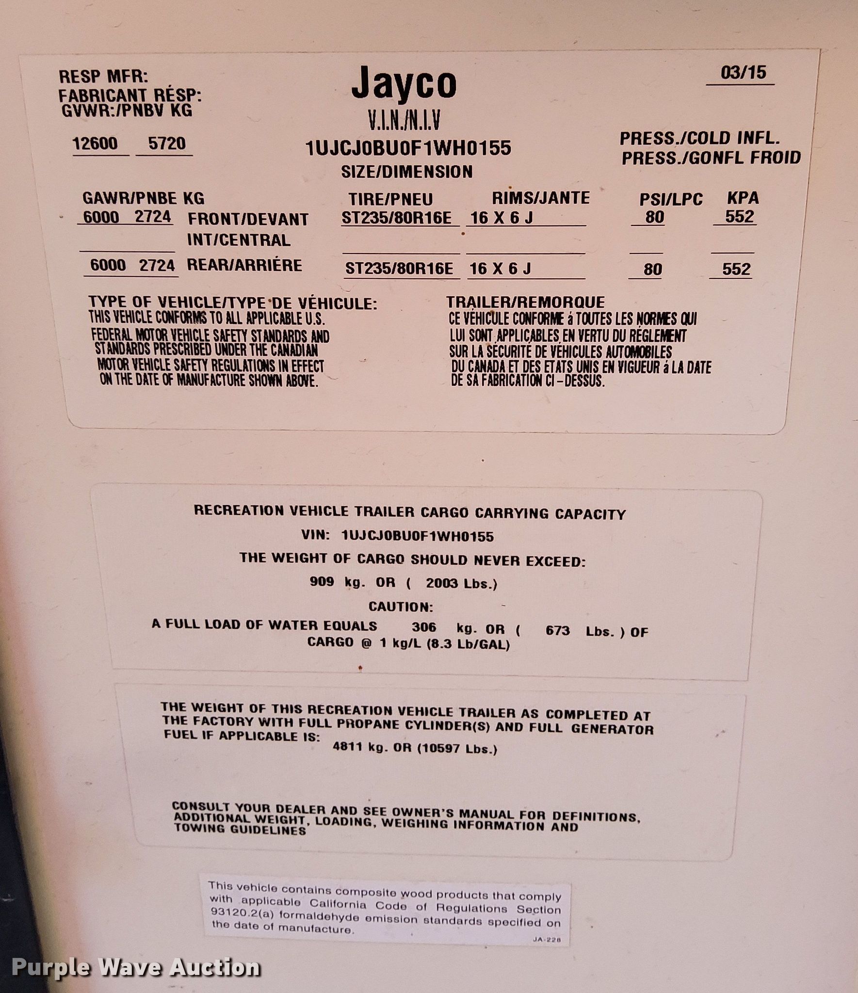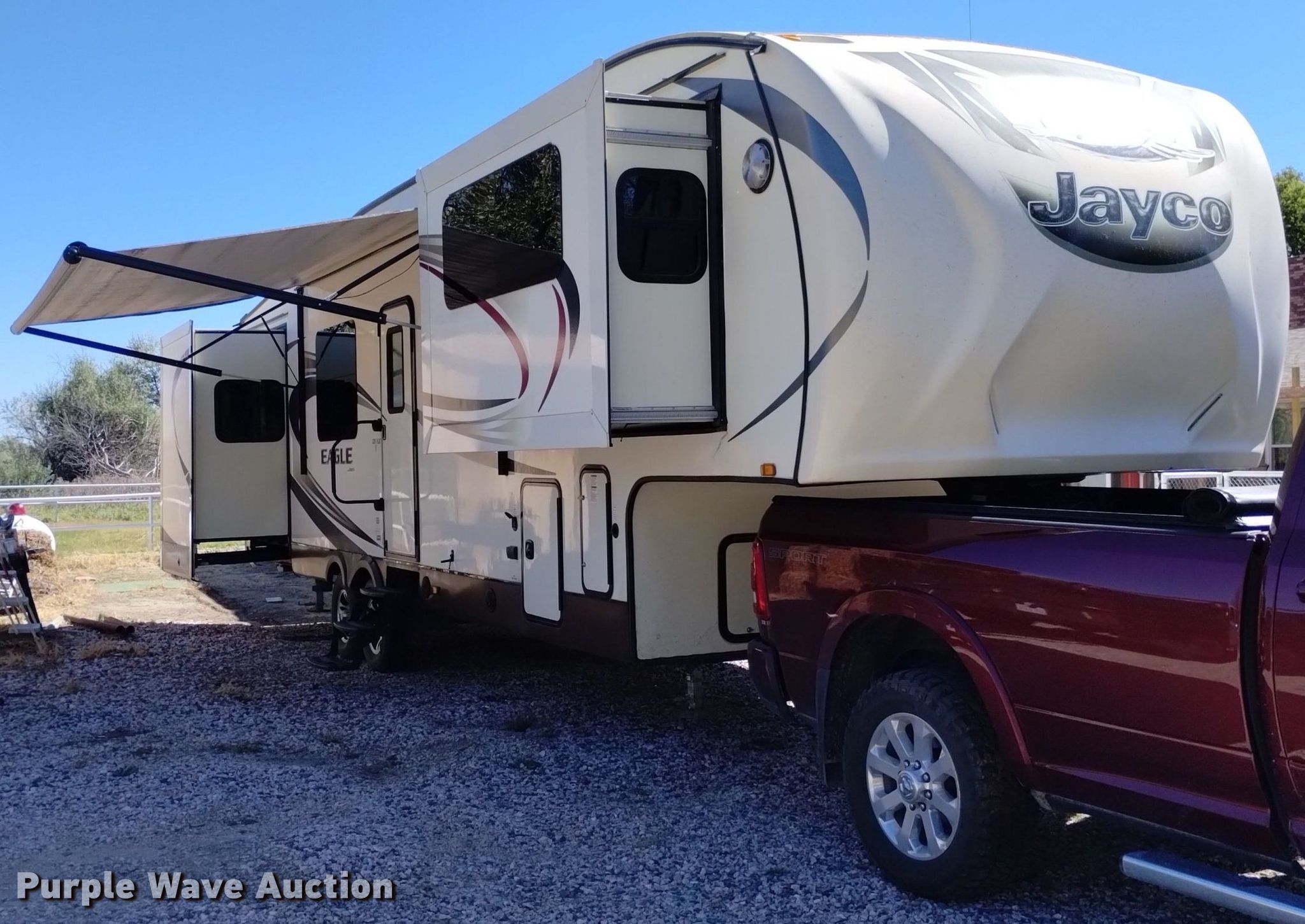 2015 Jayco Eagle camper. Camper length: 40', VIN: 1UJCJ0BU0F1WH0155. Chassis Axles: Tandem, Brakes: Electric, GVWR: 12,600 lbs, GAWR: 6,000 lbs. Interior Kitchen: Sink, Refrigerator, Freezer, Microwave, Oven, Stove: Propane, Living room: Table, Couch, Pull out couch, Bathroom, Beds: 1 Bed type: Queen, TVs: 2, Sound system, Heater, AC units: 2. Features Slide outs: 4, Awnings: 1 Awning type: Electric, Auto leveler, Rear hitch. Tires Size: 235/80R16. Notes Contents not included, Truck not included. Nebraska title. Title distribution may be delayed up to 14 days from verification of funds. Morrill, NE 69358