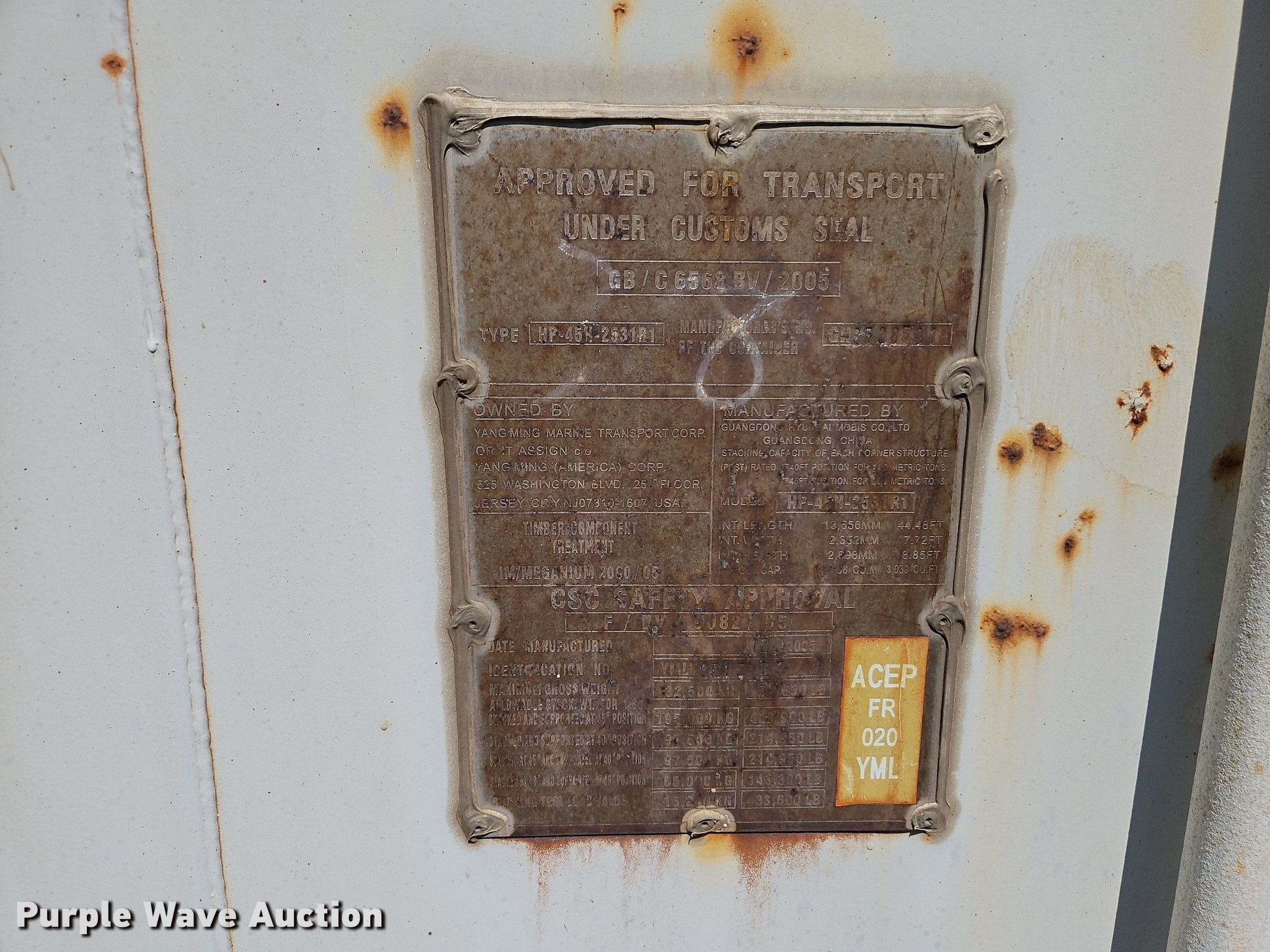 This 2005 Yang Ming HP-45H-2531R1 shipping container will sell to the highest bidder regardless of price.