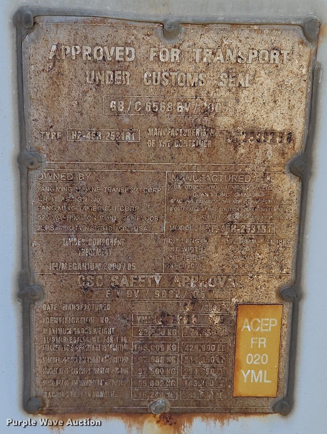 This 2006 Yang Ming HP-45H-2531R1 shipping container will sell to the highest bidder regardless of price.